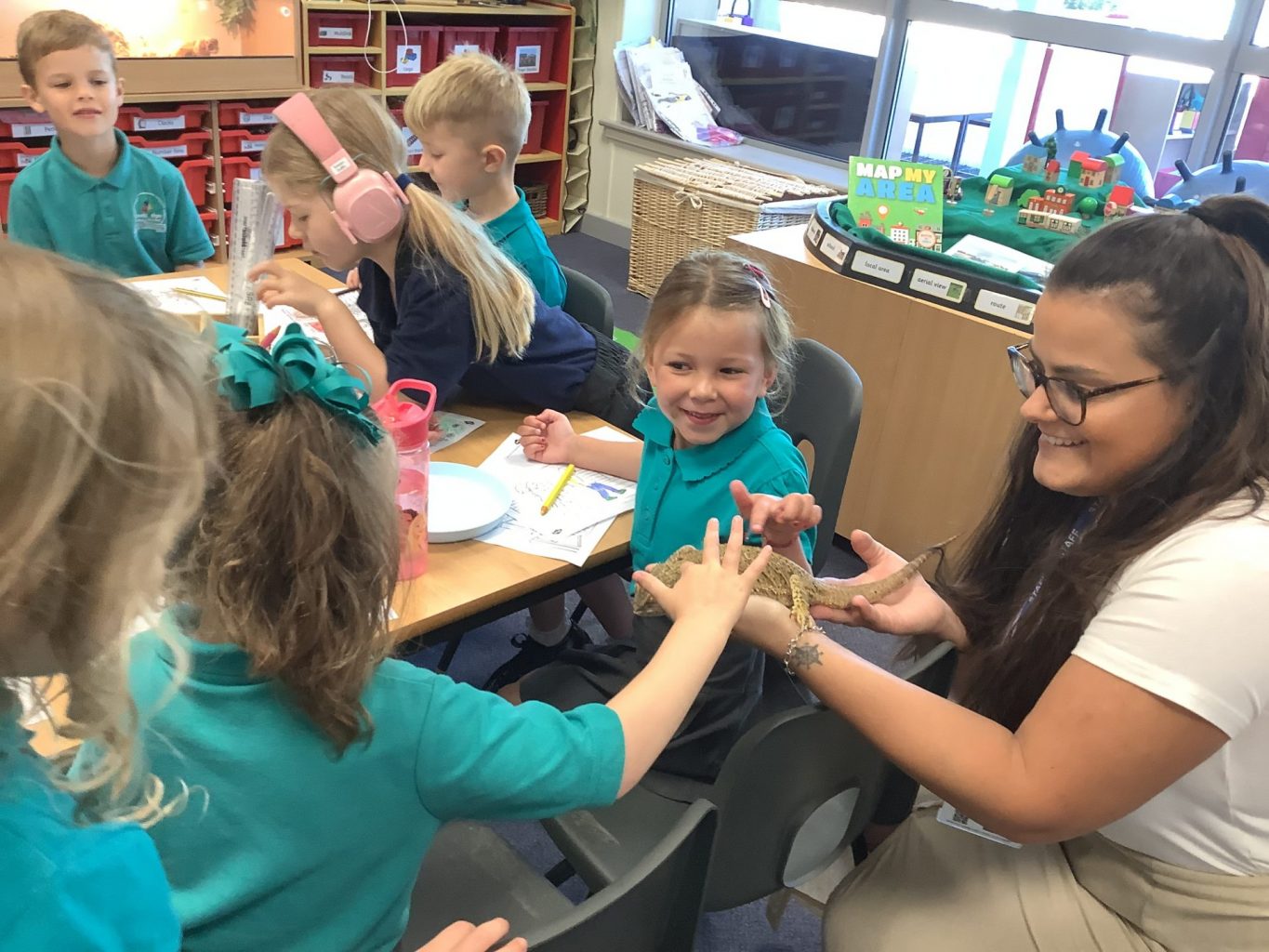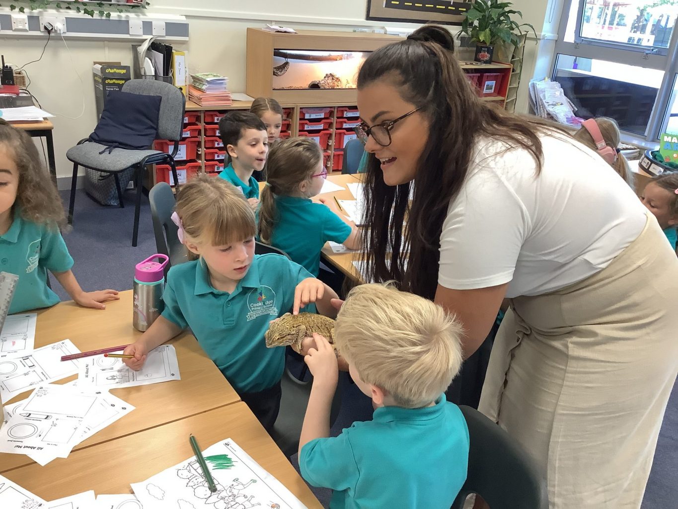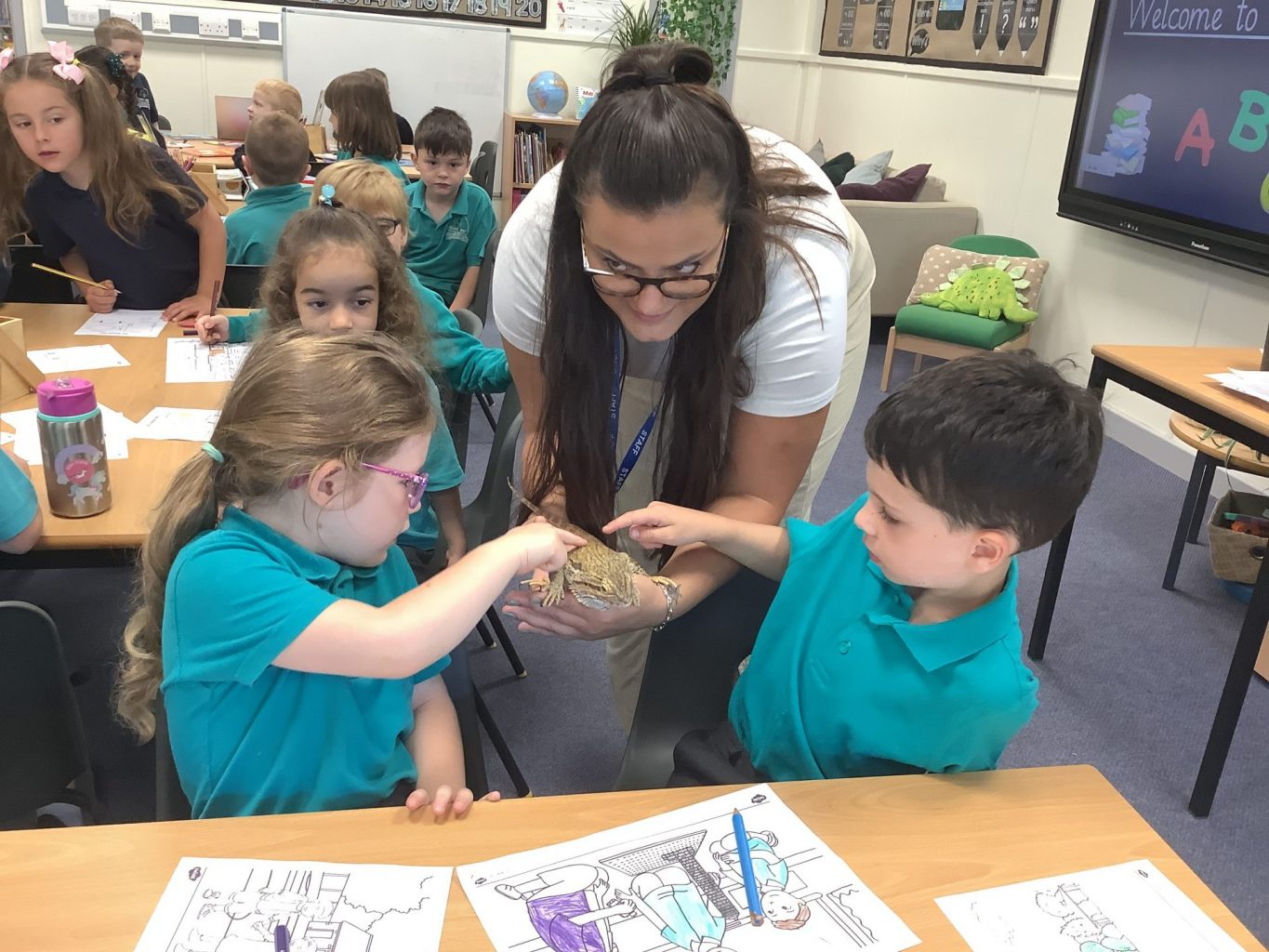 The children have already met Miss Devine and Mrs Harrisson from their transition days. Today they were introduced to two other members of our class. Miss Woolmer is a Redkite student teacher who is with us until Christmas. The other member of our class LIVES at school – His name is Spike, our bearded dragon!