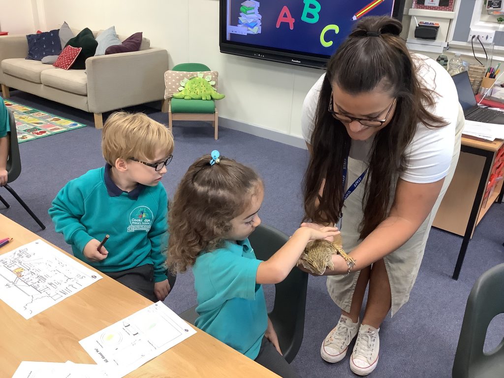 The children have already met Miss Devine and Mrs Harrisson from their transition days. Today they were introduced to two other members of our class.  Miss Woolmer is a Redkite student teacher who is with us until Christmas. The other member of our class LIVES at school – His name is Spike, our bearded dragon!