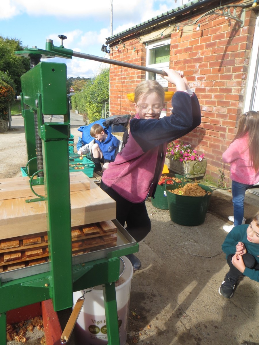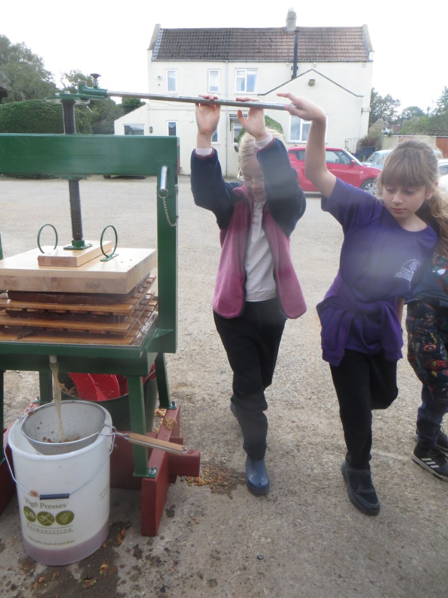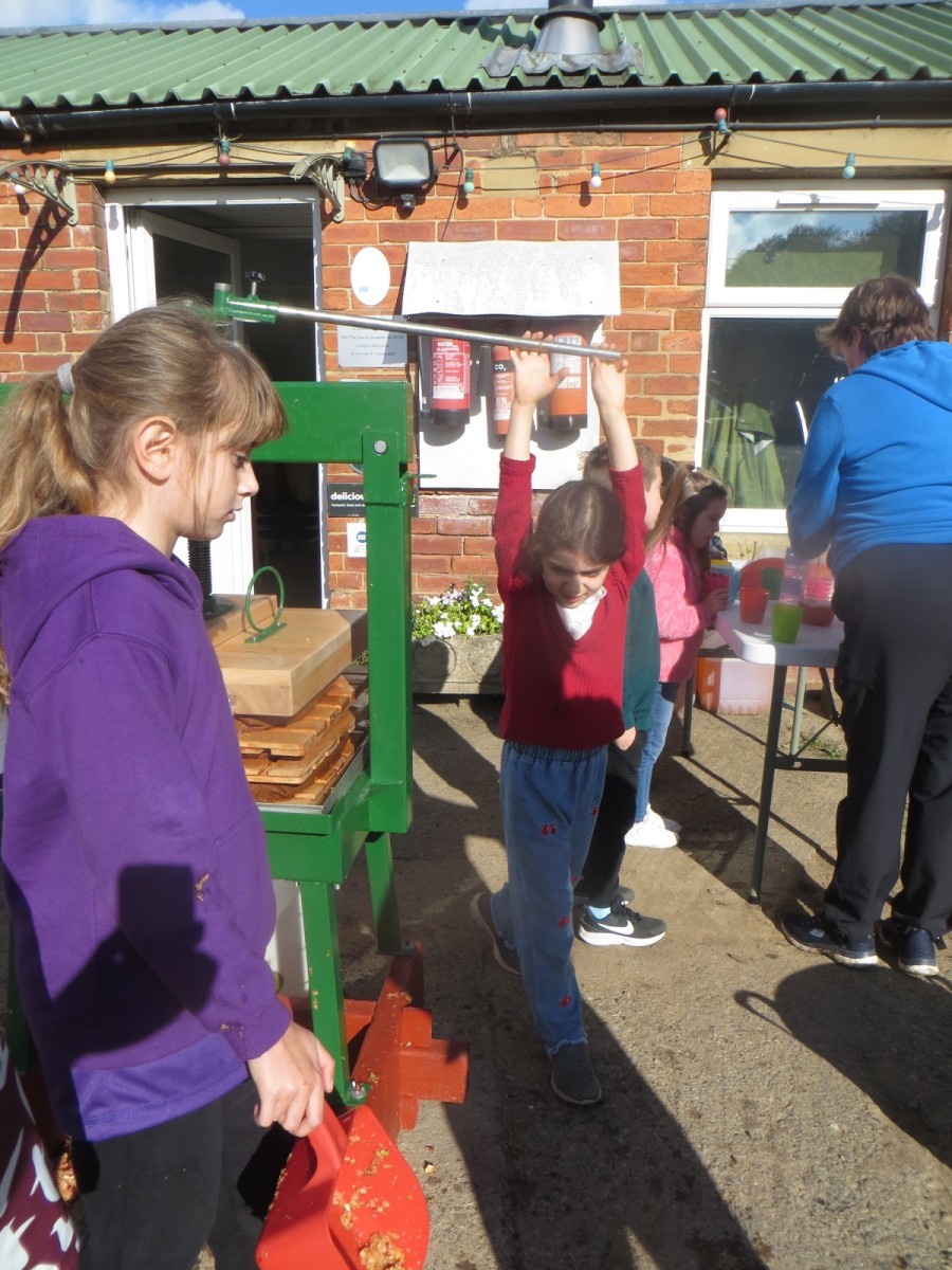 Last week, pupils from Wellbeing Wednesday Forest School visited Lilac Farm in Collingham to mill and press the amazing amount of fruit harvested from our fruit trees here at school alongside the generous donations of apples and pears from parents. The juice has now been pasteurised, bottled and collected and will be available for sale on the main playground at home time on Thursday 2nd October for £3.50 per 750ml bottle. Cash or card payments accepted. The children have been working hard today to design labels, create this webpost and posters to advertise their produce. There are 104 bottles and first come, first served – when it’s gone, it’s gone!