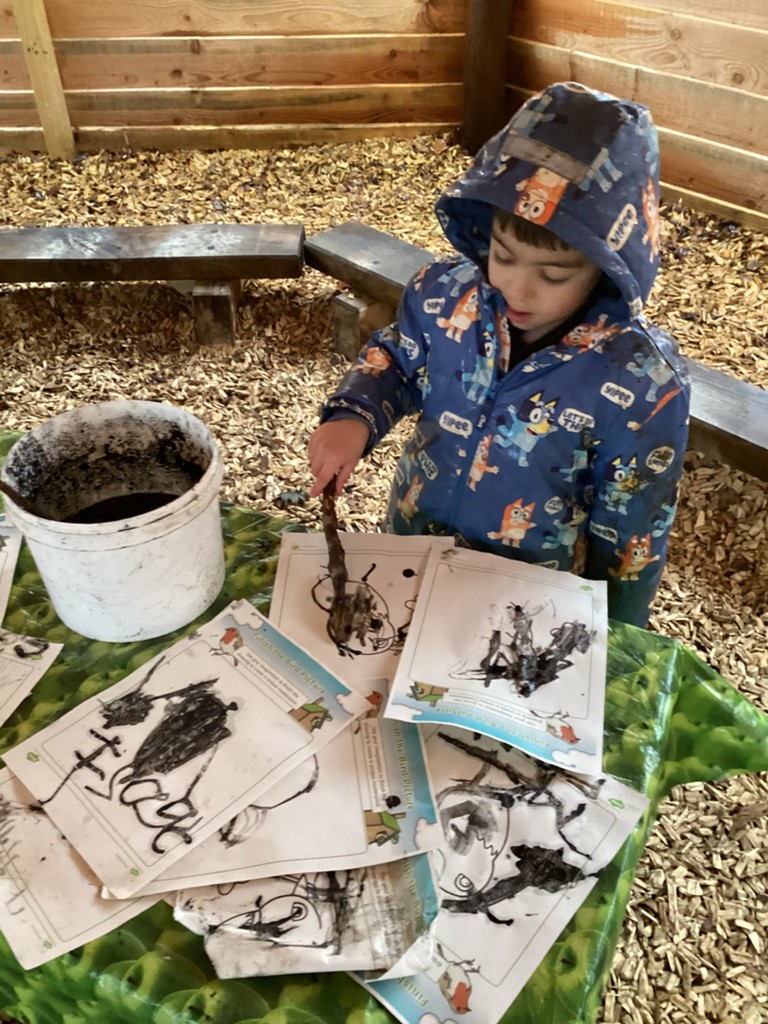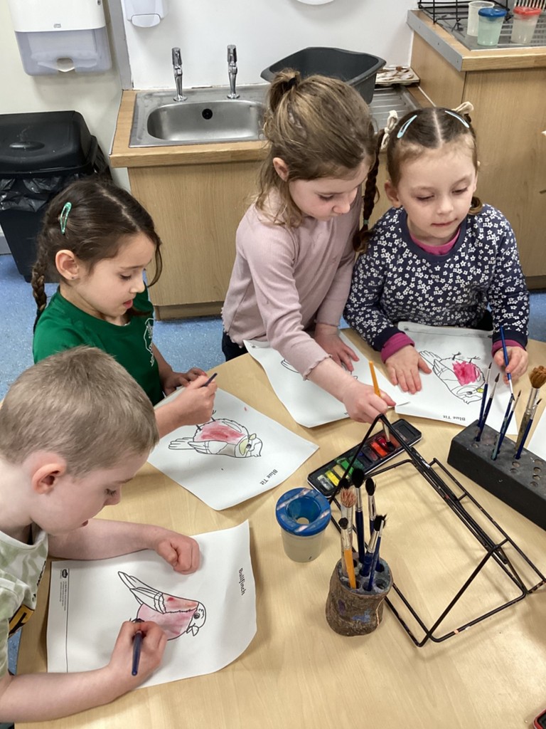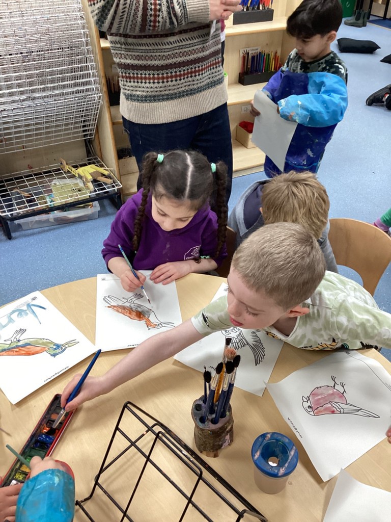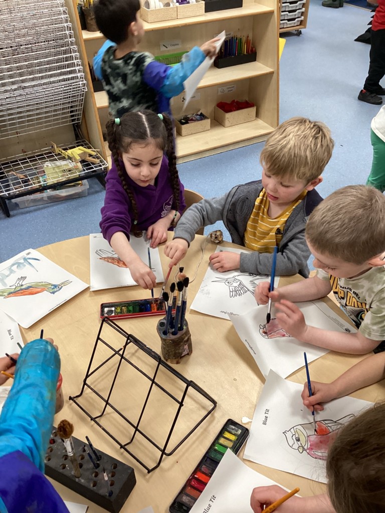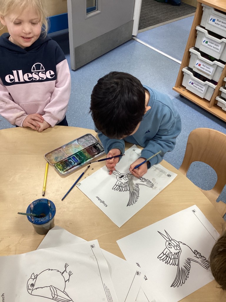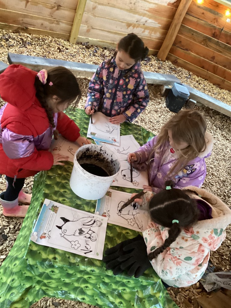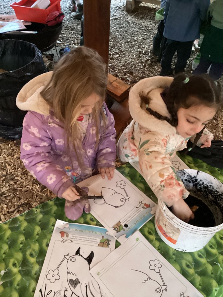 This weekend, it is the RSPB’s Big Garden Birdwatch so we have enjoyed a number of activities around birds today in our Forest School session. Lots of the children took to the challenge of completing bird pictures using paint mixed from the charcoal in our own firepit! We discussed how birds can struggle in the winter as there is less natural food for them to eat and how important it is to feed birds in gardens to help supplement their diet and help them survive the winter. Pupils then led their own learning by choosing to make bird fat balls using lard and bird seeds with string attached to hang them from trees to feed our feathered friends we have around the school site an energy boosting snack. Children also made nests using loose parts to keep our Forest School eggs safe, warm and dry. Pupils also explored other areas of our Forest School provision including the mud kitchen and the numerous large puddles which have appeared due to the heavy rain! It was so slippy and wet children created a mud slide which provided endless amounts of fun, teamwork and determination trying to make it up or down the mud bank without falling over! Sorry parents! Eventually driven back indoors, we took to some avian activities of a warmer and drier kind! The children chose to hone their colouring skills with some bird drawings as well as watching a live feed of a bird feeder where we spotted a number of different species of birds.