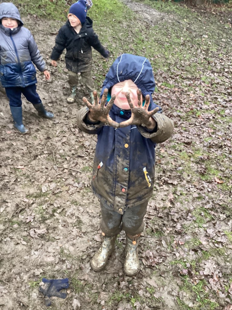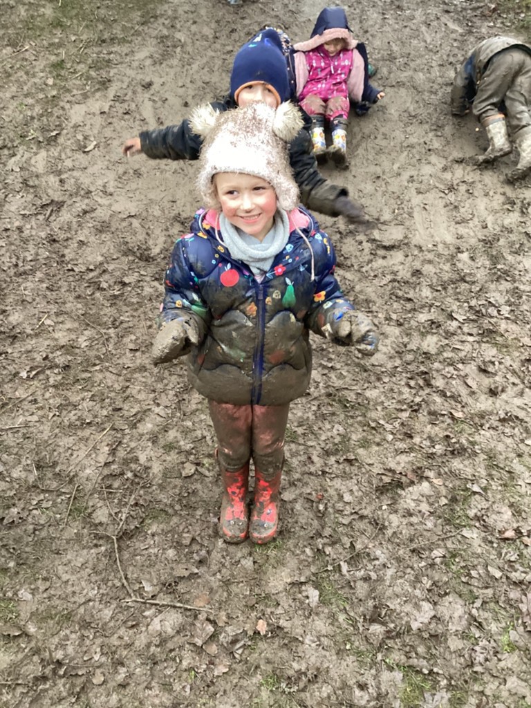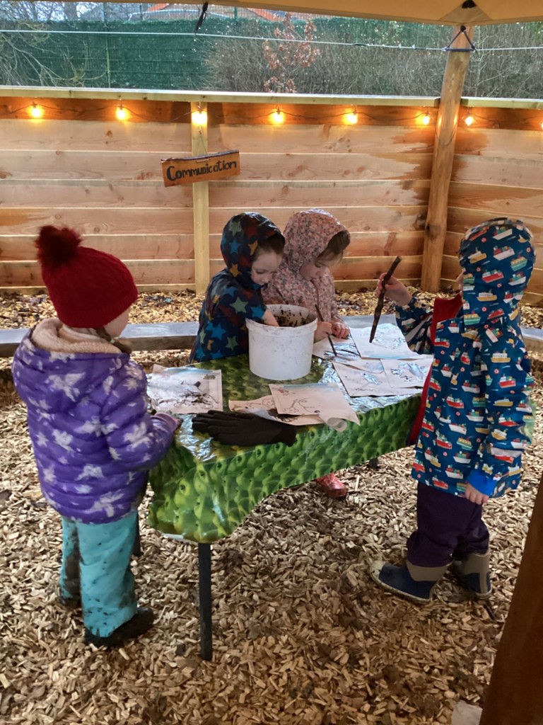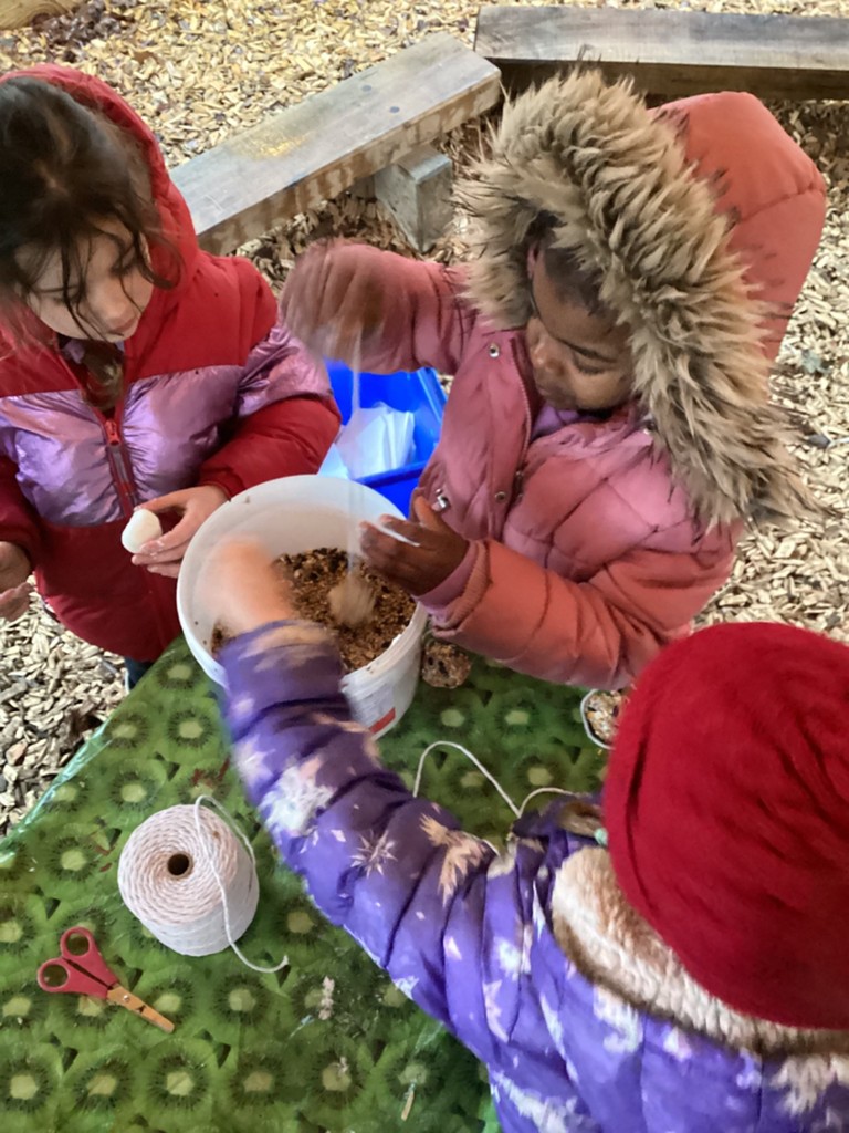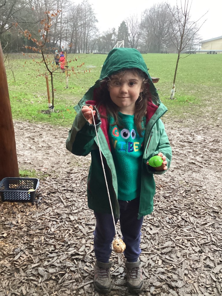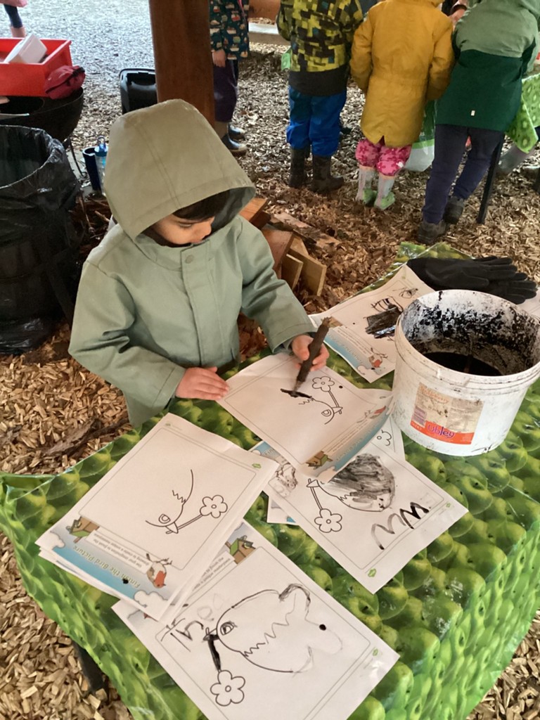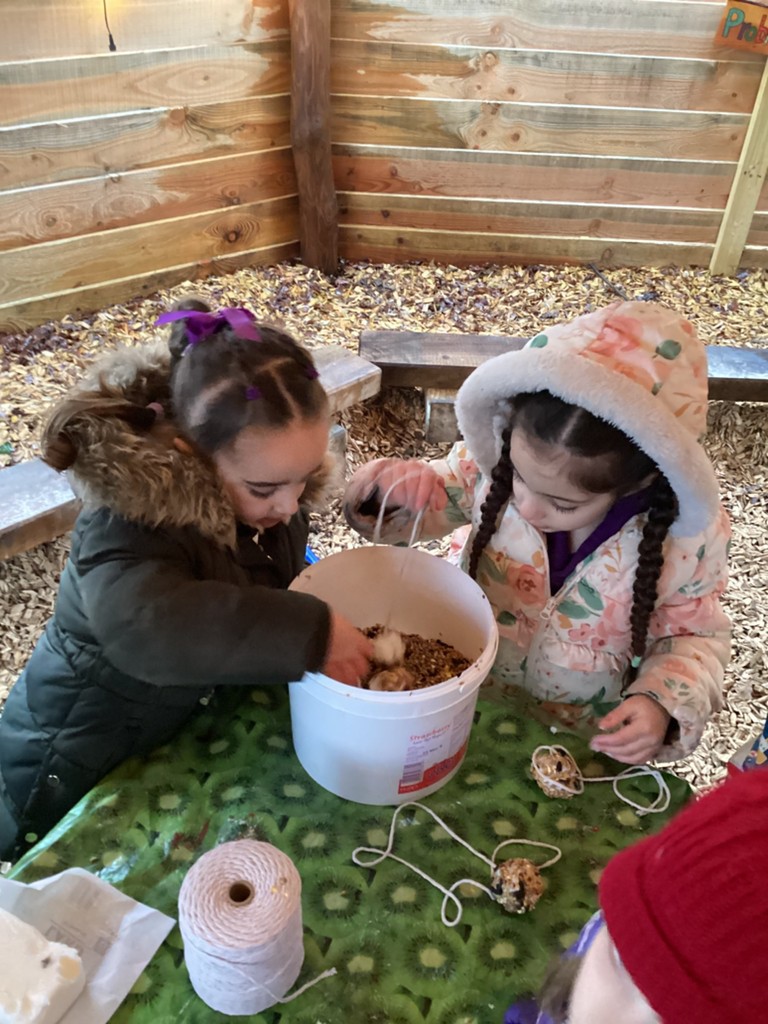 This weekend, it is the RSPB’s Big Garden Birdwatch so we have enjoyed a number of activities around birds today in our Forest School session. Lots of the children took to the challenge of completing bird pictures using paint mixed from the charcoal in our own firepit! We discussed how birds can struggle in the winter as there is less natural food for them to eat and how important it is to feed birds in gardens to help supplement their diet and help them survive the winter. Pupils then led their own learning by choosing to make bird fat balls using lard and bird seeds with string attached to hang them from trees to feed our feathered friends we have around the school site an energy boosting snack. Children also made nests using loose parts to keep our Forest School eggs safe, warm and dry. Pupils also explored other areas of our Forest School provision including the mud kitchen and the numerous large puddles which have appeared due to the heavy rain! It was so slippy and wet children created a mud slide which provided endless amounts of fun, teamwork and determination trying to make it up or down the mud bank without falling over! Sorry parents! Eventually driven back indoors, we took to some avian activities of a warmer and drier kind! The children chose to hone their colouring skills with some bird drawings as well as watching a live feed of a bird feeder where we spotted a number of different species of birds.