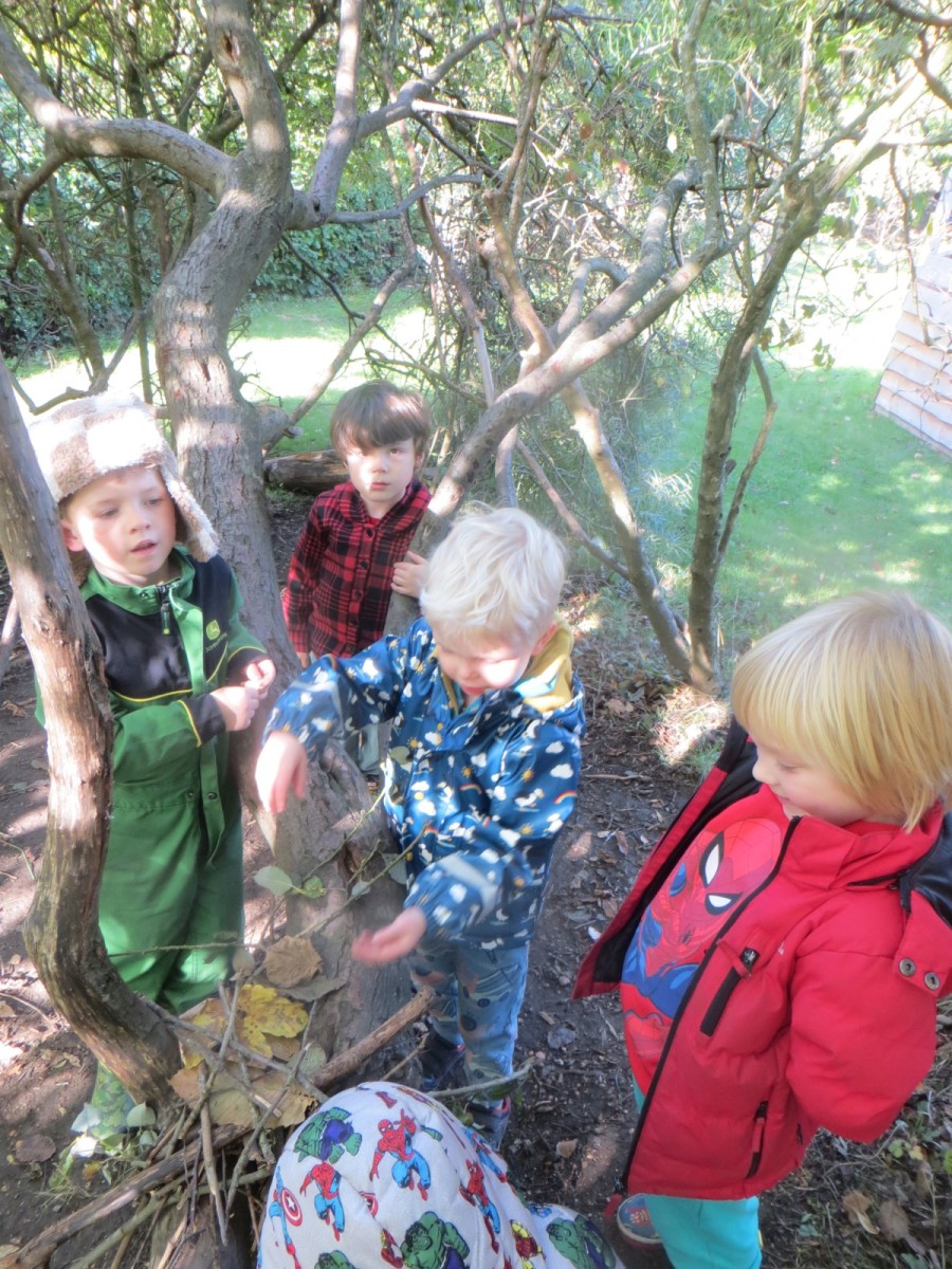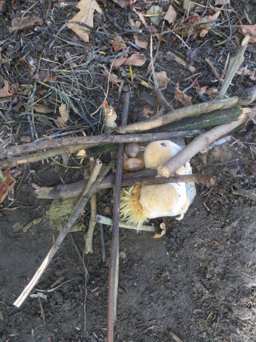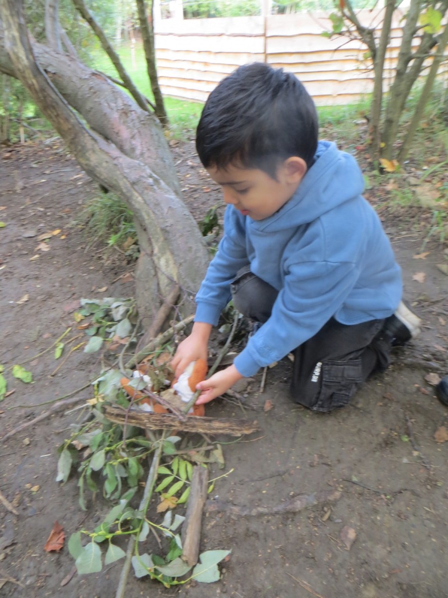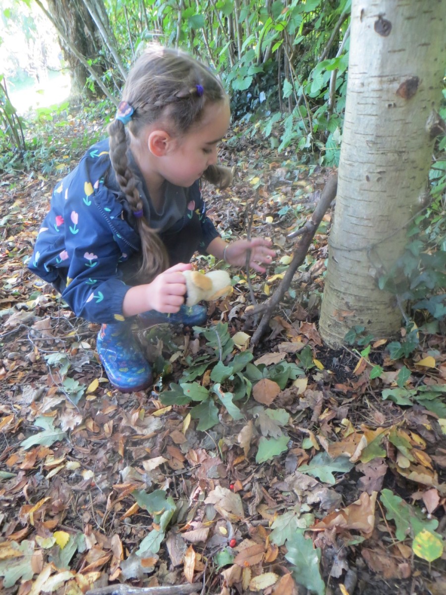 This morning in Forest School we began our session by reading ‘The Cave’ by Rob Hodgson. The book is about a creature who lives in a cave but never comes out because of a wolf but there is an exciting twist and surprise in the tale! After reading and discussing the book, the children were set a task of creating a cave for an animal puppet. Children chose their animal, a sensible place to build the cave and used natural resources to create a safe home. For their next challenge, pupils were asked to include items inside the cave, such as a bed and food for the animals.