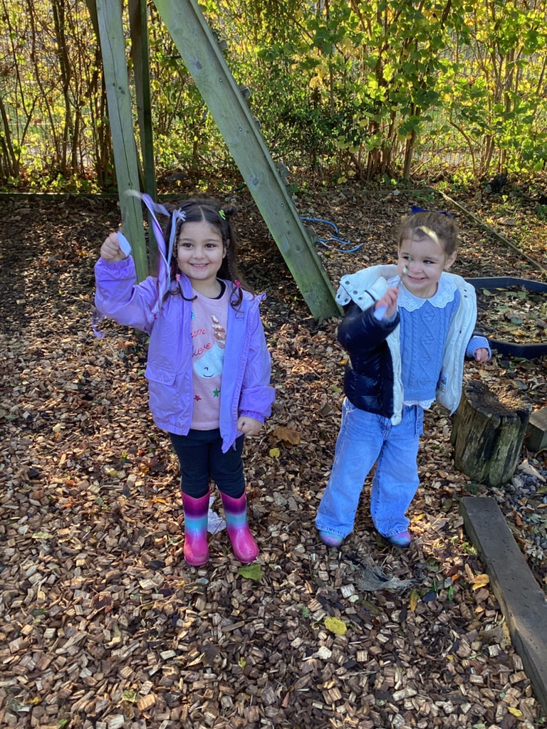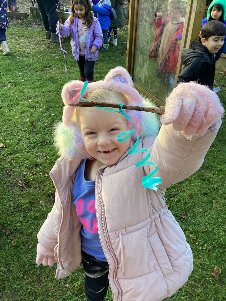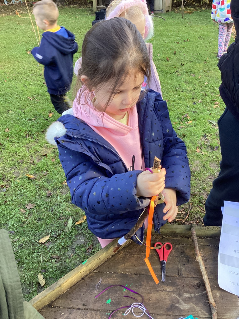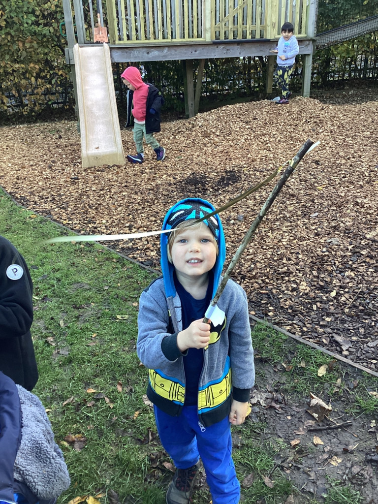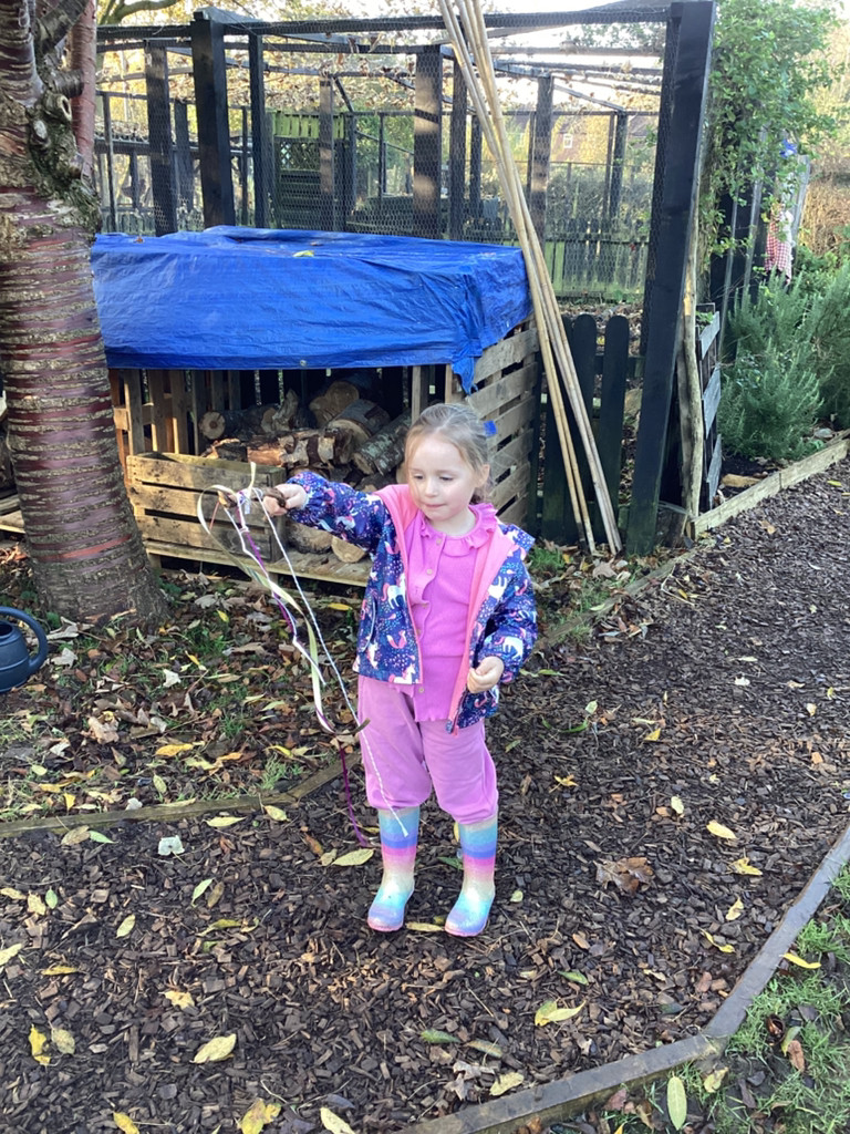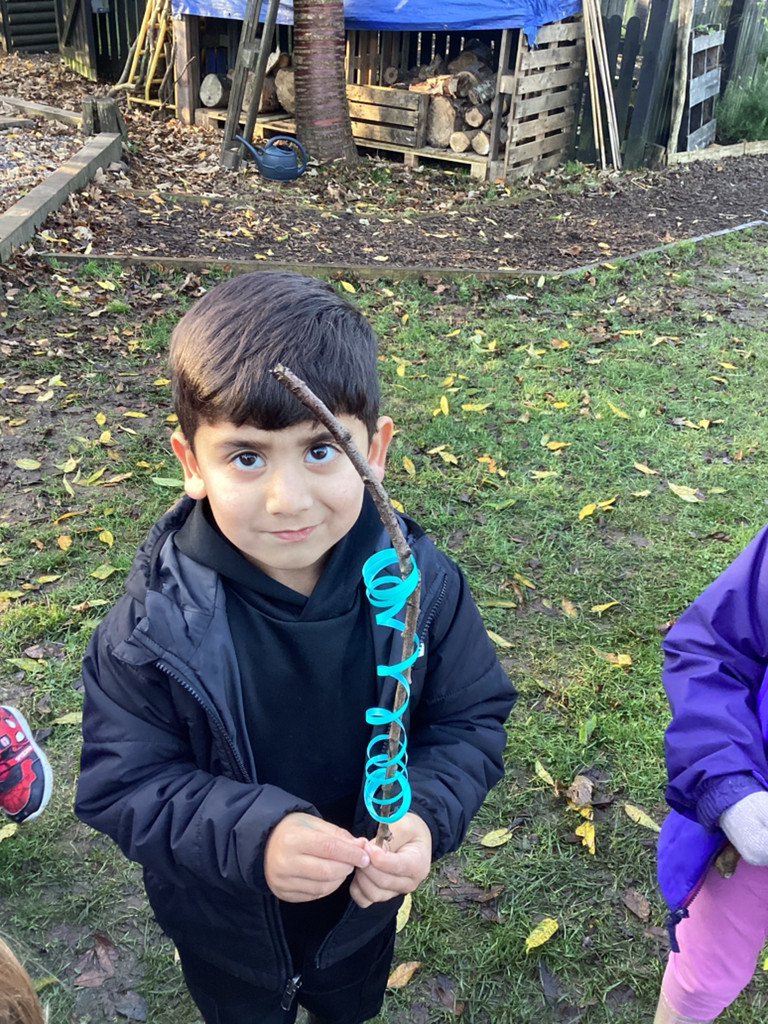 Today we enjoyed a sunny Forest Schools morning in school garden. Inspired by the John Hegley picture book ‘ Stanley’s Stick,’ we asked the children to hunt for a special stick and think of what else it could be other than just a stick.  We had some fantastic ideas from from the children, such as using the stick as a musical instrument; as a unicorn’s horn or a light-sabre! As Halloween is fast-approaching and we have enjoyed reading Julia Donaldson’s ‘Room on the Broom’ together, we decided to have a go at turning a stick into a magic wand! After finding their own special stick in the garden, the children picked out some colourful ribbons to tie onto the end and help spread their magic around as they got busy casting spells here there and everywhere! It was wonderful to see such imaginative play amongst the children, as they happily transformed each other (and the grown-ups too!) into cats, bats and frogs.