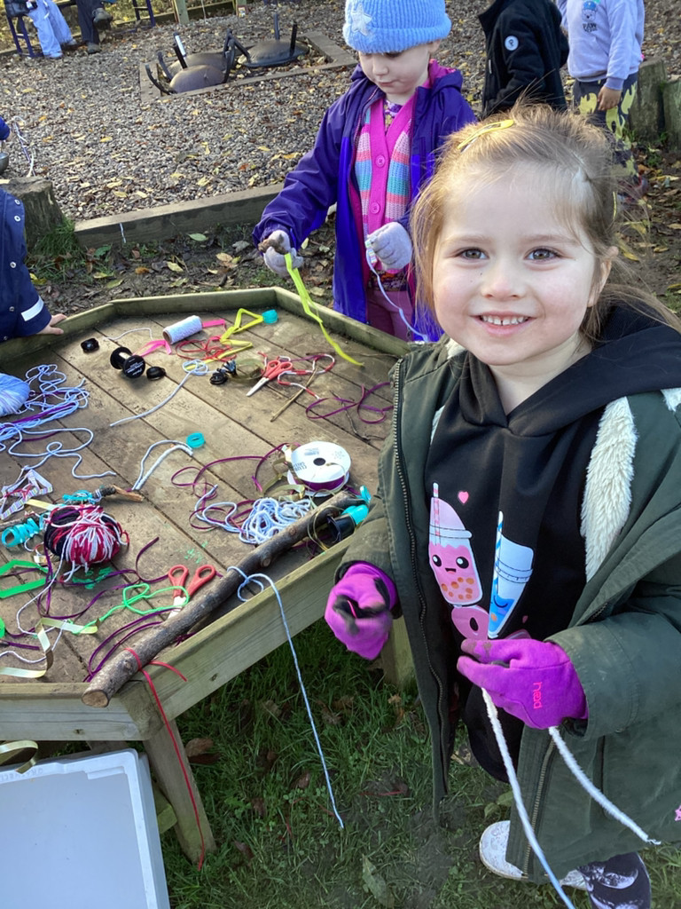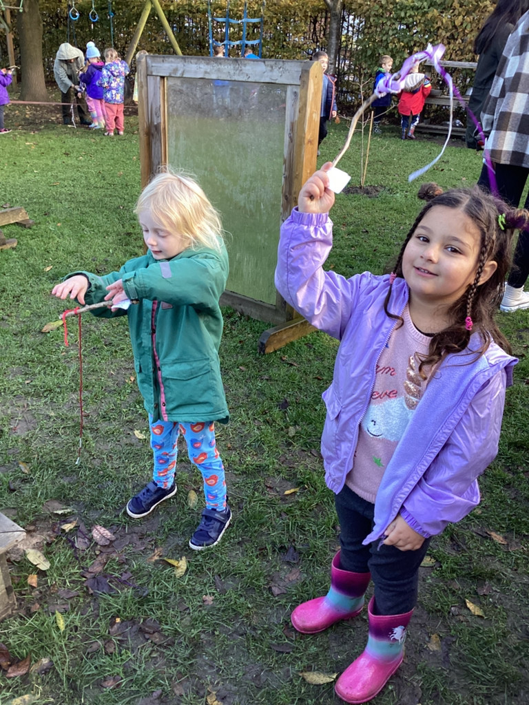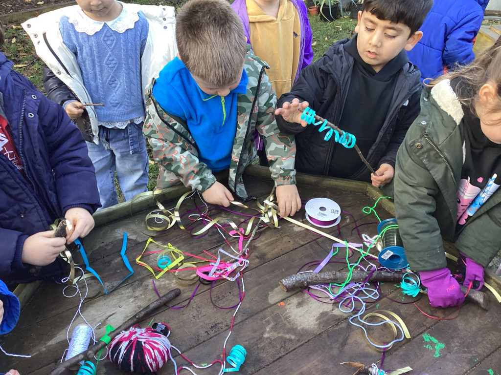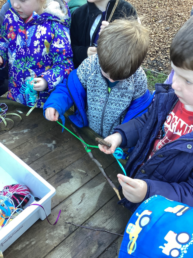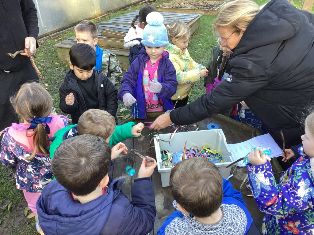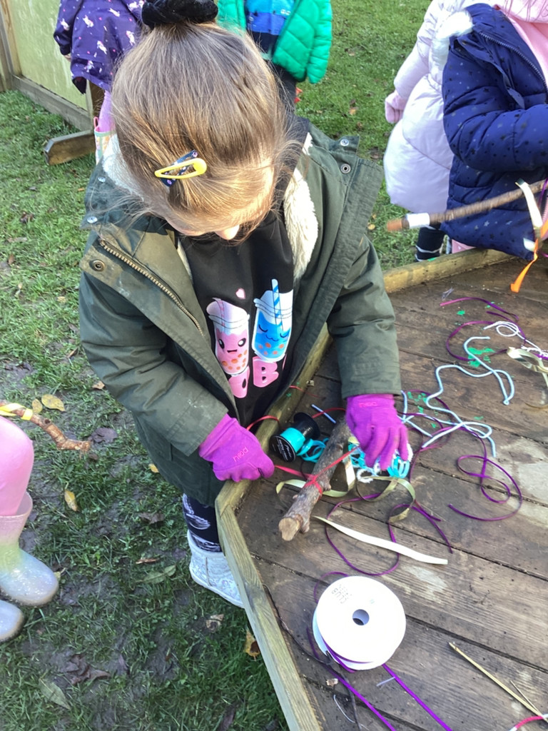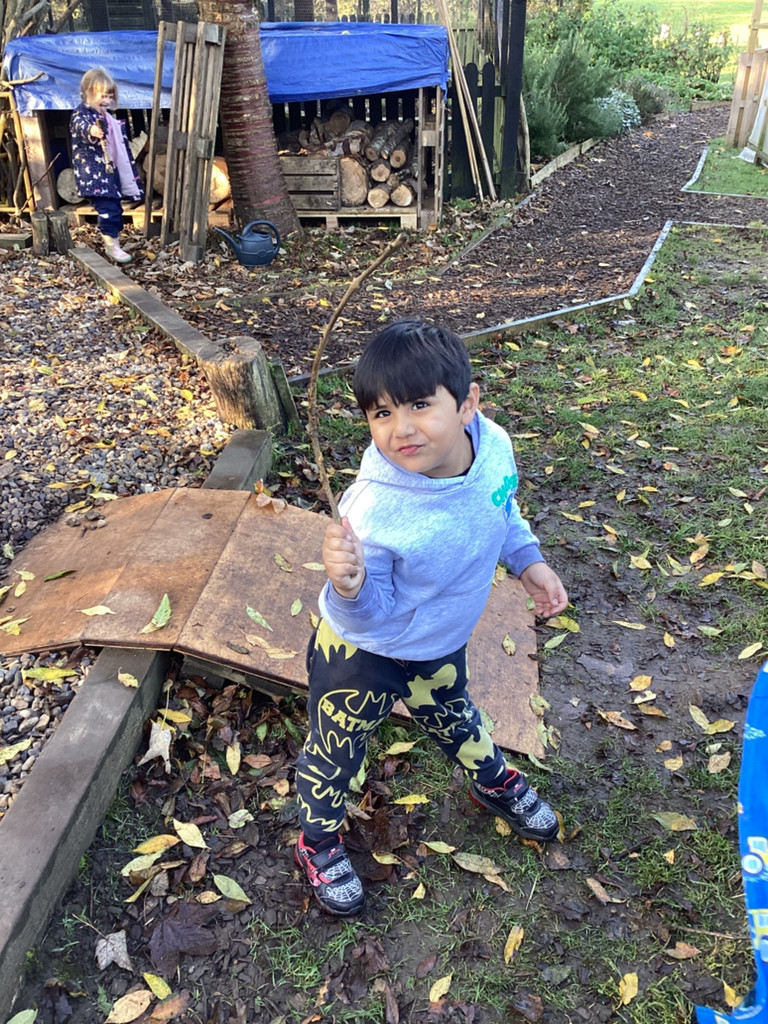 Today we enjoyed a sunny Forest Schools morning in school garden. Inspired by the John Hegley picture book ‘ Stanley’s Stick,’ we asked the children to hunt for a special stick and think of what else it could be other than just a stick.  We had some fantastic ideas from from the children, such as using the stick as a musical instrument; as a unicorn’s horn or a light-sabre! As Halloween is fast-approaching and we have enjoyed reading Julia Donaldson’s ‘Room on the Broom’ together, we decided to have a go at turning a stick into a magic wand! After finding their own special stick in the garden, the children picked out some colourful ribbons to tie onto the end and help spread their magic around as they got busy casting spells here there and everywhere! It was wonderful to see such imaginative play amongst the children, as they happily transformed each other (and the grown-ups too!) into cats, bats and frogs.