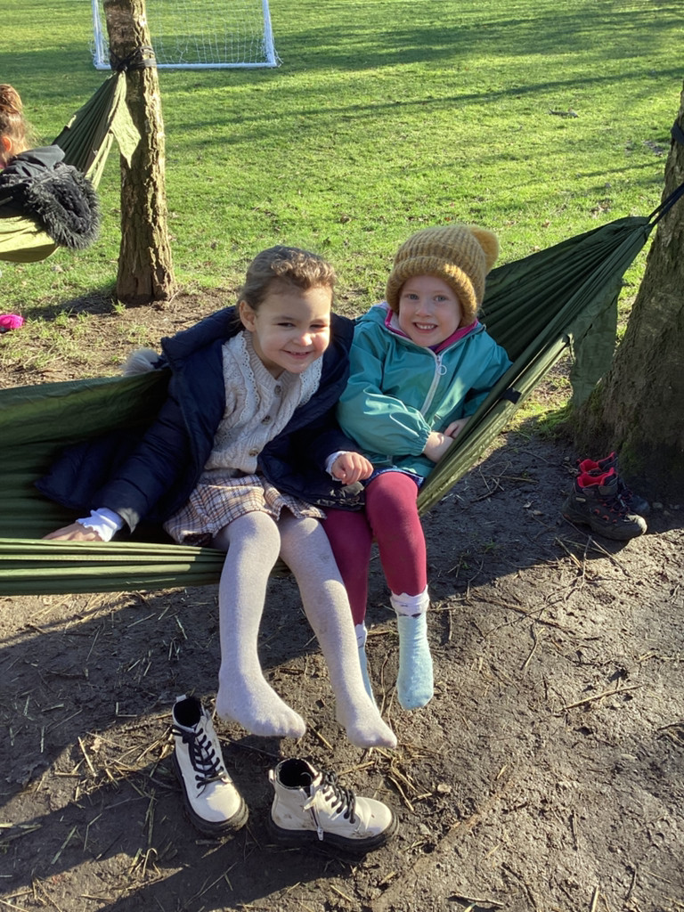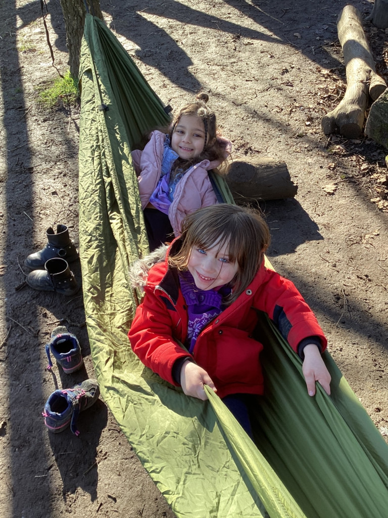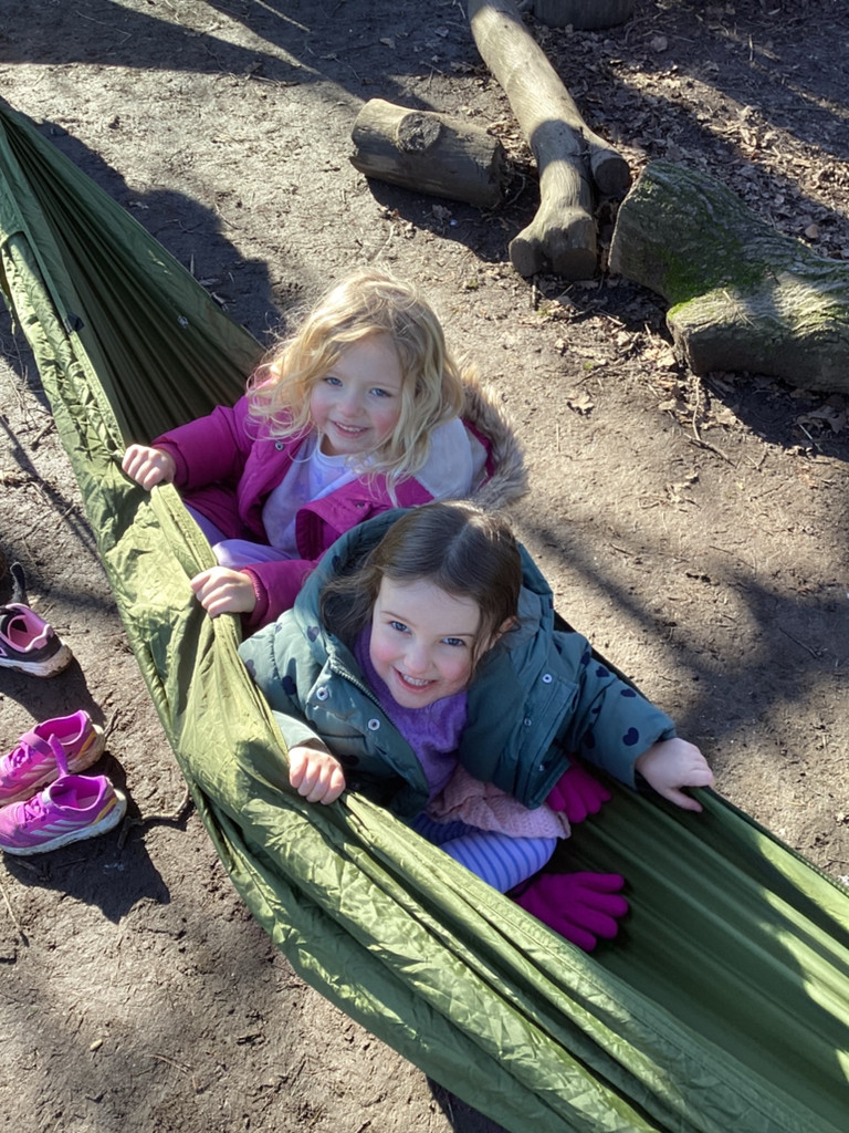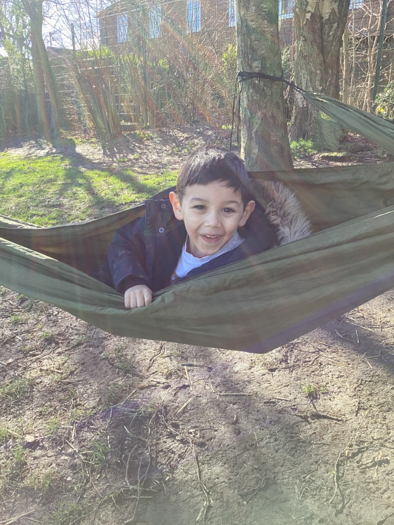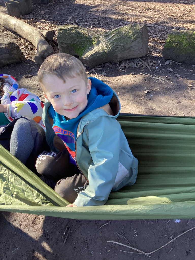 It has been a gloriously sunny morning for our Forest Schools session today. We had our regular tree-climbing and den-building zone which saw lots of activity. And we had our chilled ‘tree-bathing’ zone with blissed out music and hammocks hung amongst the trees which saw purposefully a lot less activity (but more zen vibes!).