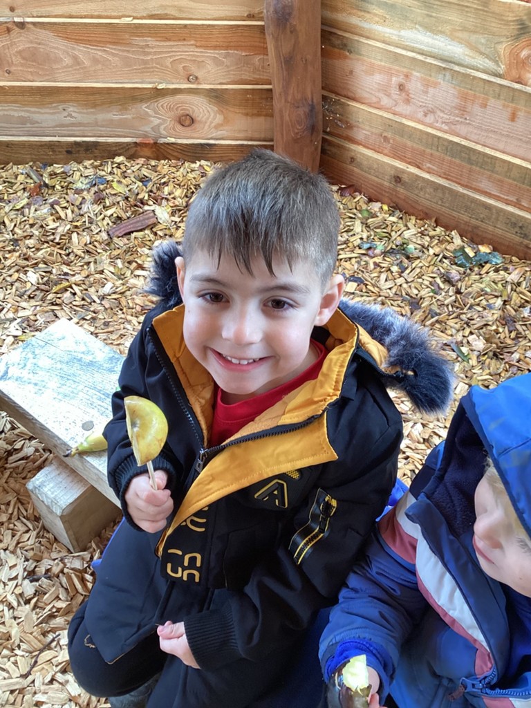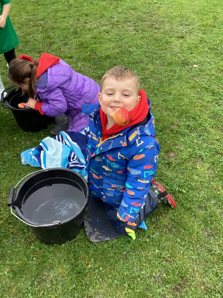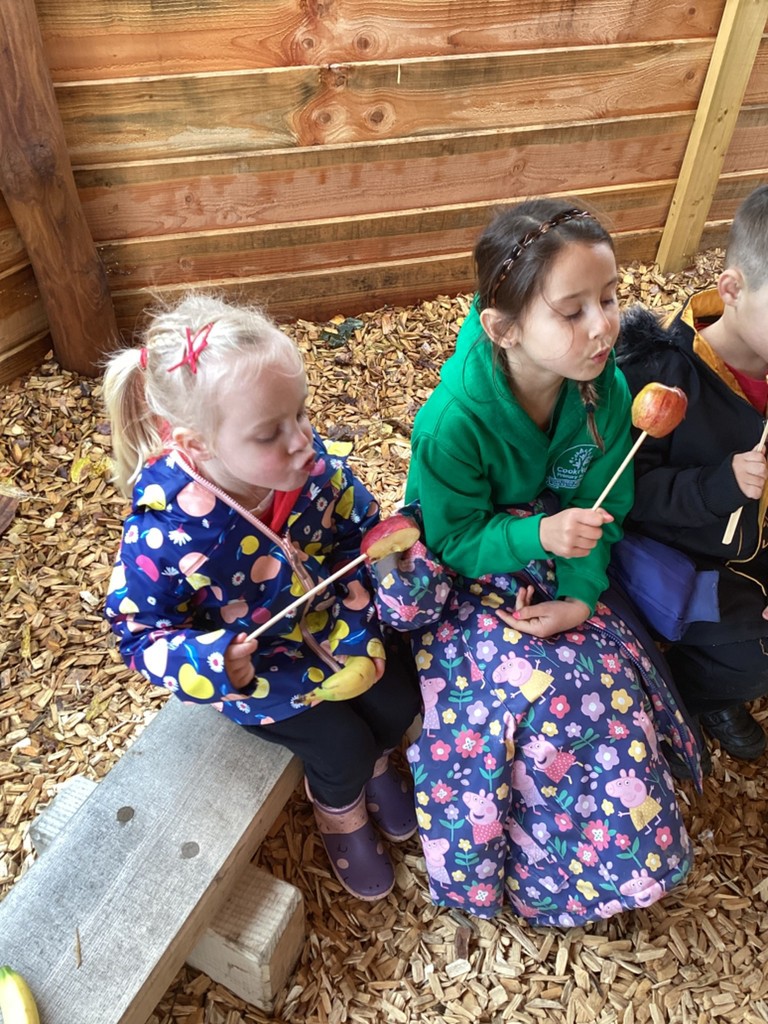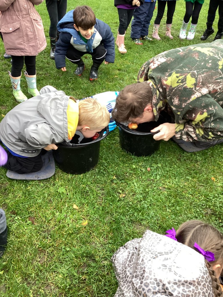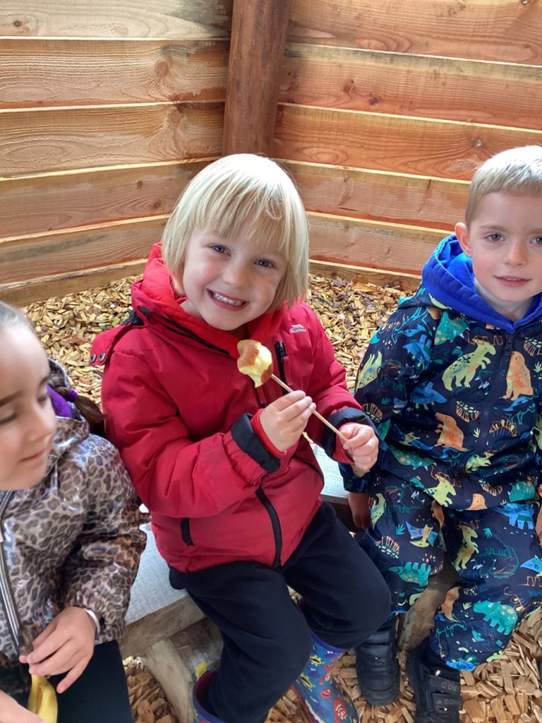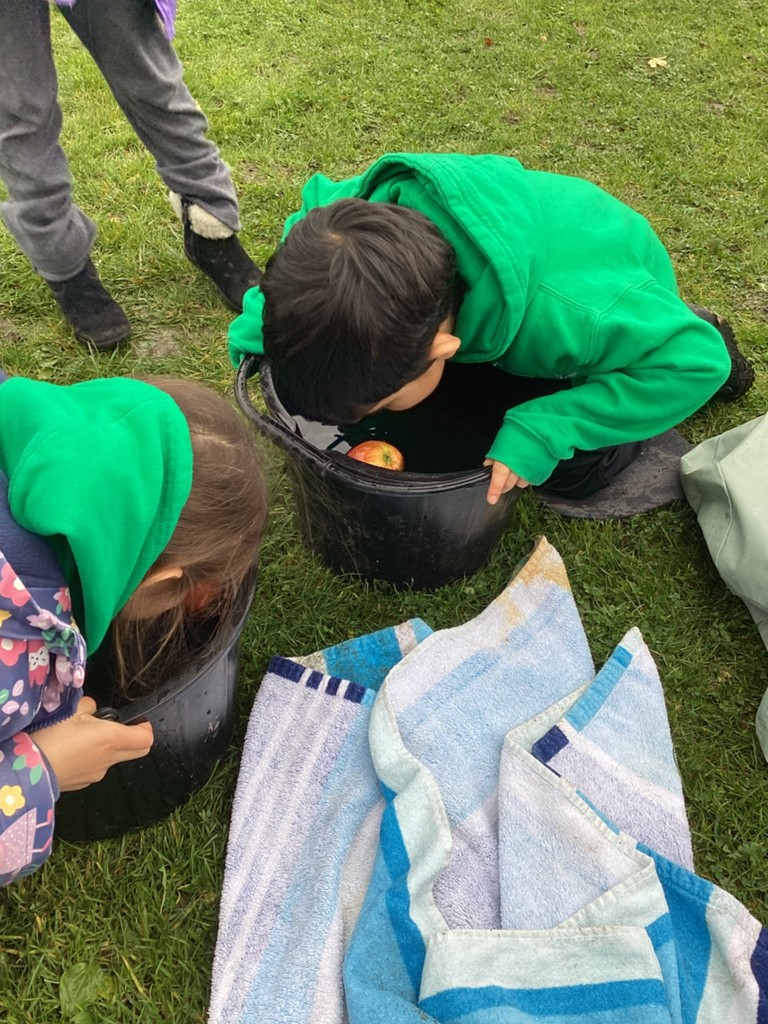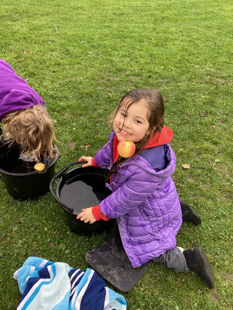 What a fun morning we’ve had at Forest School in Reception! To round off our school’s celebrations on harvest and National Apple Day (held annually on 21st October), children in EYFS had apple themed activities to take part in outside. First of all, children took turns in playing a traditional autumn game – bobbing for apples! After listening carefully to the rules and how to play, children took turns in playing against each other – and the teachers – to grab the apple the quickest. We had so much fun and learnt that taking part is the most important element in games! In the canopy, children helped Mr Gamble and Mr Verdi light and maintain a fire as well as cutting up apples to roast over the fire using skewers. All of the pupils were super sensible and safe around the fire and enjoyed a delicious roasted apple snack. Finally, children also had the chance to show off their amazing teamwork by constructing dens using our den building sticks. They communicated, problem solved and listened well to each to create some wonderful structures. Well done EYFS!