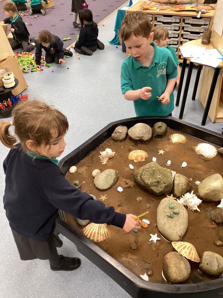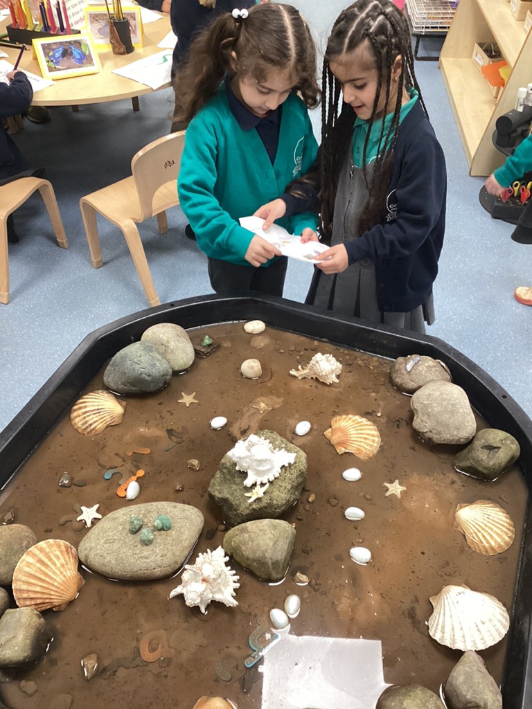 We’ve been under the sea this week in Reception, exploring undersea creatures as part of our Amazing Animals topic. There was a lot of interest in our newly installed class rockpool, which gave children opportunity to practise their counting and word building. Children searched the rockpool for different types of shell and counted each accurately. Hidden amongst the sand and rocks were a collection of letters, and the children were encouraged to find letters and build words to write.