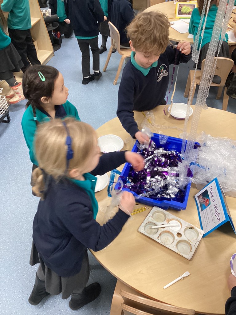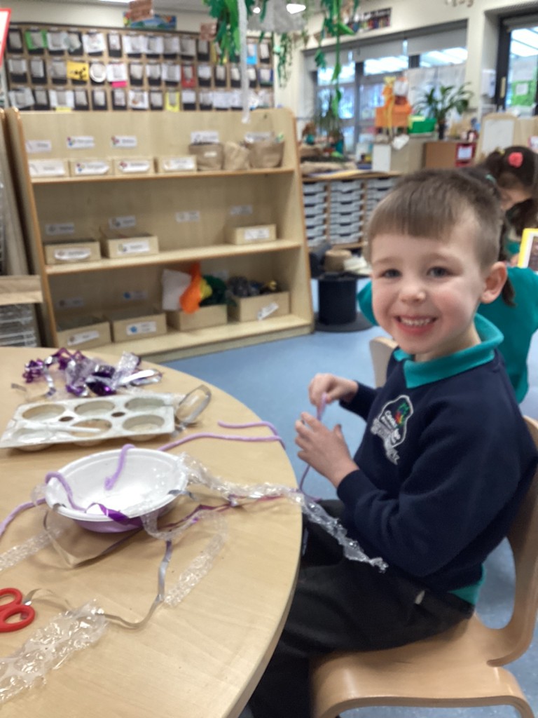 There has been lots of creativity inspired by animals this week, with children choosing to draw pictures of some of the animals we saw last week at Tropical World. We had a fabulous school of jellyfish festoon the classroom, created out of paper bowls and bubble-wrap! Children also chose to create sparkling fish collage pictures inspired by the picture book ‘The Rainbow Fish’ by Marcus Pfister.