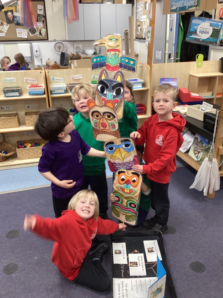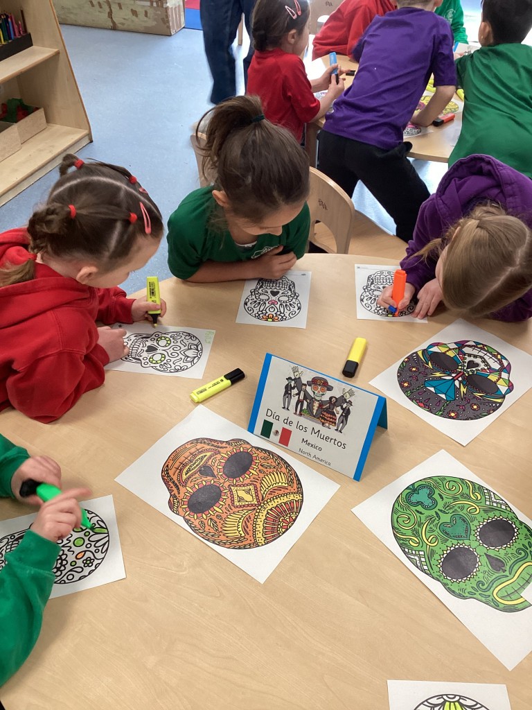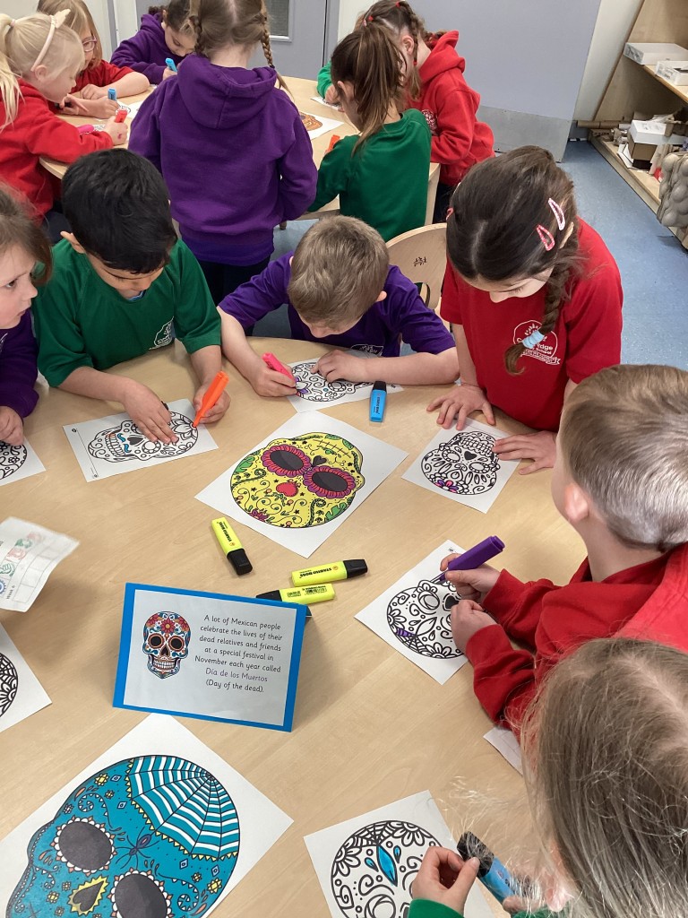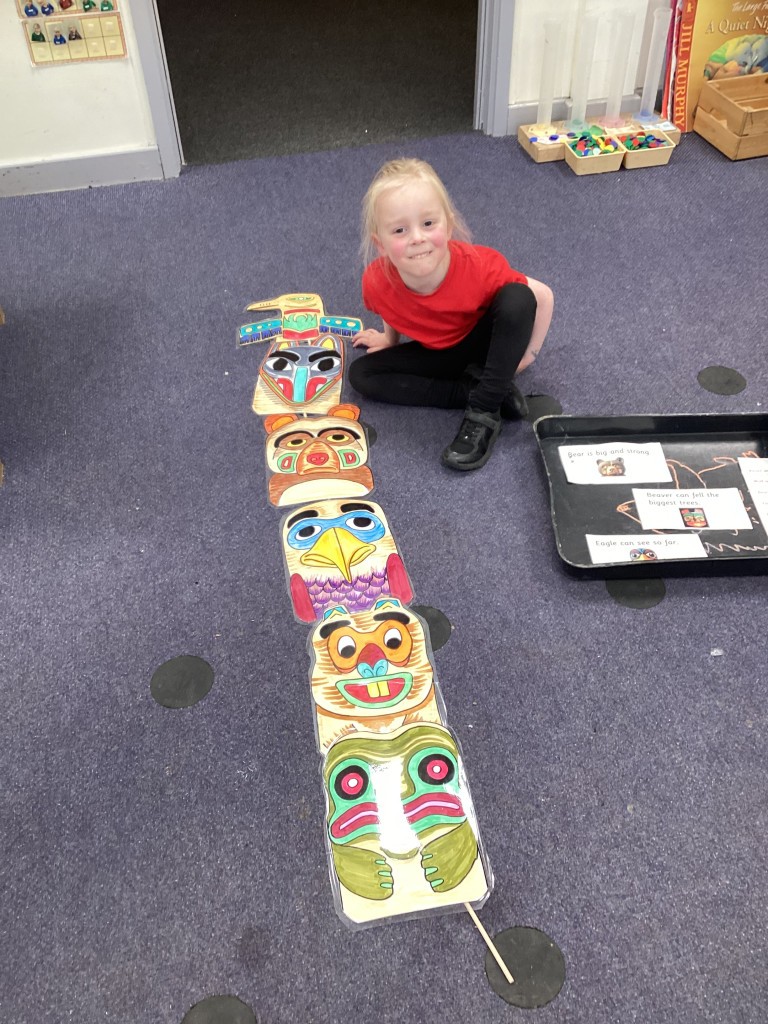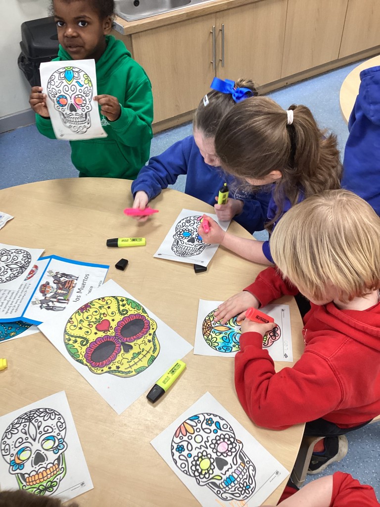 We talked about the Mexican festival Dias de los Muertos (Day of the Dead) and how it is a traditional holiday were families put out gifts and tokens for the loved ones in the spirit world. Many children took the challenge to carefully colour their own skull picture inspired by the highly-decorated sugar skulls we had looked at. We also listened to a story about Totems in Alaska and how the different carved animals argued about what order they should sit in on the totem pole. Following on from this story, the children were challenged to retell the story in role-play and have a go at placing the different totems in the correct order.
