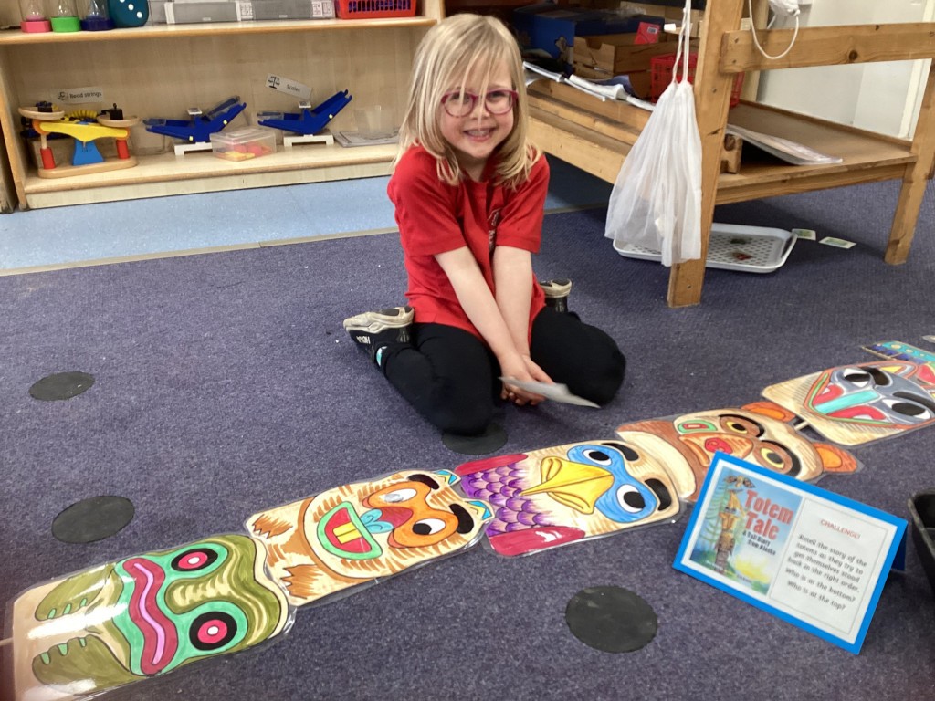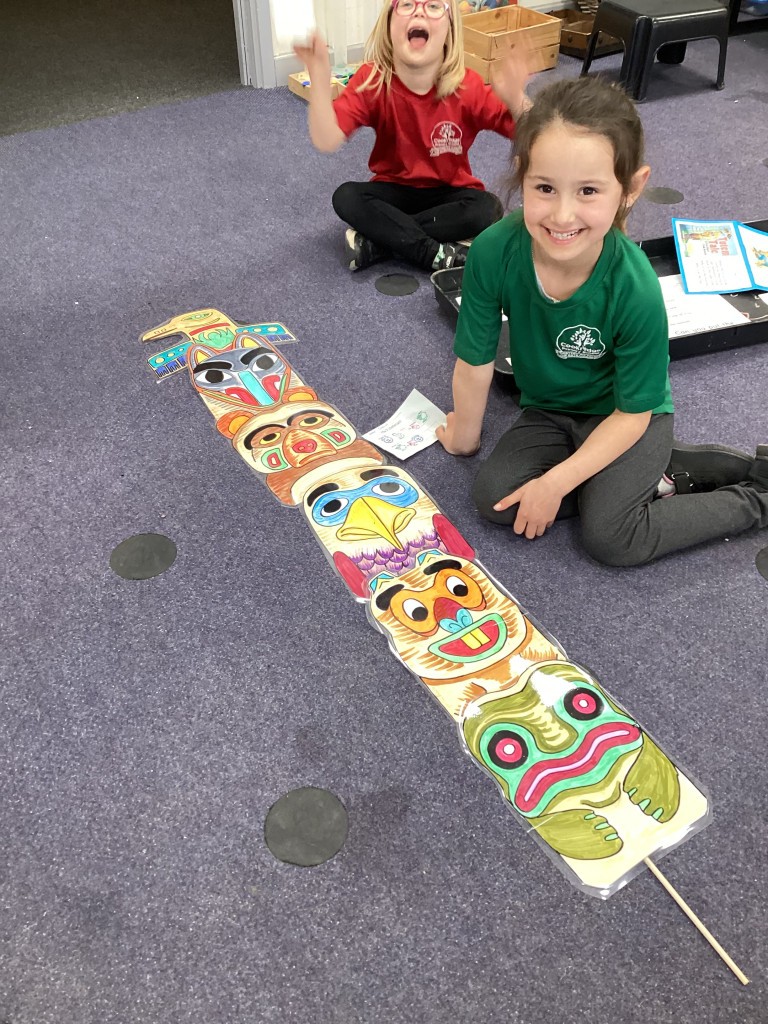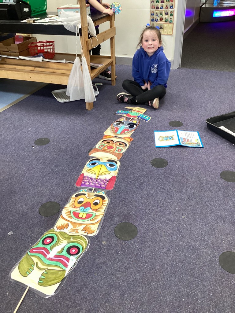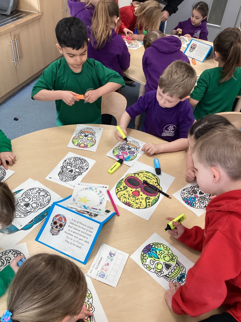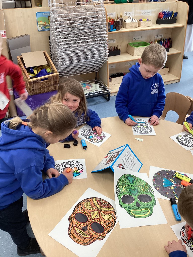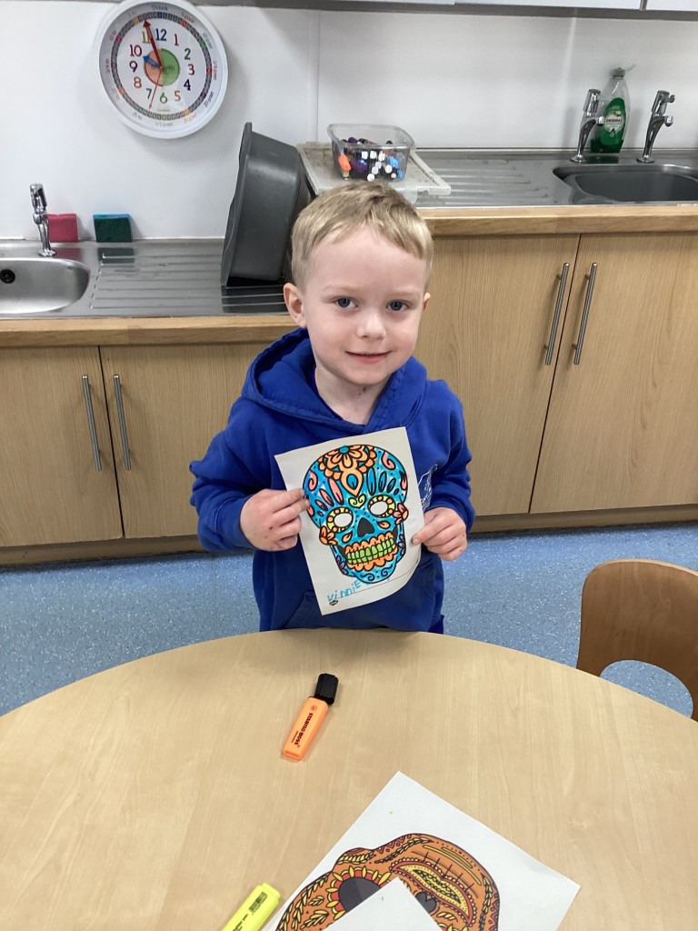 We talked about the Mexican festival Dias de los Muertos (Day of the Dead) and how it is a traditional holiday were families put out gifts and tokens for the loved ones in the spirit world. Many children took the challenge to carefully colour their own skull picture inspired by the highly-decorated sugar skulls we had looked at. We also listened to a story about Totems in Alaska and how the different carved animals argued about what order they should sit in on the totem pole. Following on from this story, the children were challenged to retell the story in role-play and have a go at placing the different totems in the correct order.