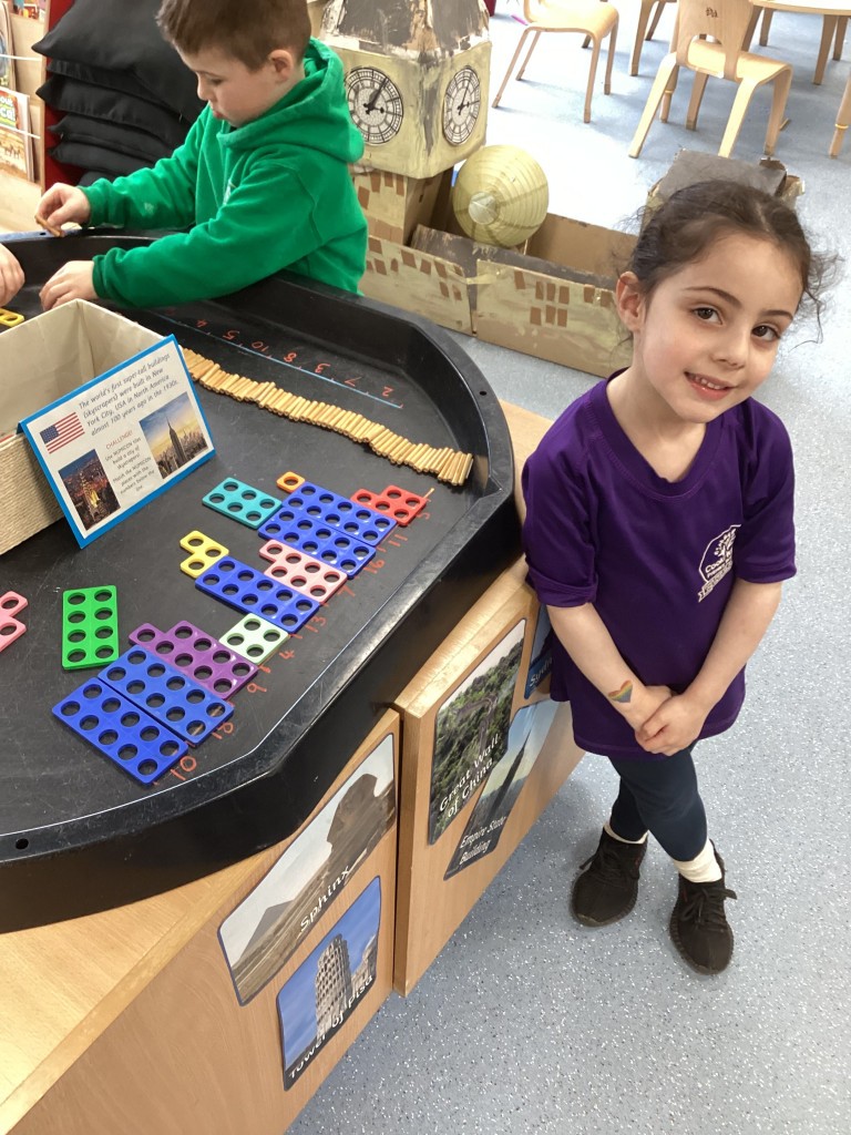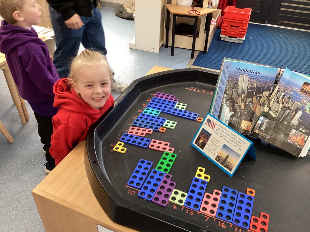 In our final week of our Around The World topic we have been learning about countries in North America. We looked at famous landmarks in New York City – the Empire State Building and the Statue of Liberty and had a zoom in to have closer look on our trusty Google Earth. Inspired by the skyscrapers of the USA we challenged the children to have a go at building towers out of Numicon tiles to match one and two-digit numbers.