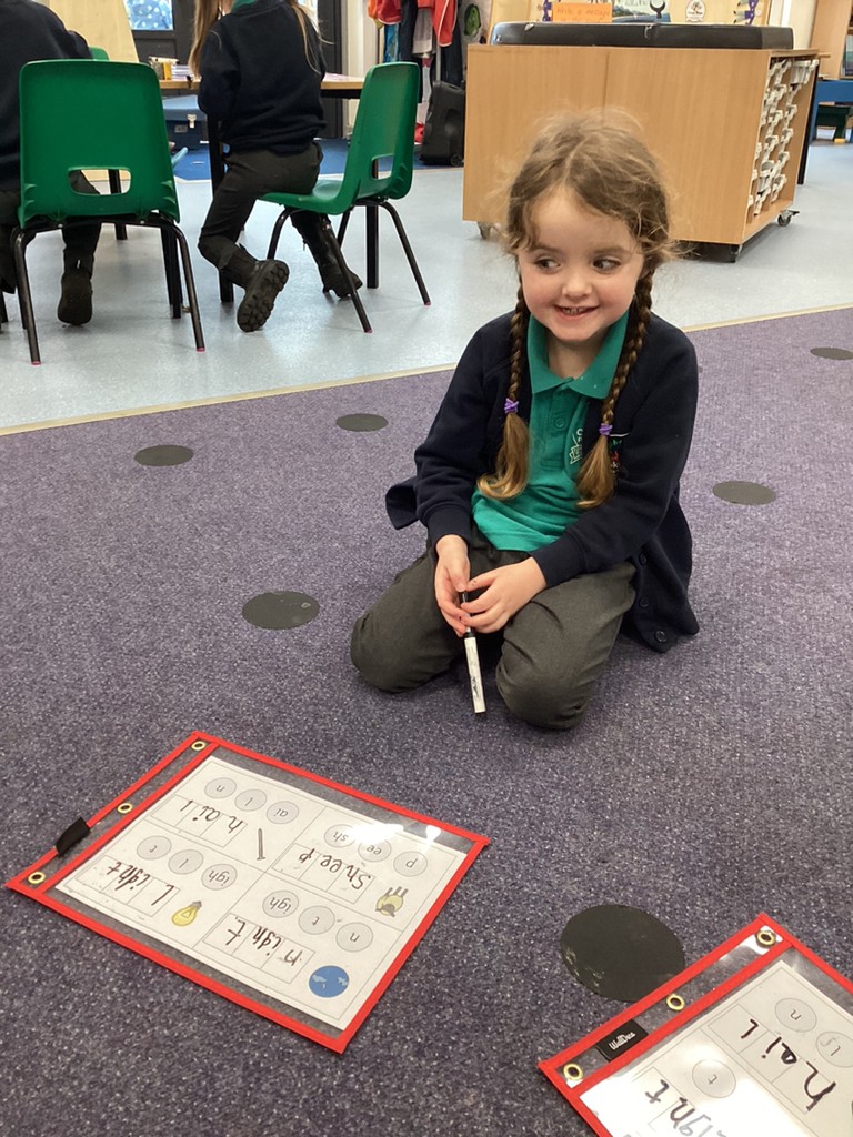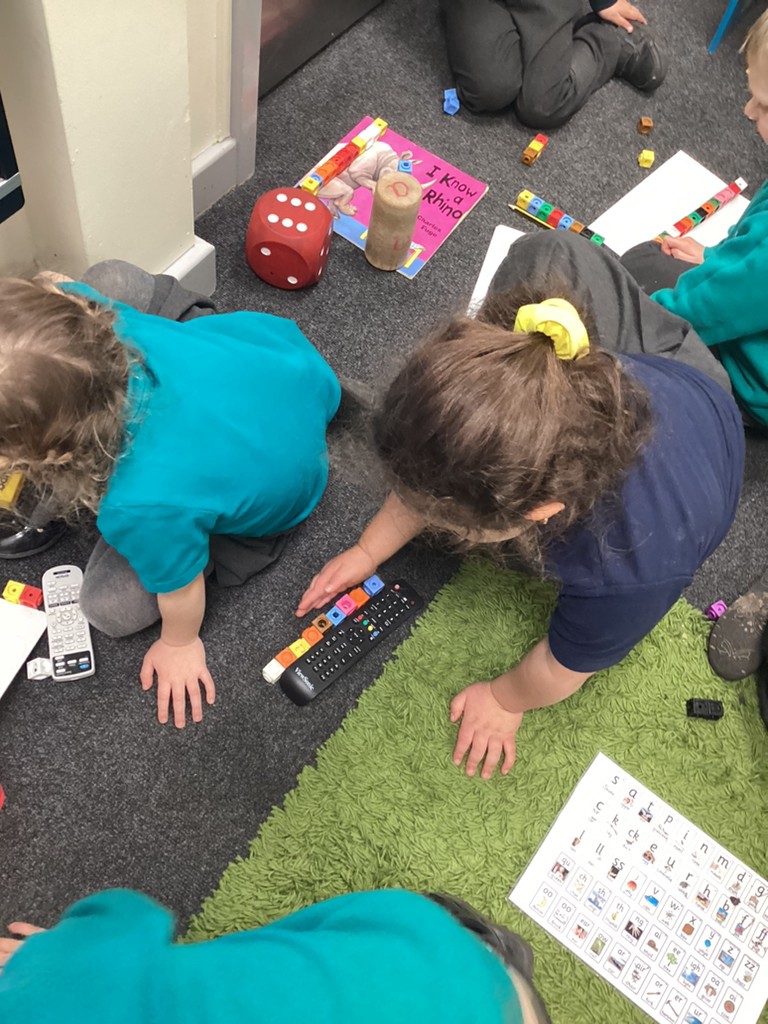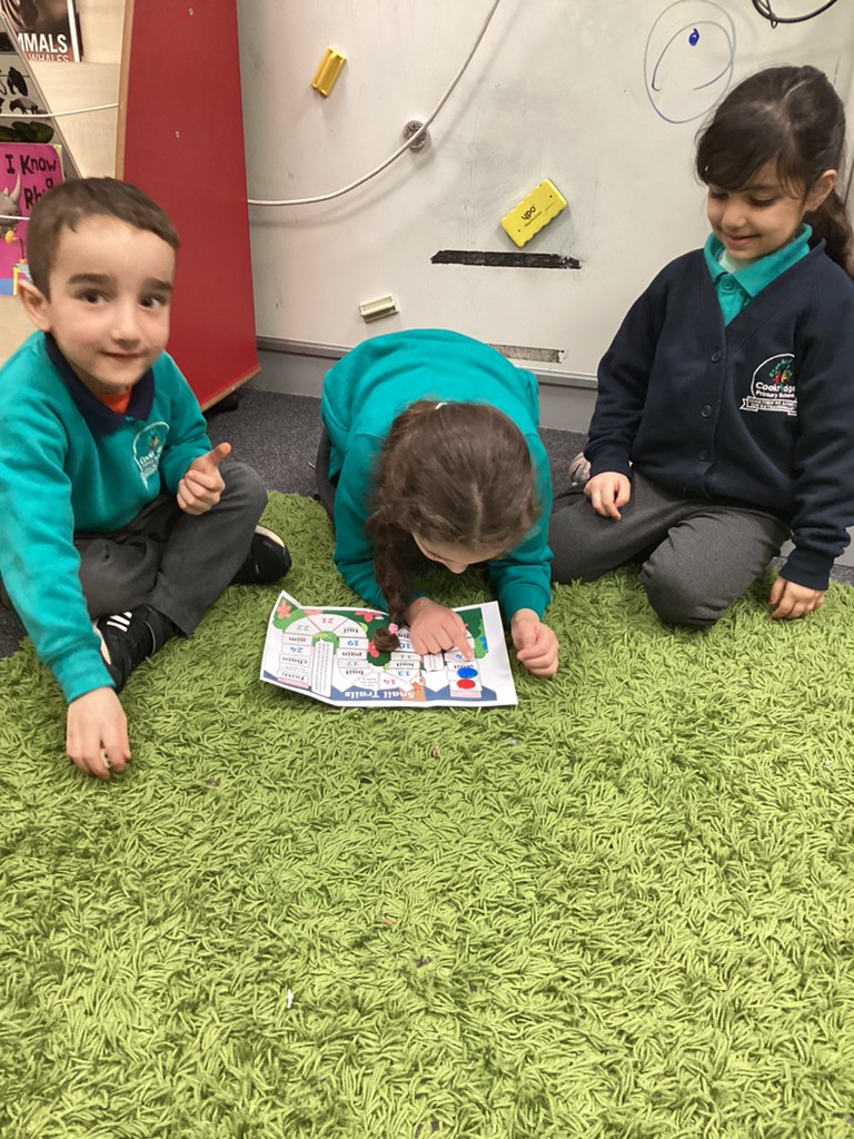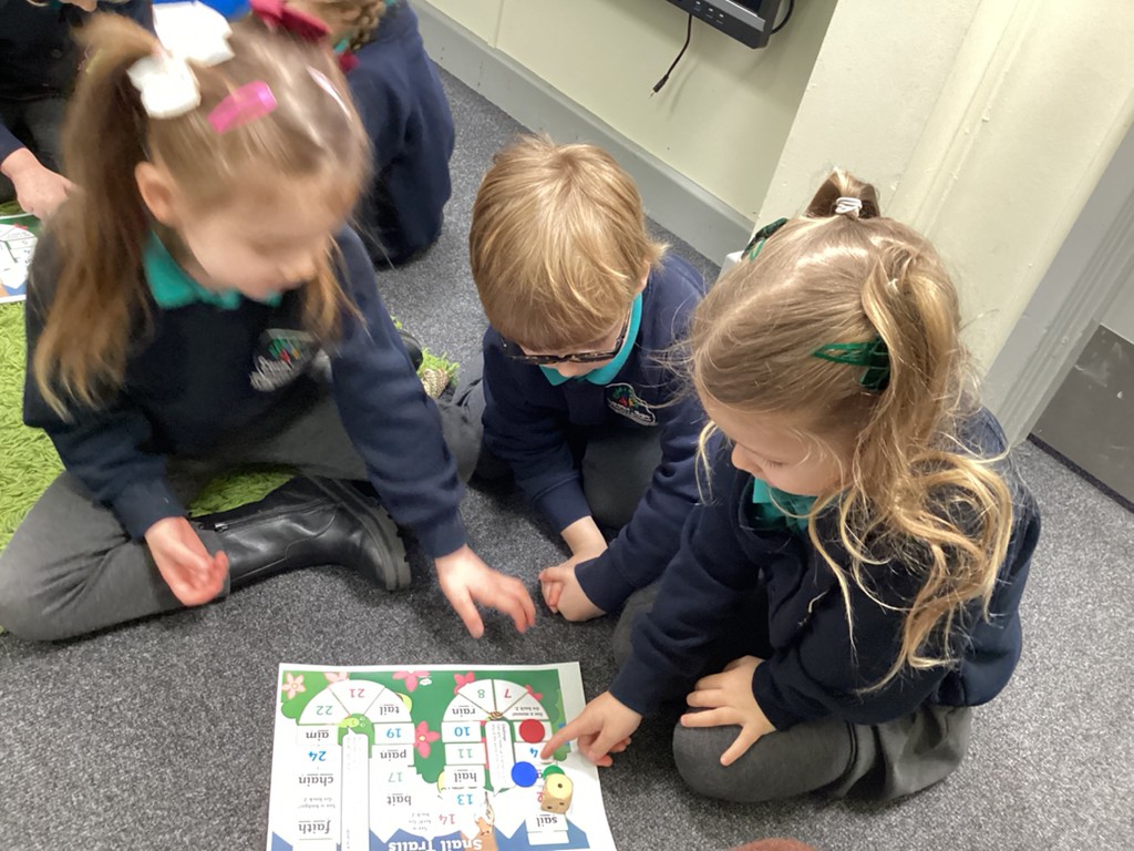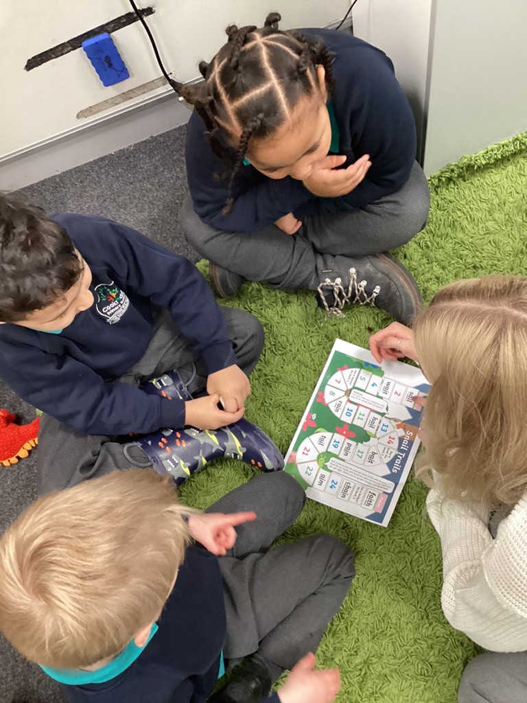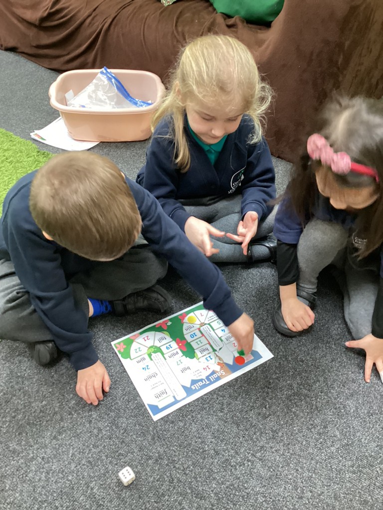 Our phonics work has introduced the long vowel sounds ‘ai’ ‘ee’ and ‘igh’ and given the children opportunities to explore hearing, reading and writing this sounds in words and sentences. Playing a snail-themed phonics board game was a lot of fun, as was going outside on a word hunt!