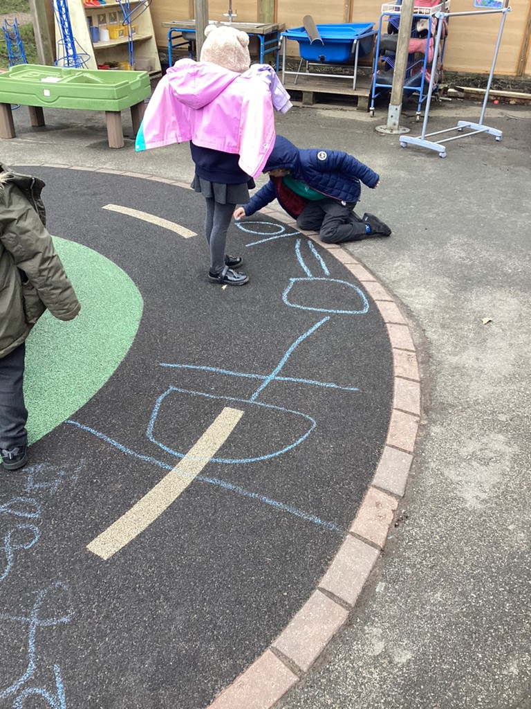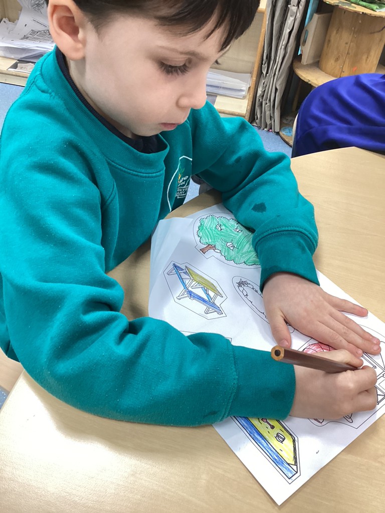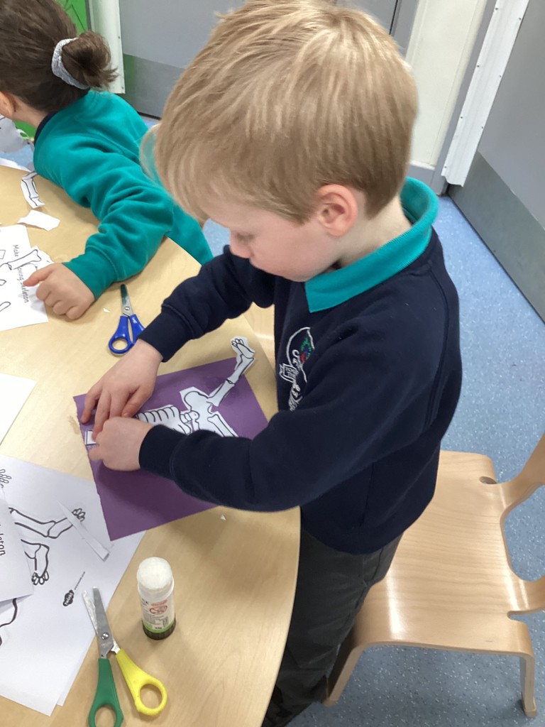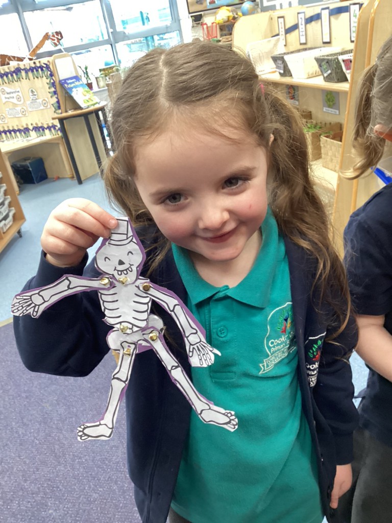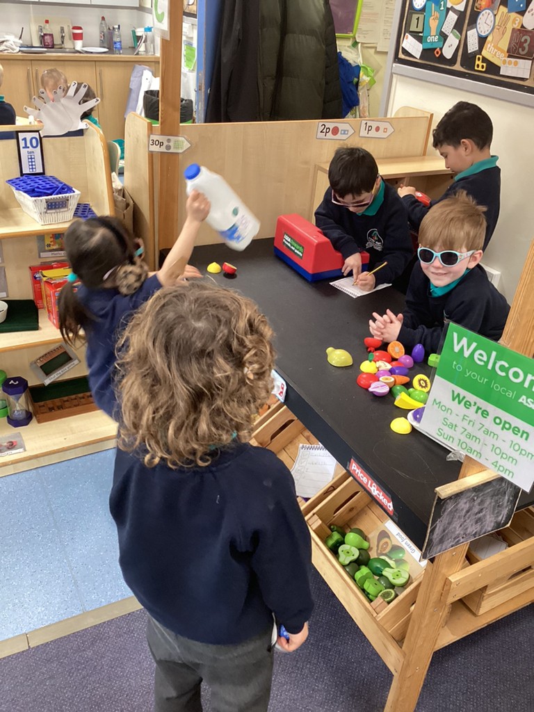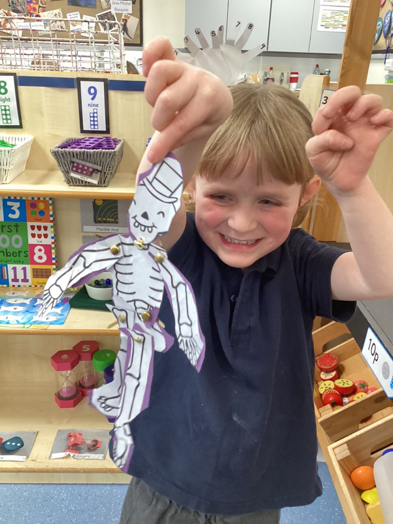 Elsewhere in the classroom the children have created moving puppets of characters from the story ‘Funny Bones’, coloured, cut out and designed our own play parks and acted out roles in our class shop.