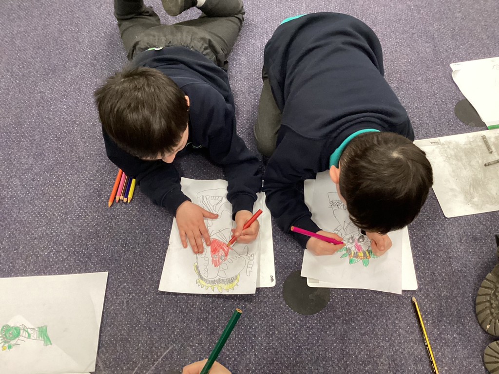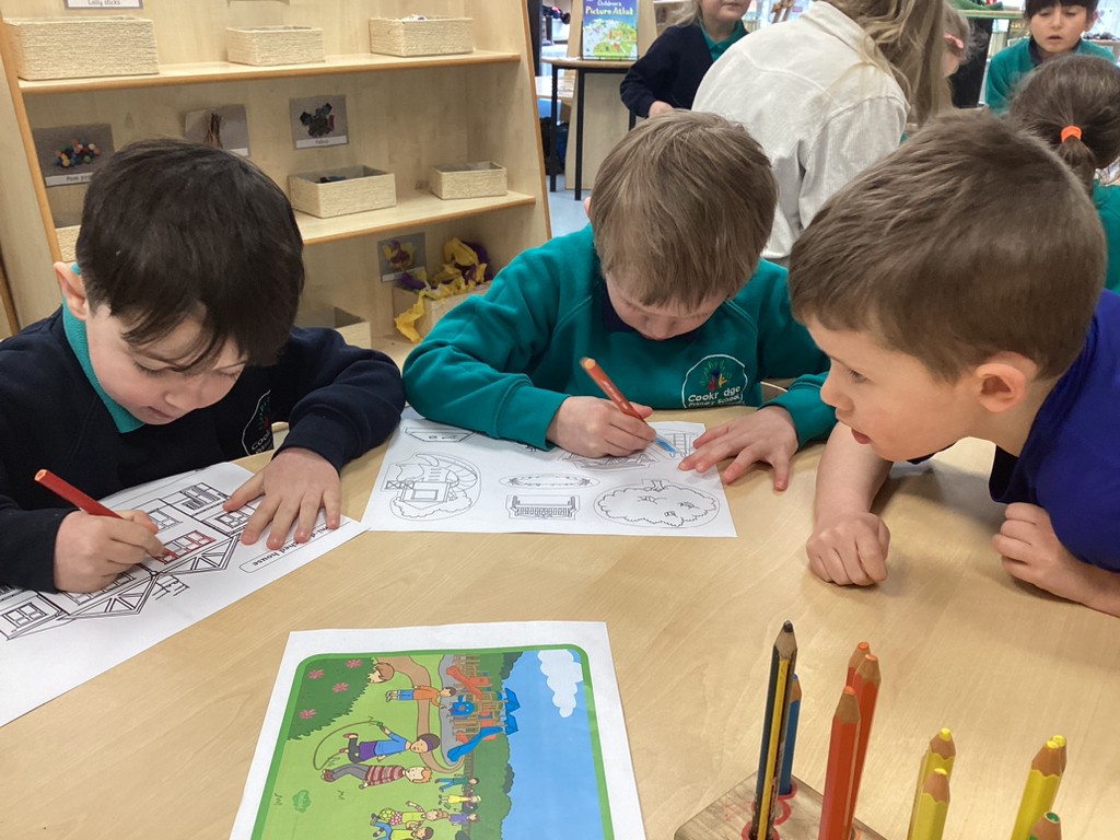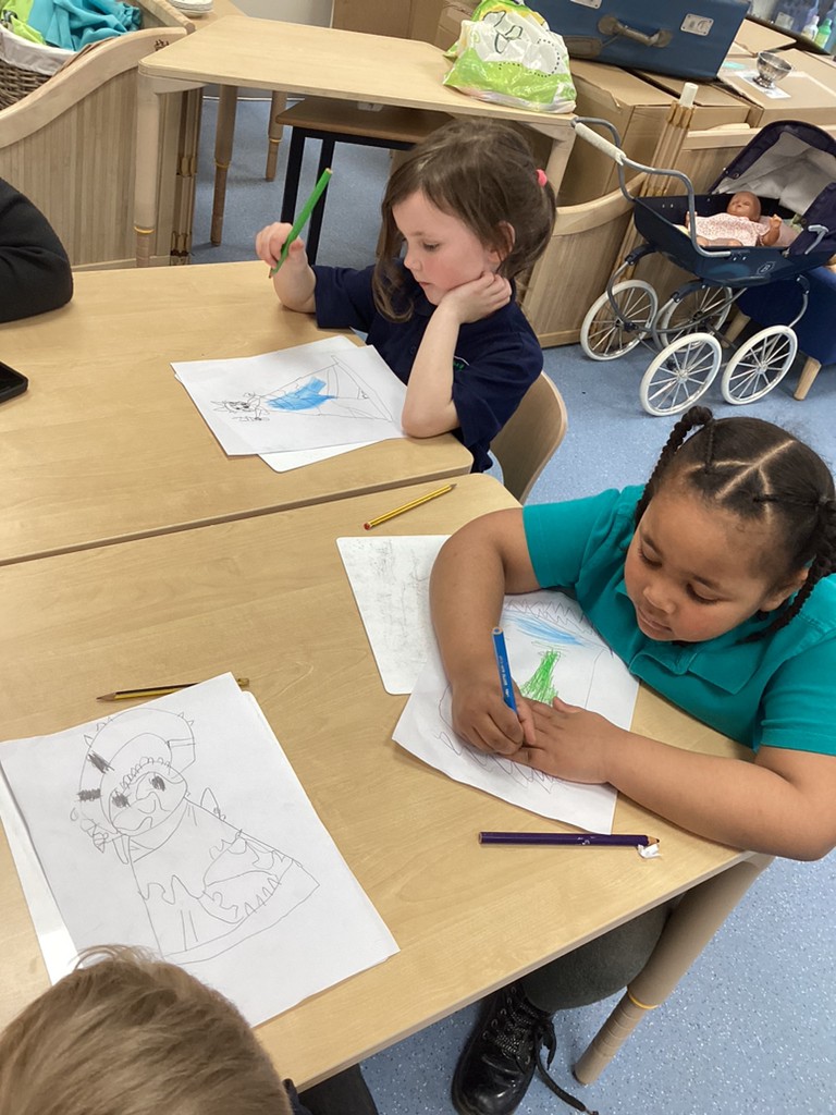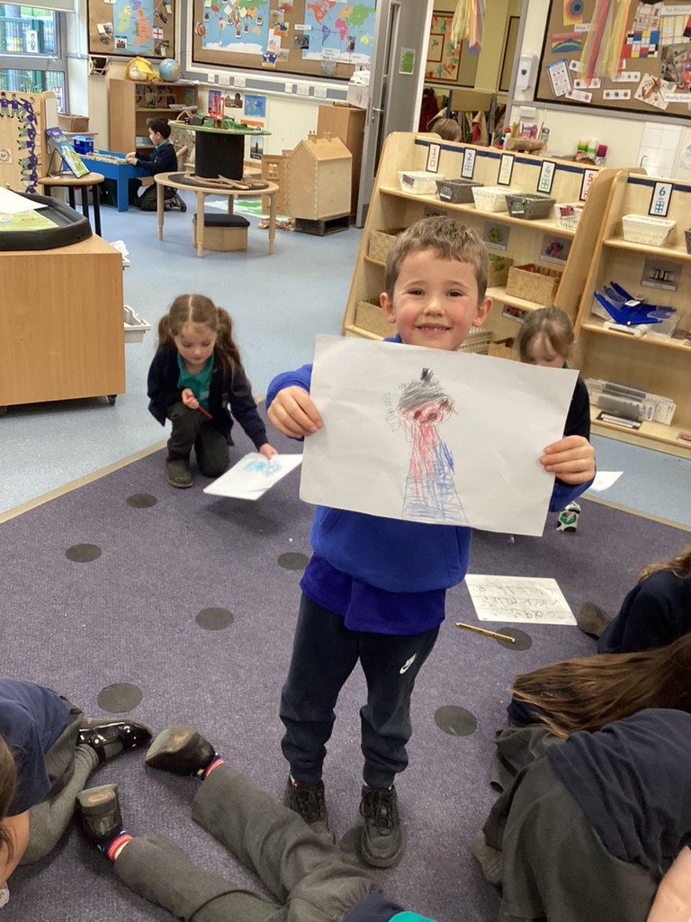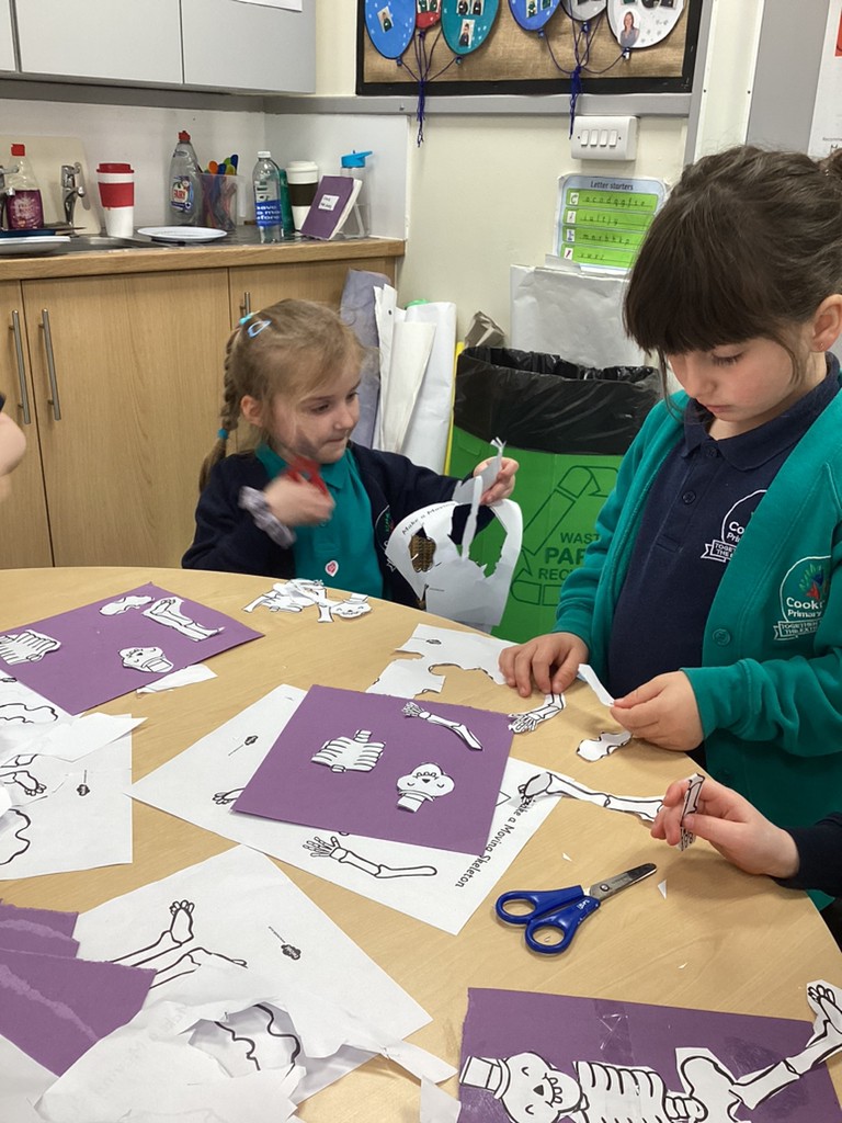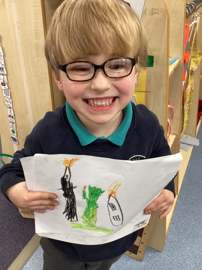 Elsewhere in the classroom the children have created moving puppets of characters from the story ‘Funny Bones’, coloured, cut out and designed our own play parks and acted out roles in our class shop.