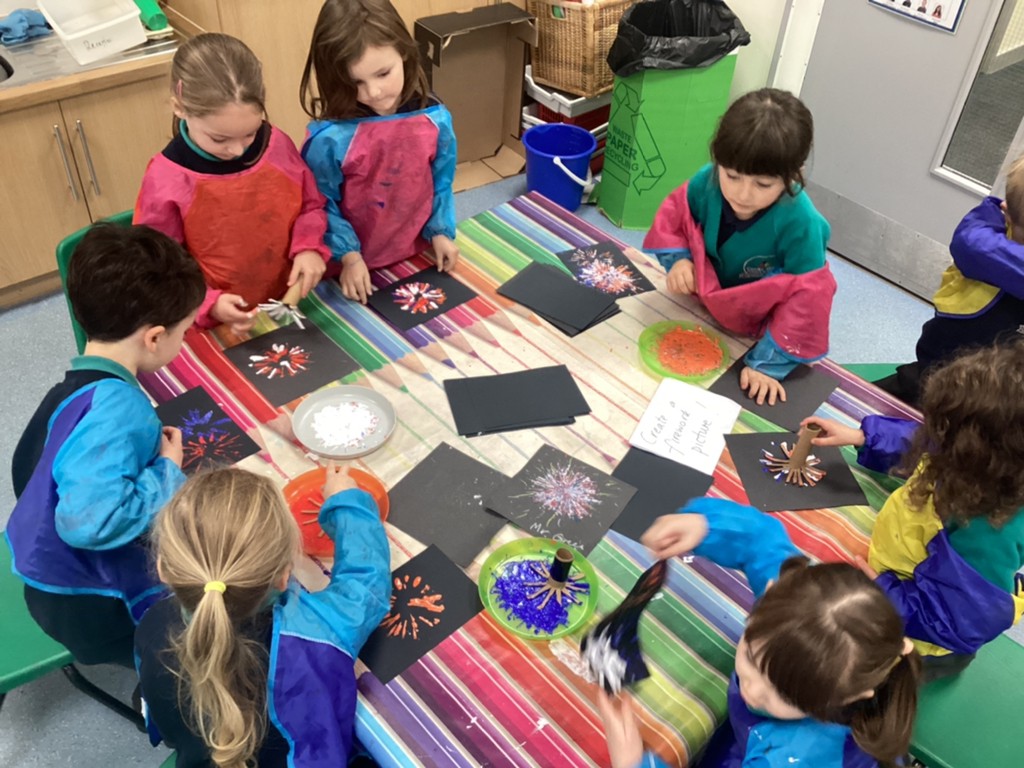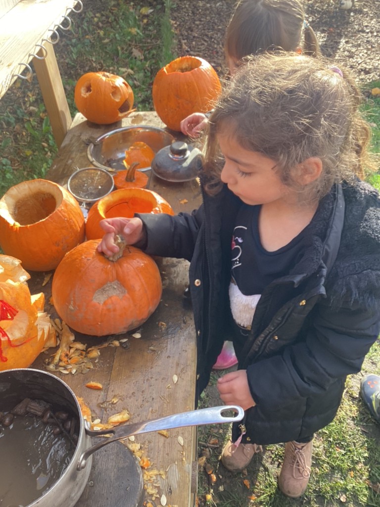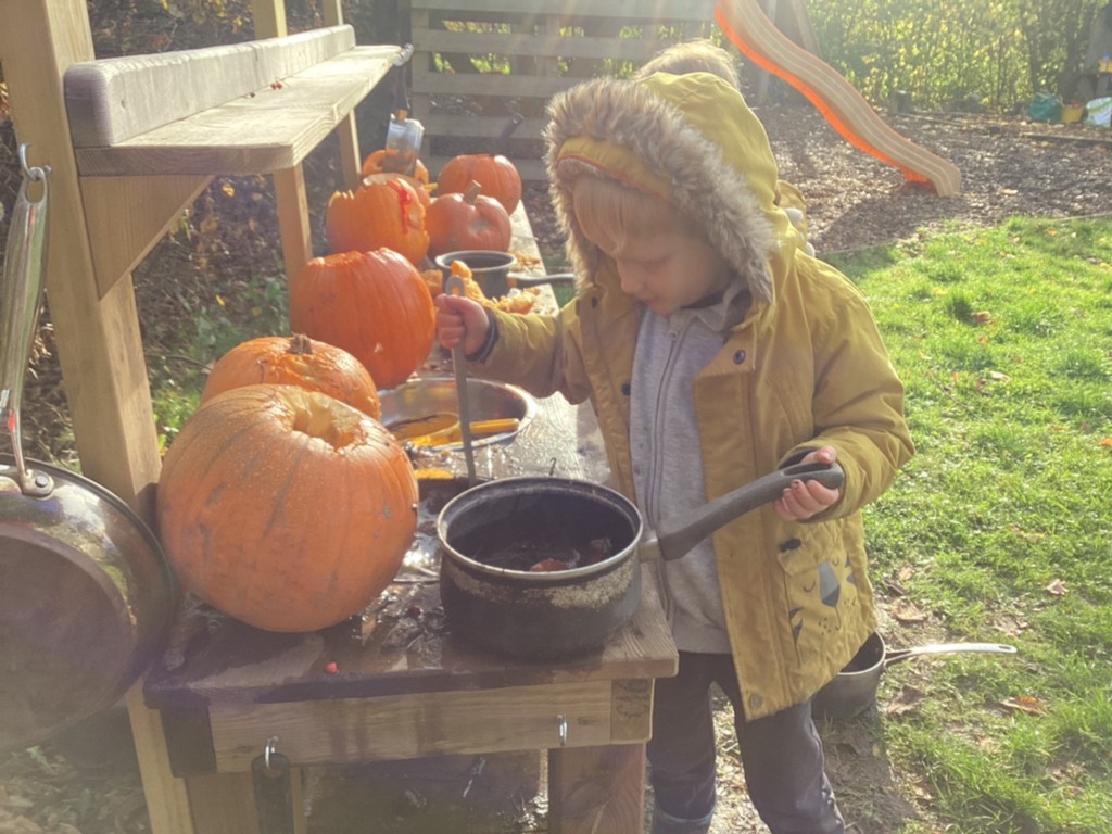 Thursday’s Forest Schools session was themed around Bonfire Night, with children first helping to gather wood for a fire. The fire was then tended until ready to boiling water in order to help melt chocolate. The children meanwhile, helped by chopping apples ready to make chocolate dipped apple treats as a twist on a traditional Bonfire Night snack. There was also chance to make bonfire and firework pictures using natural objects gathered in the garden. Alongside a visit to feed the animals and enjoying a pumpkin heavy mud-kitchen, the children had a lovely morning outdoors.