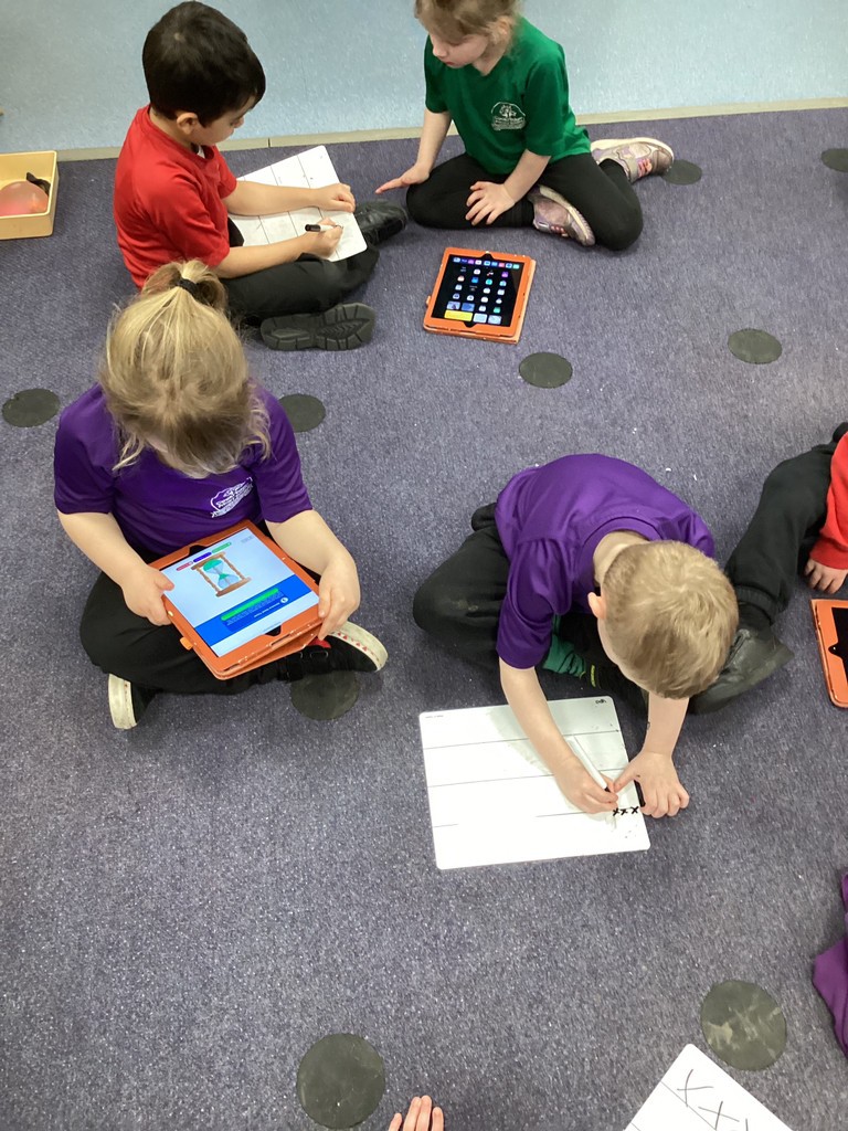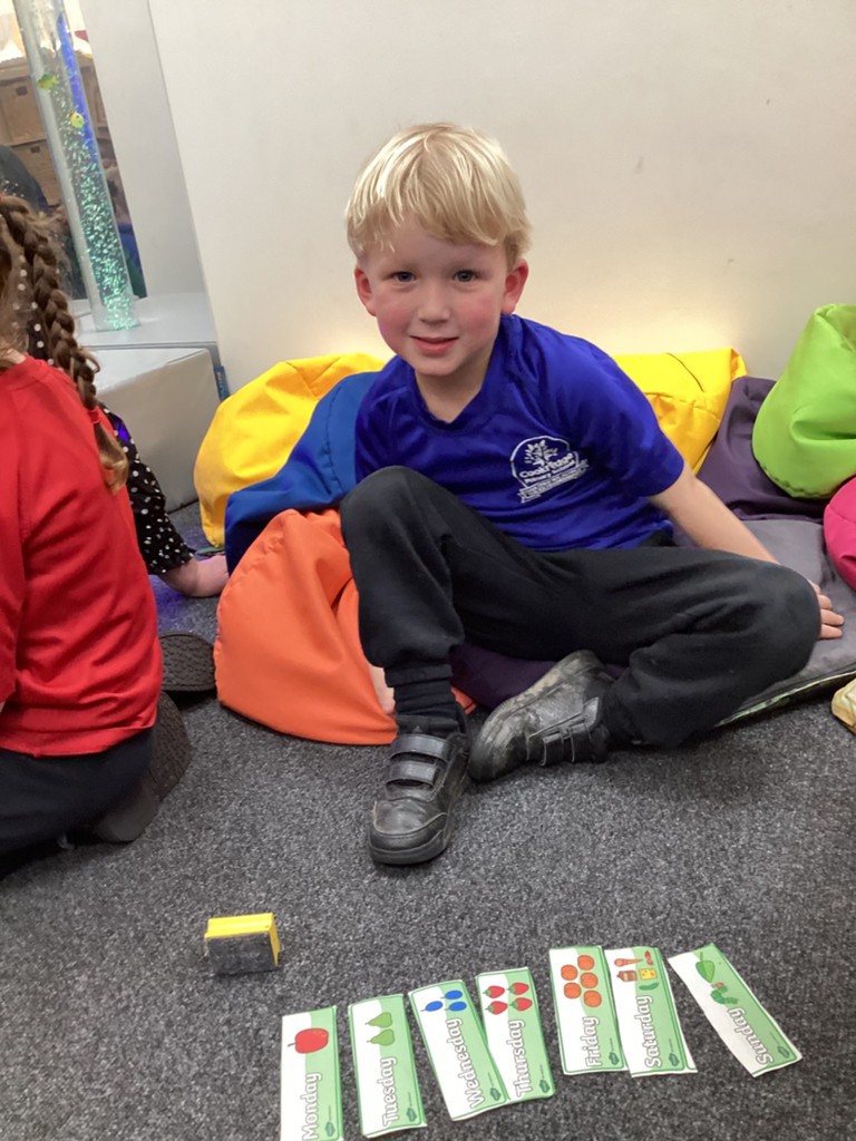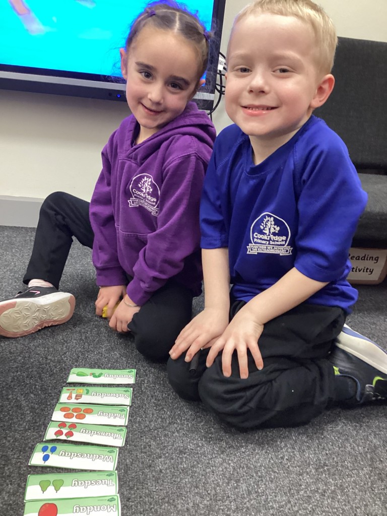 In Maths this week, we have continued exploring the concepts of measuring and talked about how we measure time. This included a discussion around units of time and how we talk about time with words such as today, tomorrow and yesterday. One activity found the children getting to grips with how long a second really is by challenging the children to complete star-jumps, draw circles or touch their toes in ten, twenty or thirty seconds. This helps the children to get a more solid grasp of the meaning of a second or a minute by how much (or little) can be accomplished in these periods. Whilst in the other activity this week, we heard the story of The Very Hungry Caterpillar and used this as a way to help us learn the order of the seven days of the week.