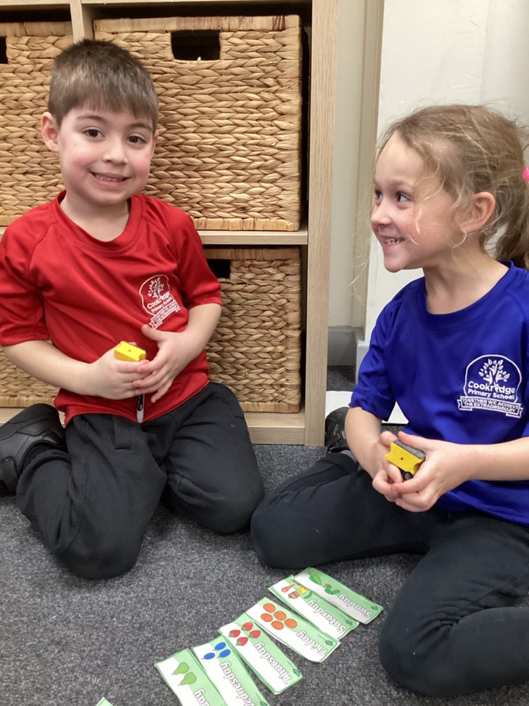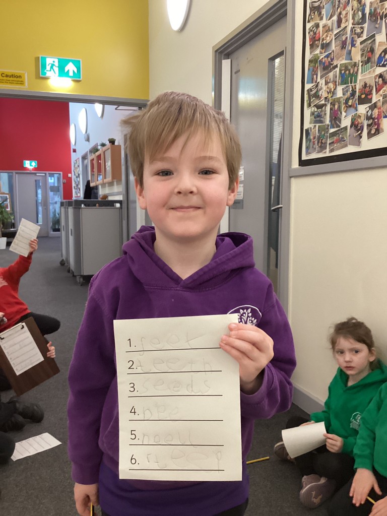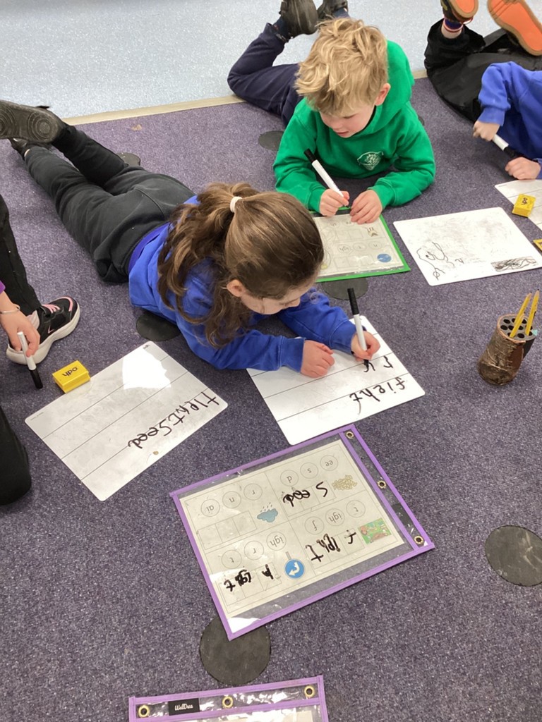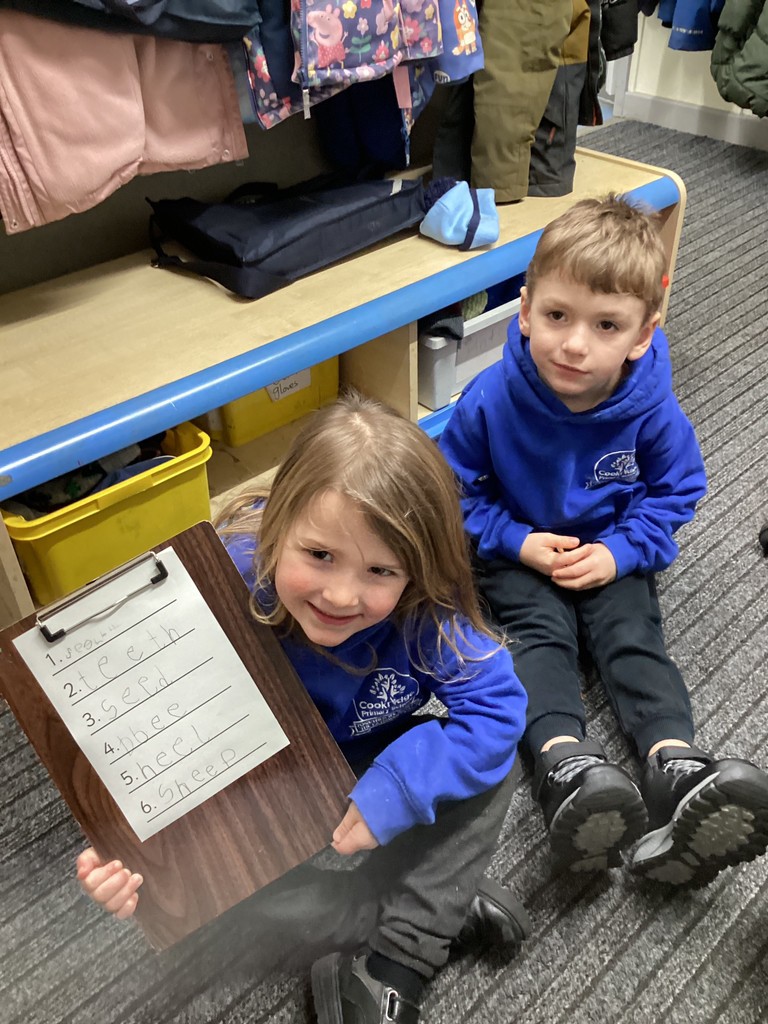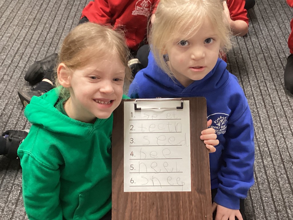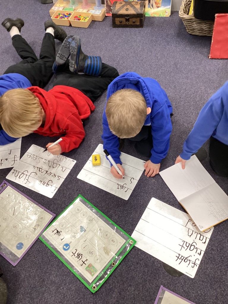 Phonics sessions this week have introduced the long vowel phonemes ‘ai’ (as in snail) ‘ee’ (as in cheese) and igh (as in knight). The children have all taken part in activities to rehearse recognising these sounds when segmenting to spell and in blending these sounds when reading words and phrases. Particularly enjoyable was a word hunt game that required the children to seek out picture cards around school and write labels for those they found.