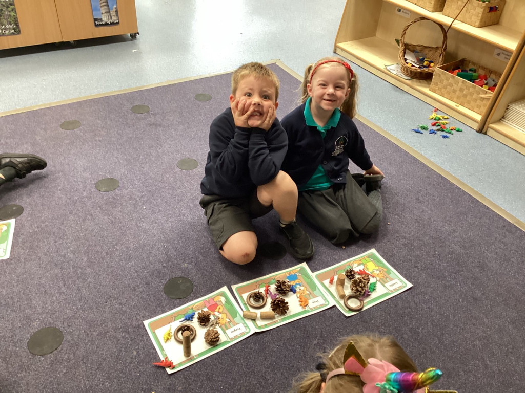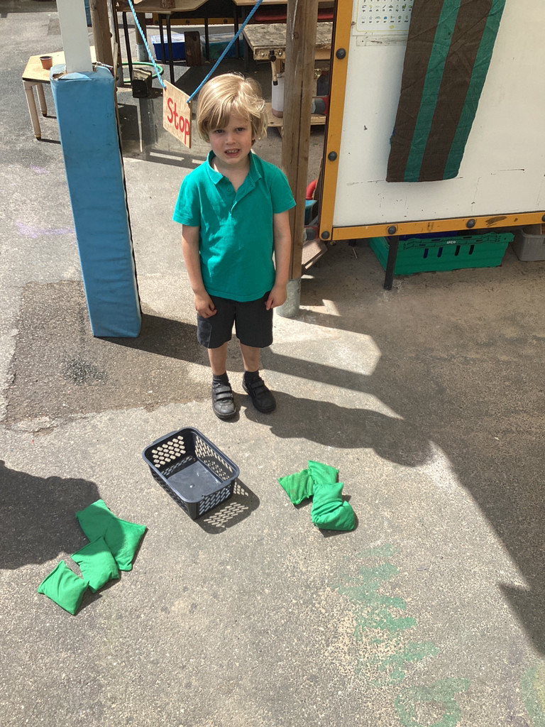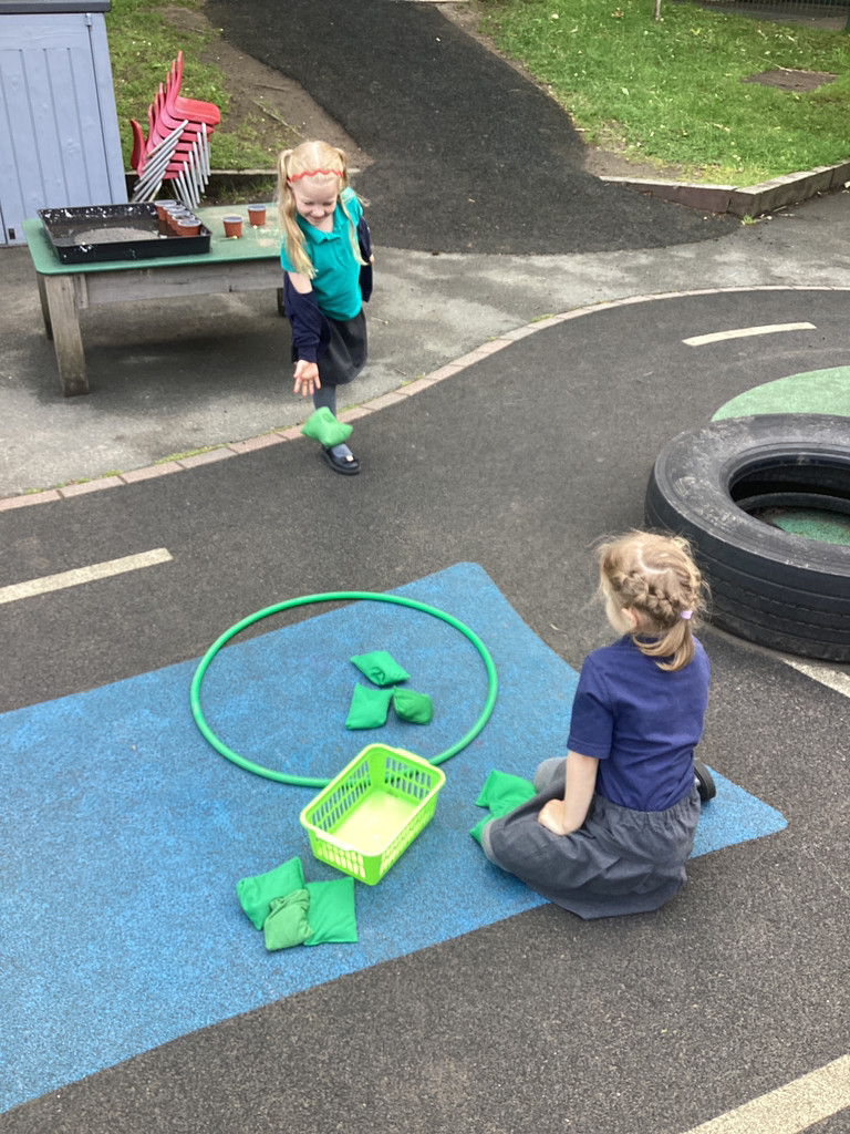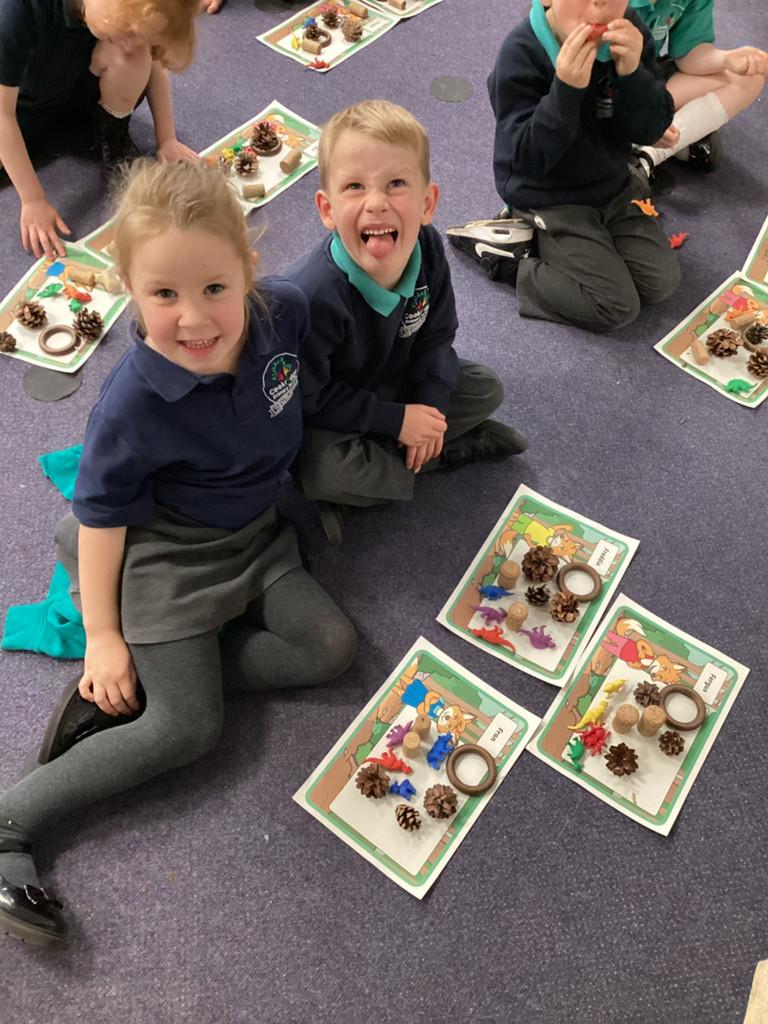 Maths sessions this week have introduced the concept of division via sharing activities. We discussed how when sharing out an amount it must be divided equally so that all groups are the same size. The children explored this practically through a forest-themed treasure hunt, acting out a sharing story called ‘The Doorbell Rang’ which involved sharing out a batch of cookies between friends. Outside the children played a throwing game but first had to share out the beanbags fairly between the group.