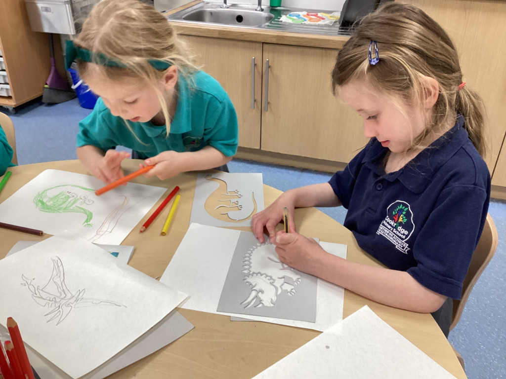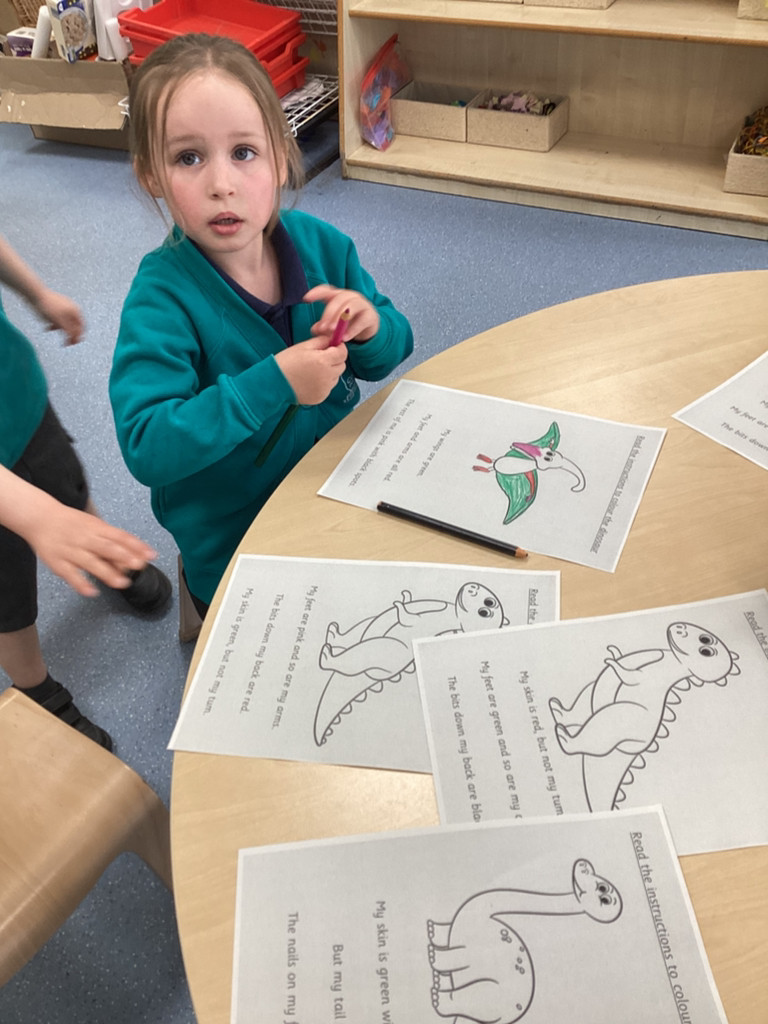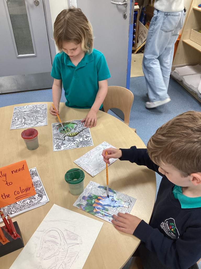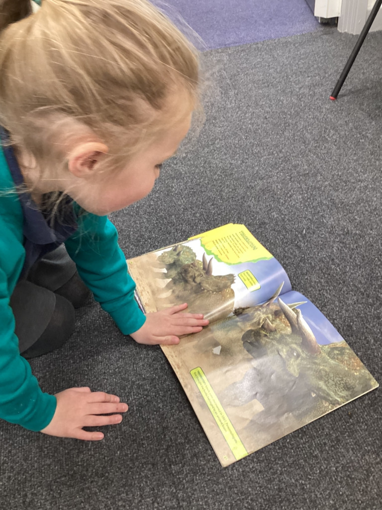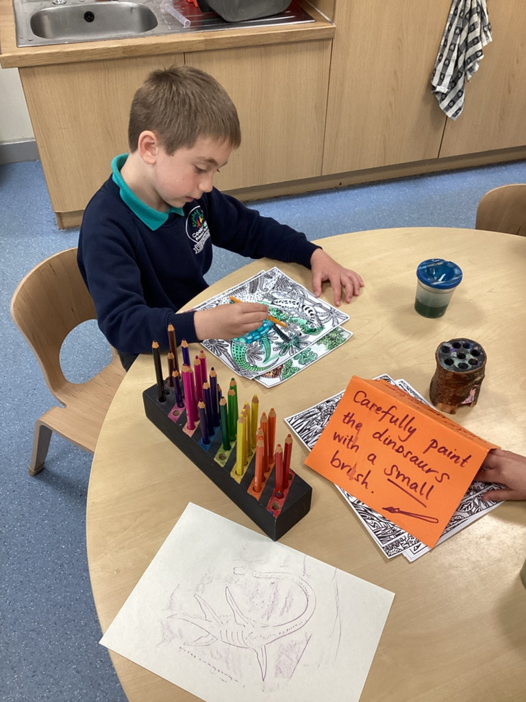 Our latest topic on dinosaurs has begun too this week, with the children starting the week by sharing their knowledge and coming up with questions that they’d like to find answers to over the coming weeks. We have already learned a bit about when dinosaurs lived on planet Earth and some of the different species there were. The children looked at some particular dinosaurs and discussed their various features (such as plates, spines, claws and frills) which allowed them to play a guessing game and become more familiar with these dinos. There has also been some dino art projects, with children using stencils to create prehistoric scenes and colouring in different dinosaurs by following specific instructions. We’ve also had lots of fun with ‘magic’ painting using only water to reveal some colourful dinosaur pictures.