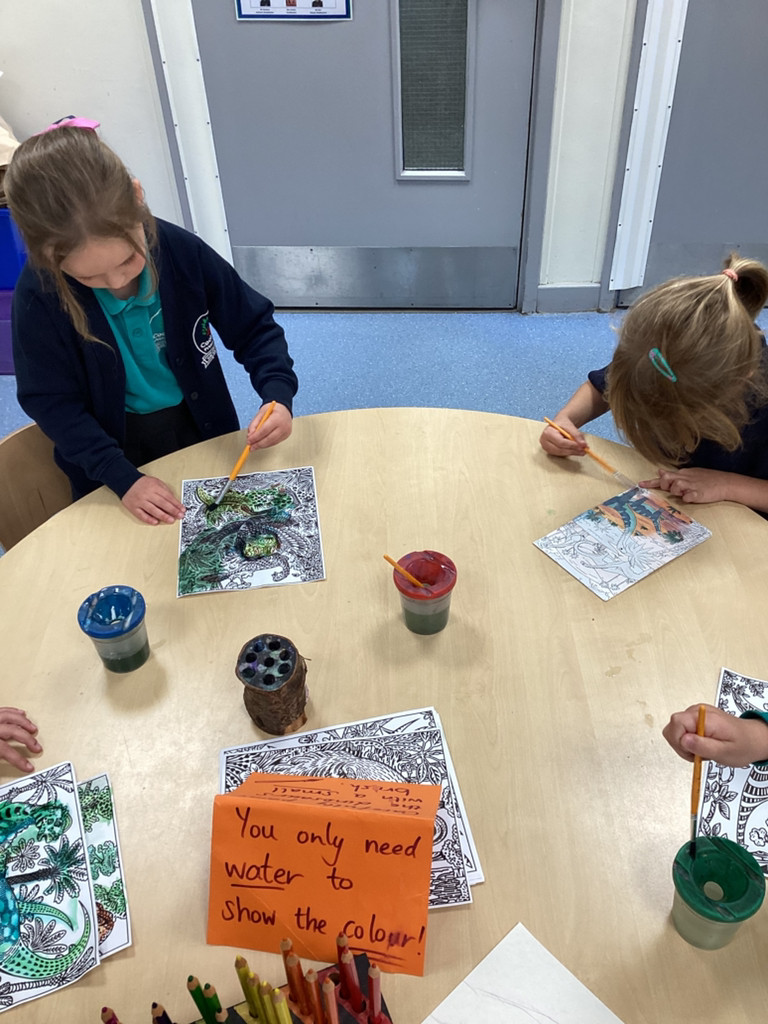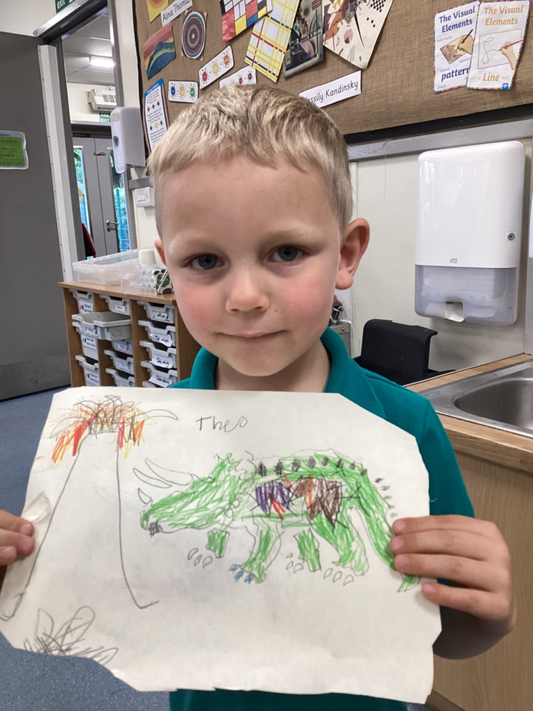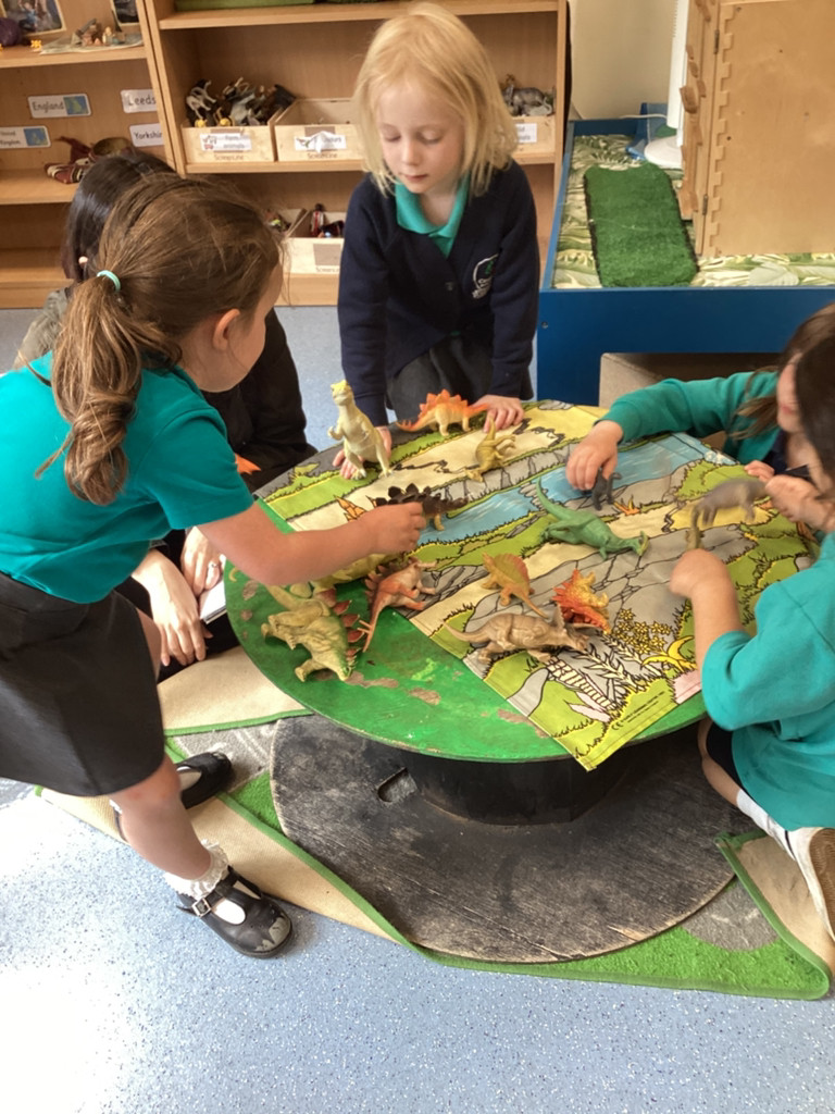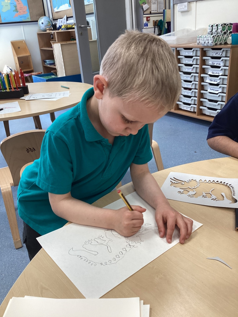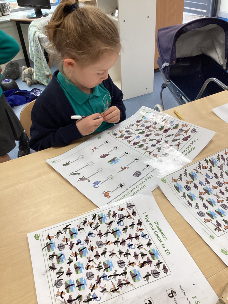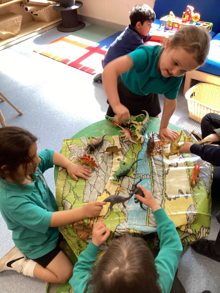 Our latest topic on dinosaurs has begun too this week, with the children starting the week by sharing their knowledge and coming up with questions that they’d like to find answers to over the coming weeks. We have already learned a bit about when dinosaurs lived on planet Earth and some of the different species there were. The children looked at some particular dinosaurs and discussed their various features (such as plates, spines, claws and frills) which allowed them to play a guessing game and become more familiar with these dinos. There has also been some dino art projects, with children using stencils to create prehistoric scenes and colouring in different dinosaurs by following specific instructions. We’ve also had lots of fun with ‘magic’ painting using only water to reveal some colourful dinosaur pictures.