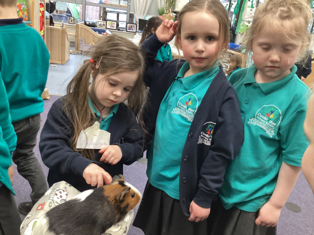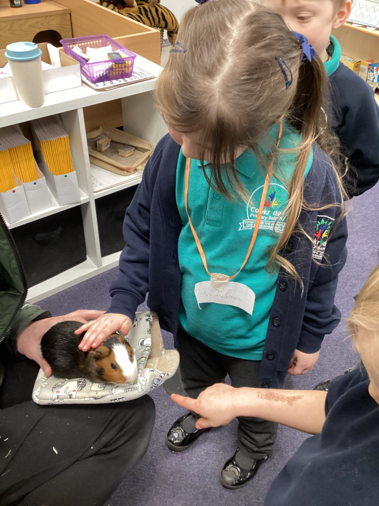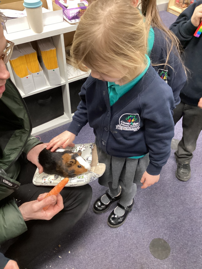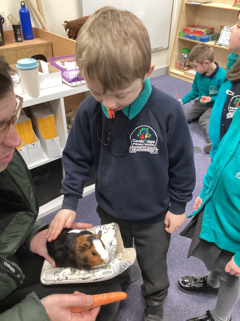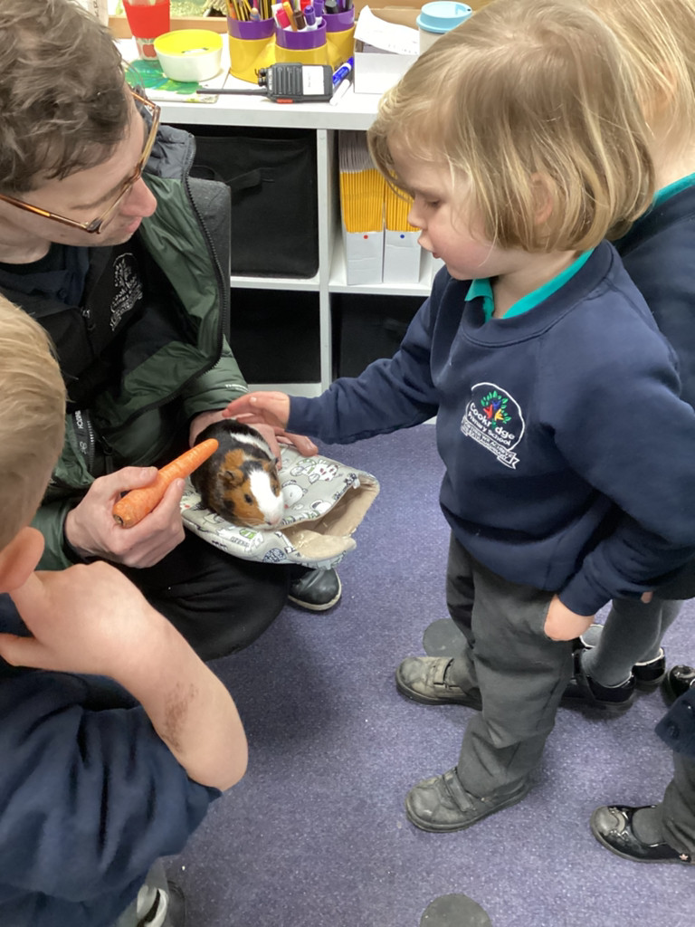 Our Cookridge Pet of the Week was Marshmallow the guinea pig. Marshmallow is sadly our last surviving guinea pig in school and this week he paid a visit to Reception so we could take a closer look and learn some interesting facts about these popular pets. Of course the one that most will probably remember is that guinea pigs will eat their own poo!