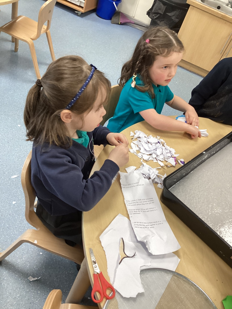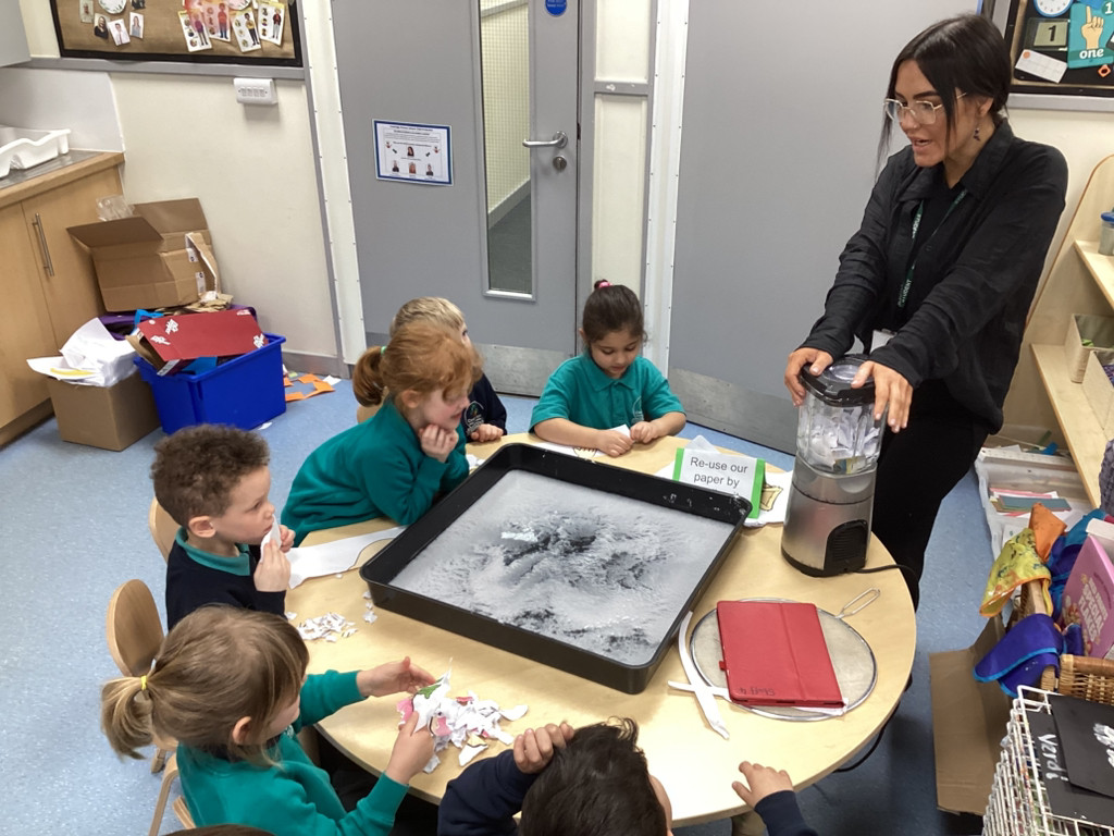 On Friday, we even had a go making our own paper from the used and scrap paper and card that we collect in our class recycling bin. It was a messy but fun affair – and hopefully, as it dries out we hope to be able to use our own recycled paper next week!