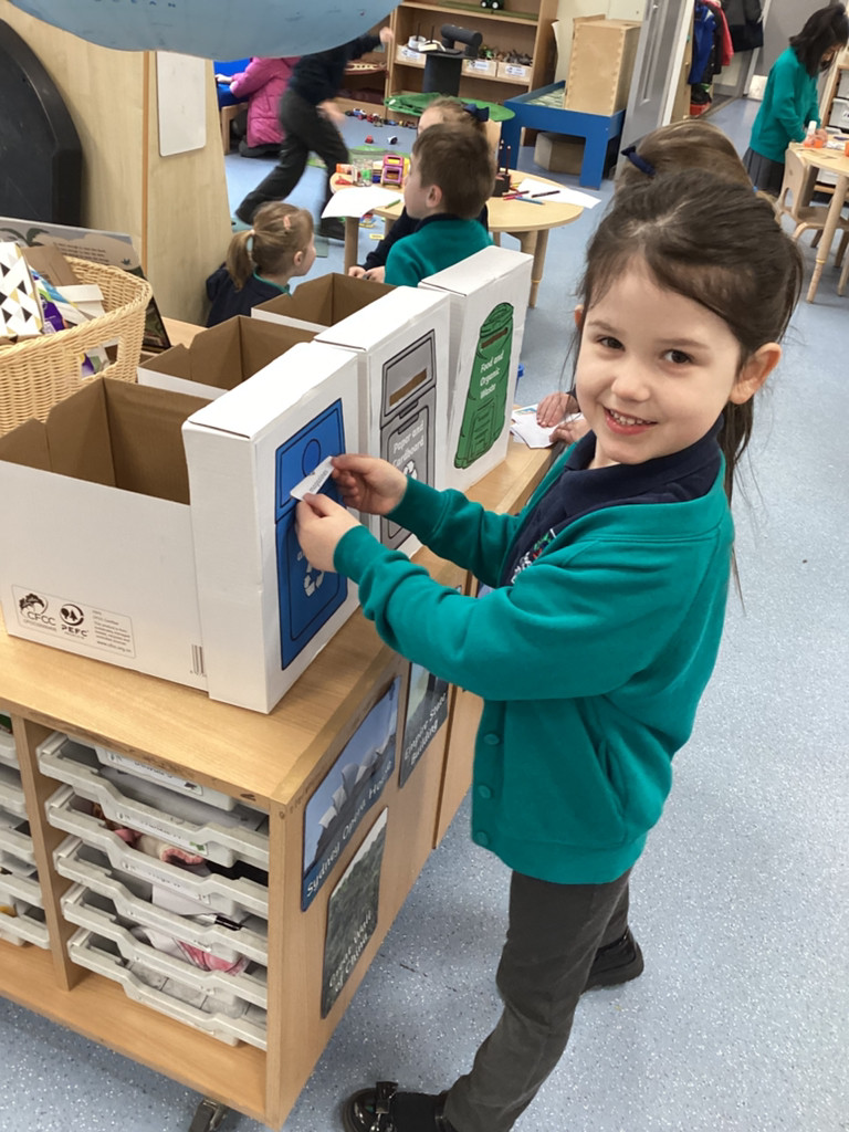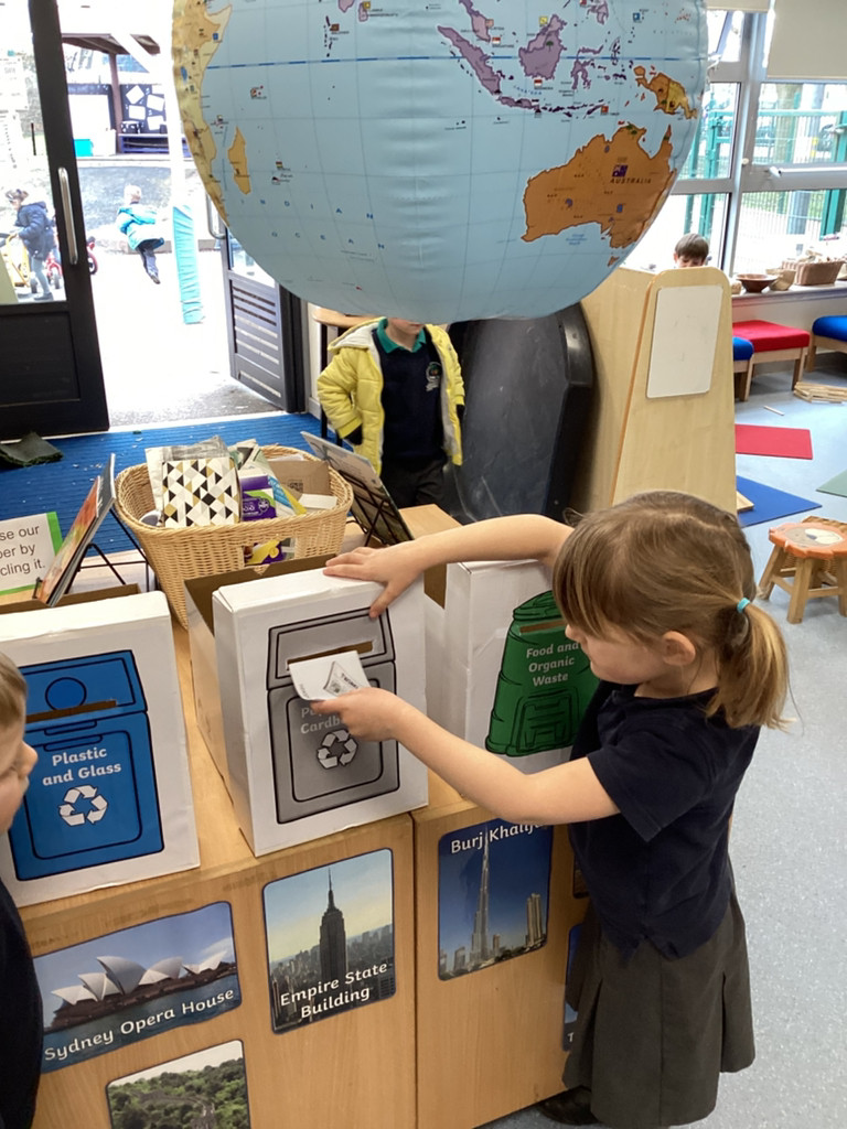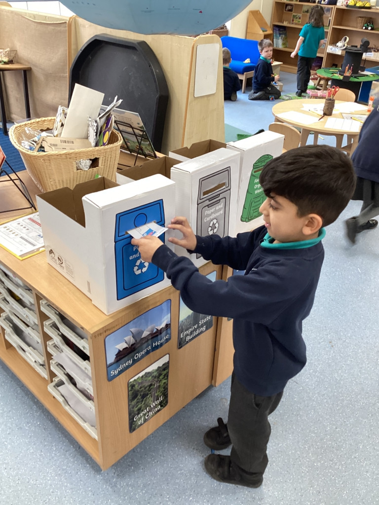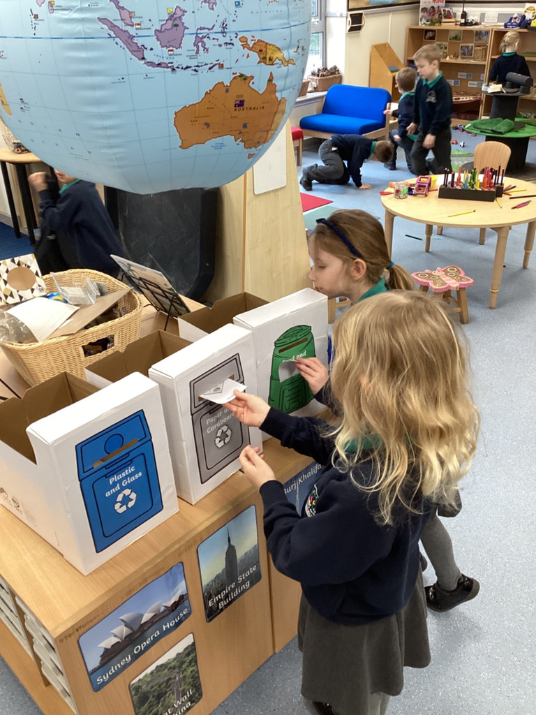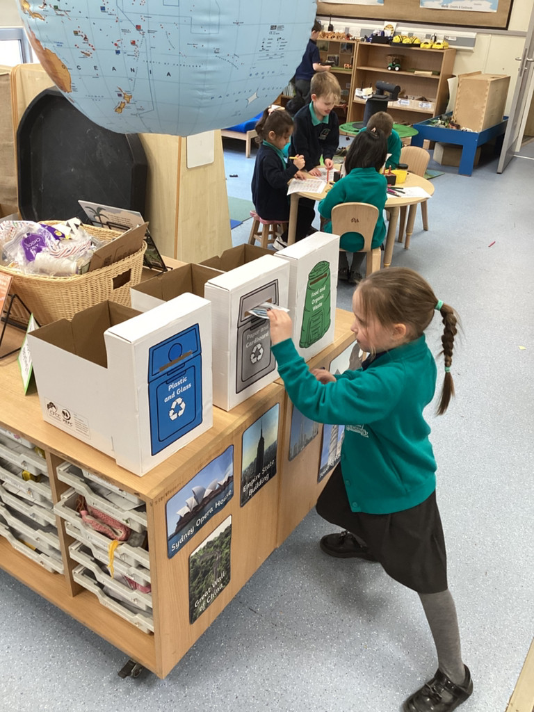 Whilst learning all about locations across the globe this topic we have also taken time to think about how we can take care of our planet and the environment we all share. We learned all about recycling and how we have a responsibility to reduce, reuse and recycle the materials we use in everyday life. The children then were encouraged to sort some typical household items into their appropriate recycling bin.