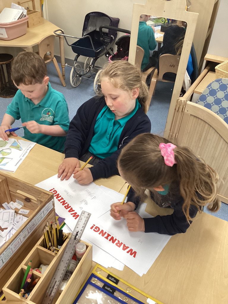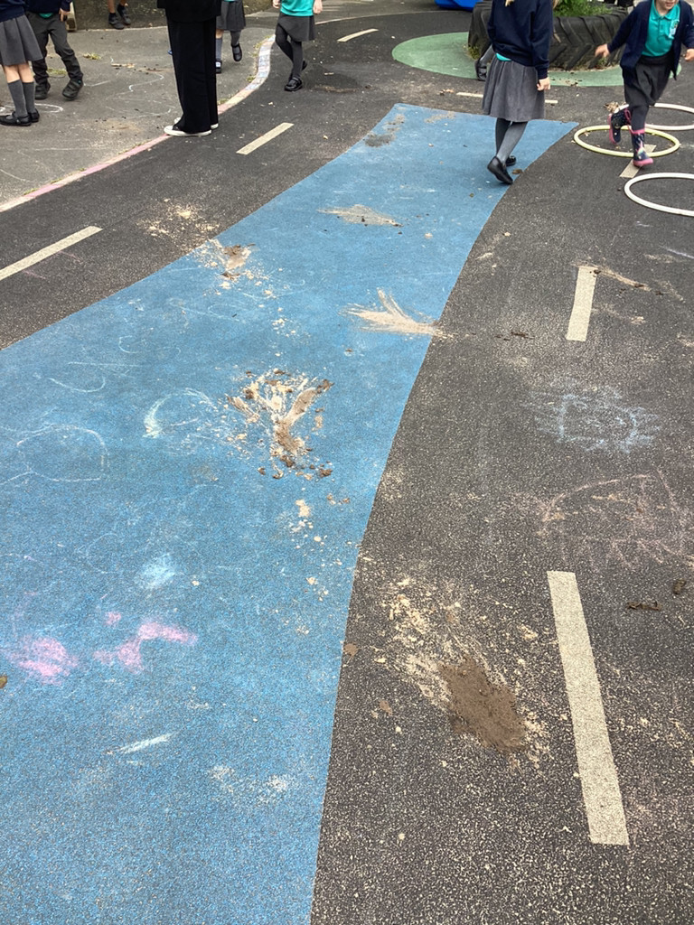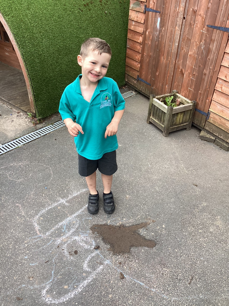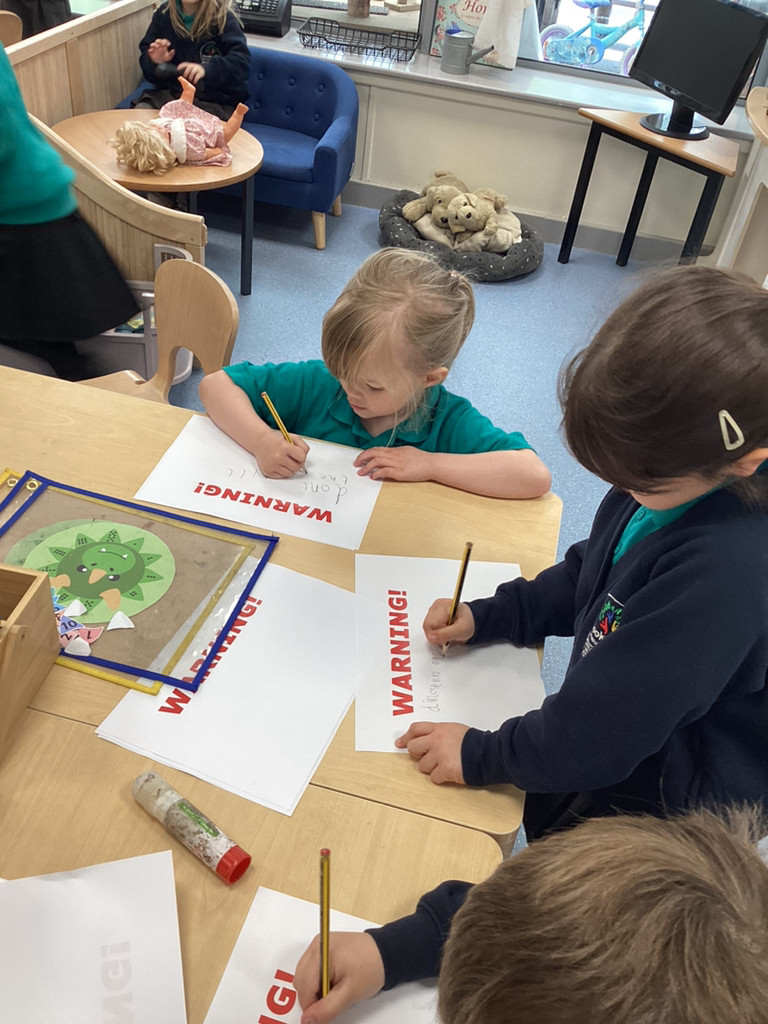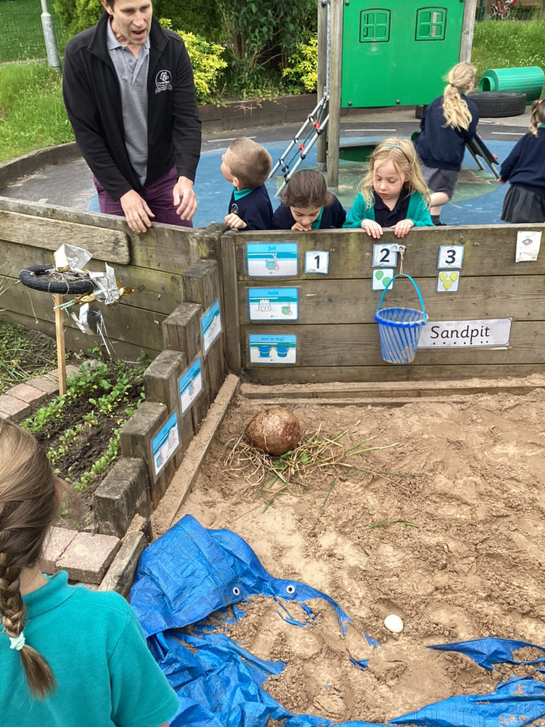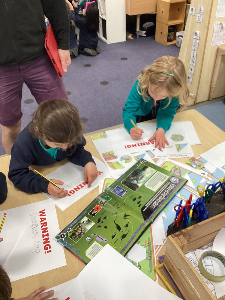STOP THE PRESS!!! On Friday morning, Reception made a very exciting discovery in the playground. As we went outdoors to explore, we were met with a trail of destruction and muddy prints that led to the sandpit. In the sandpit we discovered a large egg! The children were quick to look for clues and started making some startling conclusions. As we went on a hunt through the grounds, the children were eagle-eyed in spotting further clues as we potentially trailed the mummy dinosaur that had left us her egg to look after. There were prints, scratches, broken branches and vegetation strewn about the place, which led the children to conclude we must be dealing with a herbivore. Upon finding Nigel and Donut happily roaming their enclosure the children were confident that we are not looking for a carnivorous dinosaur – which came as a relief to many who had been worrying! Mr Coulson kindly let us borrow some special gloves so that we could move the egg indoors, whilst he went to check if the school’s security cameras had caught any glimpses of the mystery intruder. Meanwhile, the some children got busy in making some brilliant posters to warn the rest of the school of our exciting discovery and any potential dangers and others got busy cleaning up the mess that had been left behind!