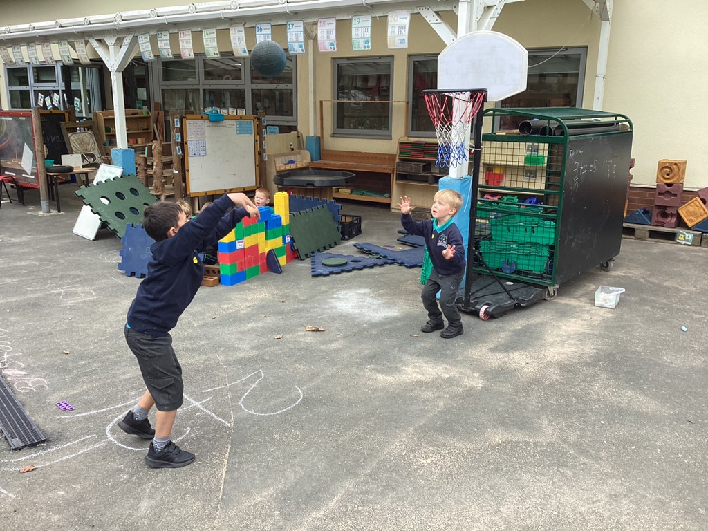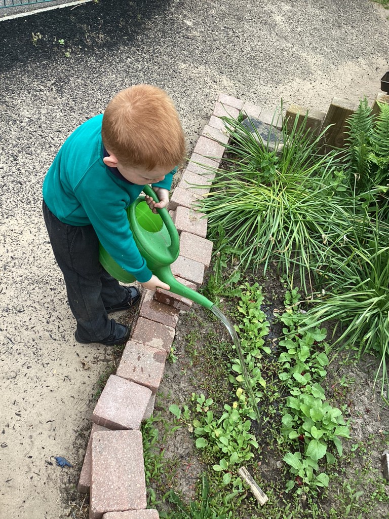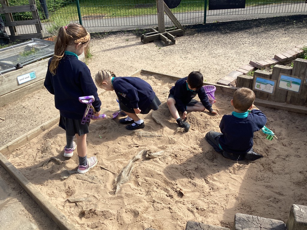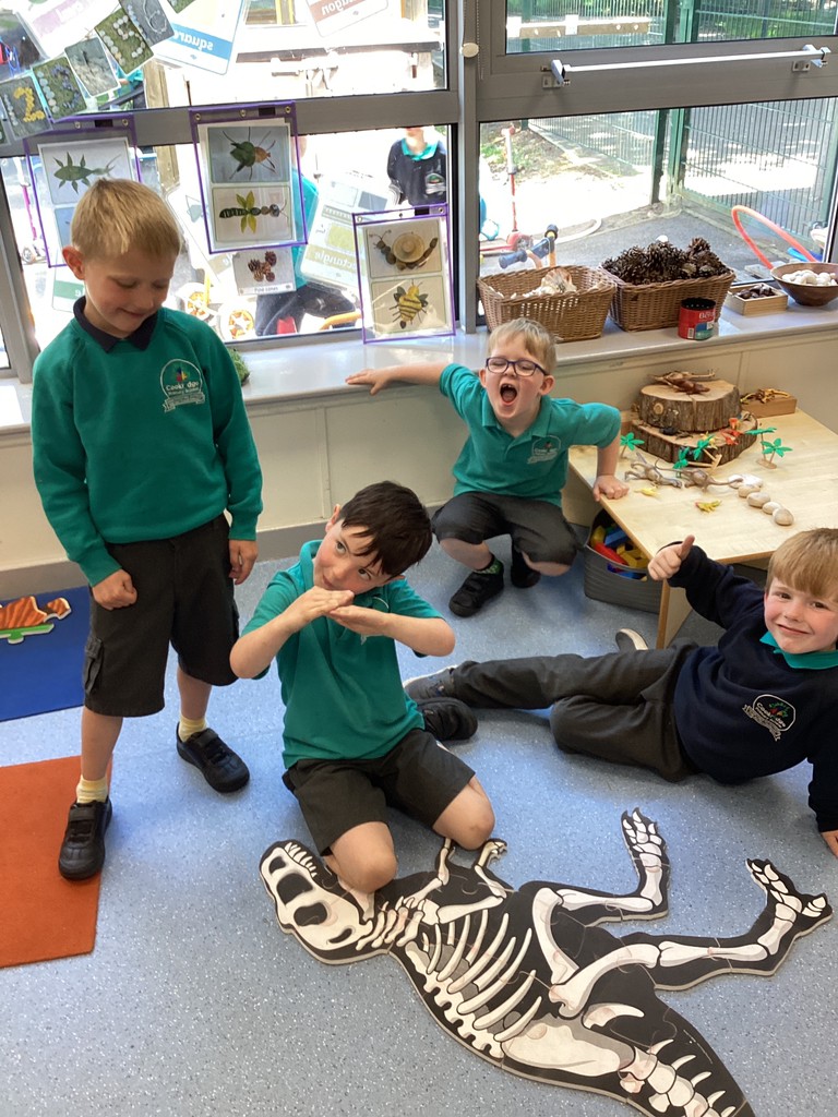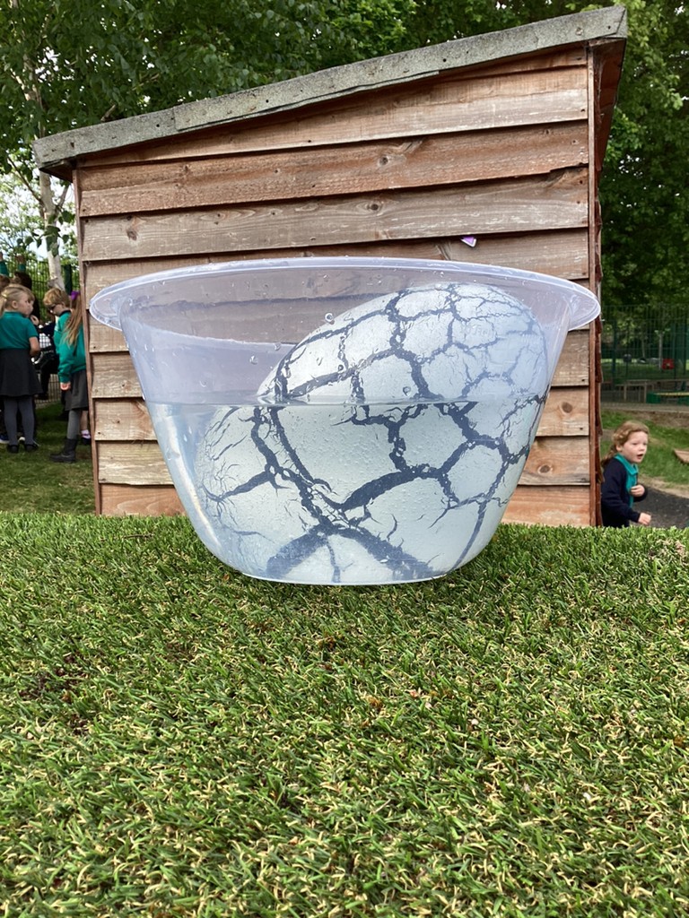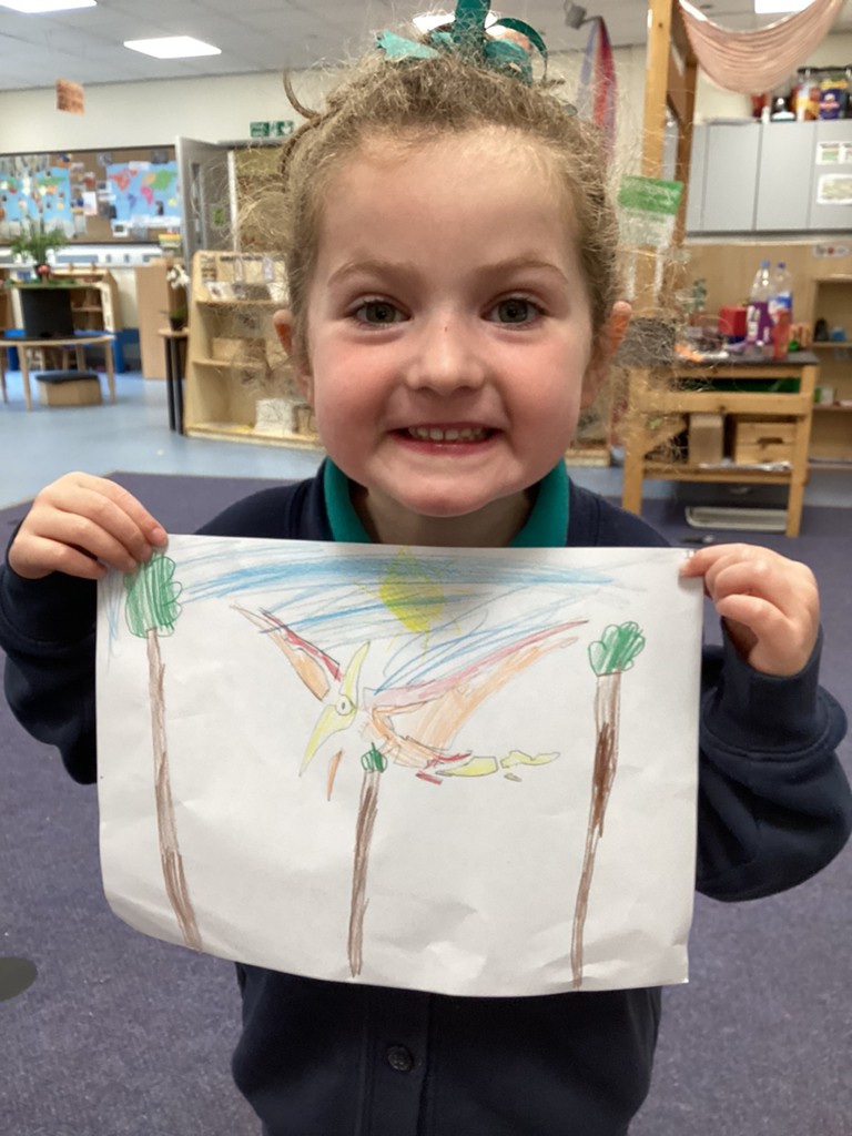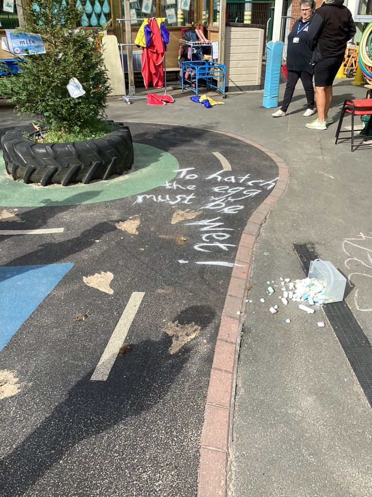 Our topic for the last half term of the year is Dinosaurs and we’ve had a great deal to talk about already. When the children arrived to school on Monday, a giant egg lay in the middle of the classroom. There was much confusion and we discussed what might be inside, with children choosing to write and draw their predictions. There has also been lots of dinosaur themed activities for the children to get stuck into, with many choosing to make dinosaur artworks, complete on of our large dinosaur puzzles or dinosaur egg letter matching. Most exciting of all, however, was when we arrived at school on Friday to find a trail of muddy prints across our outdoor area and a special message scrawled on our playground! Even more thrilling was a CCTV clip that our caretaker had passed on of a rather large dinosaur plodding around outside our classroom! The children were eager to investigate more, and they were full of ideas and theories about what had happened, and where the mummy dinosaur had gone off to. We took an explore through the garden and field to hunt for clues – of which there were many! We have been told to keep the dinosaur egg wet in order for it to hatch, so with many keen eyes watching it, hopefully it won’t be long until something pops out.