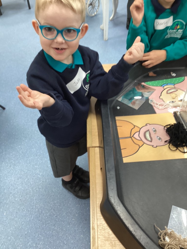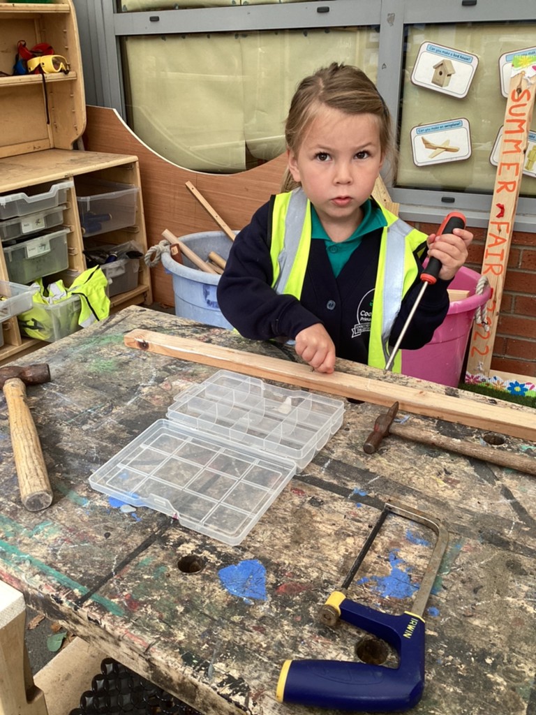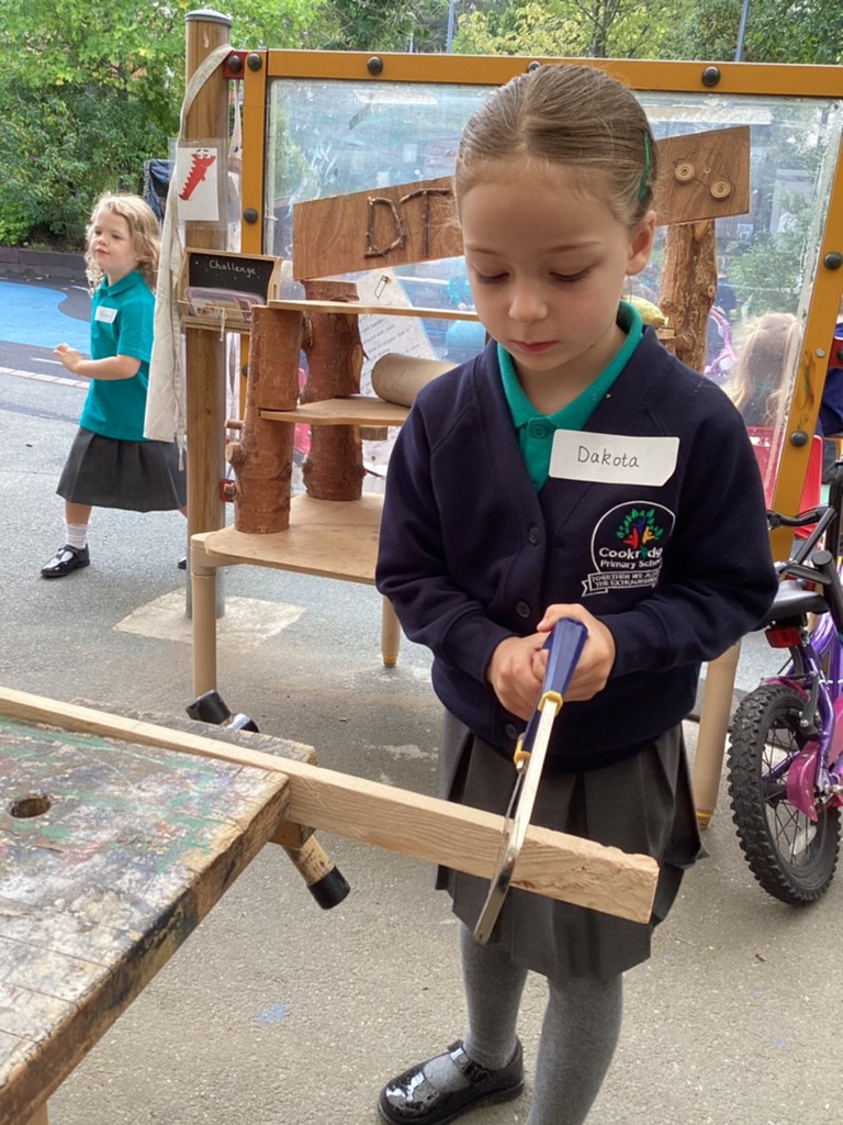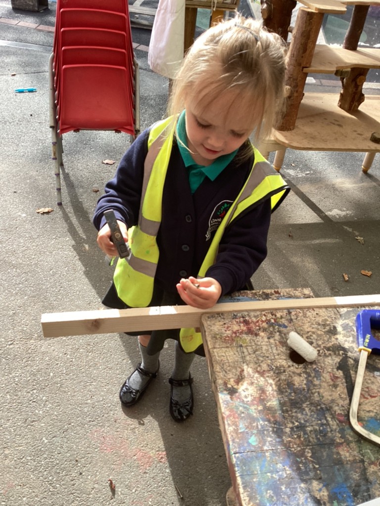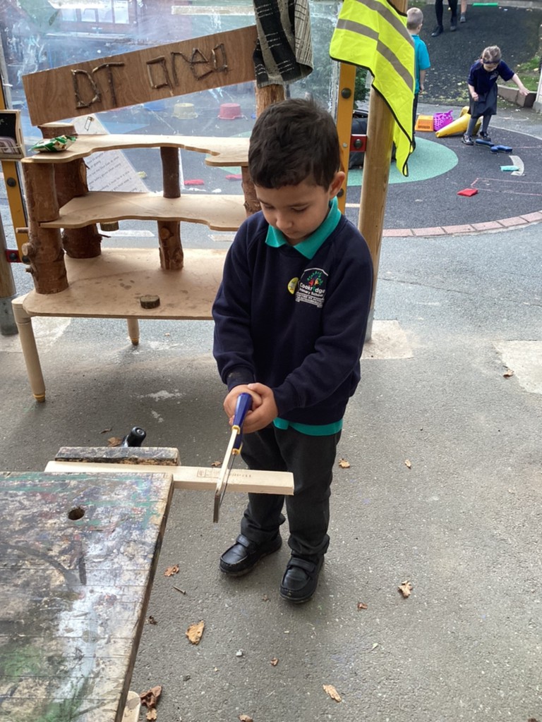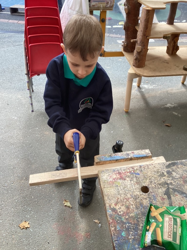 All areas of the classroom have been well used, with children having a go at making their own faces from a selection of features; drawing the people and pets that live in their home and singing their favourite songs on the stage! Our D.T. construction area has been particularly popular with many children choosing to learn safe techniques to cut and join wood to make models of their own.