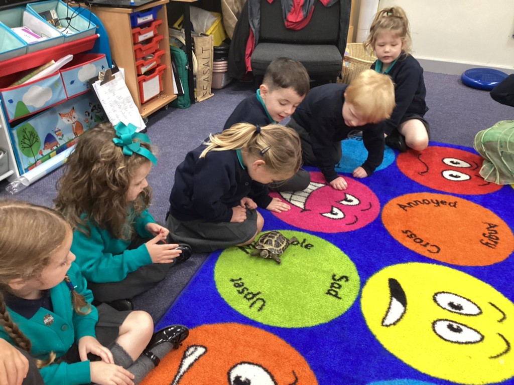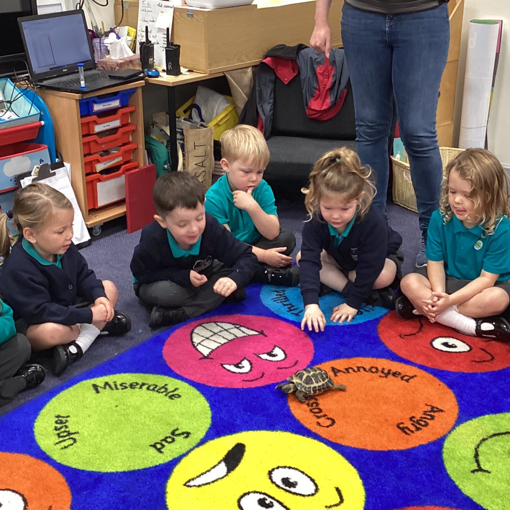 Tortellini the class tortoise has been very popular this week, with children keen to help feed him and watch him get some exercise on the carpet.
