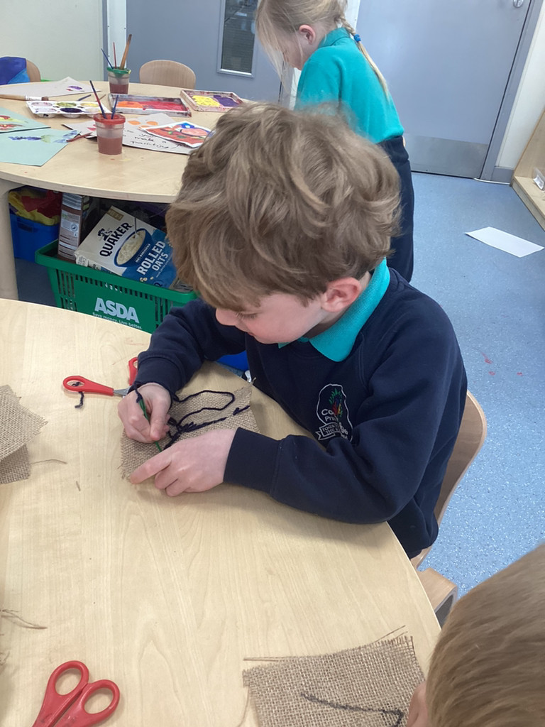 Following on from last week where children hand-sewed some flower decorations for our scarecrow Maizie (who returned to Cookridge this week and found a home in the Kitchen Garden) we saw that the children really enjoyed having a go at using a needle and thread. This week. we have the children their initials on a sqaure of hessian cloth for them to sew along the lines using a basic running stitch. We were very impressed by how much effort and perseverance the children showed when working on their sewing and it was lovely to see how proud they were of their work.