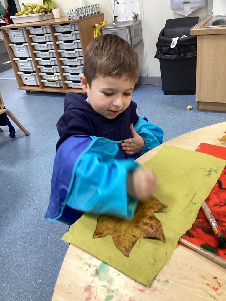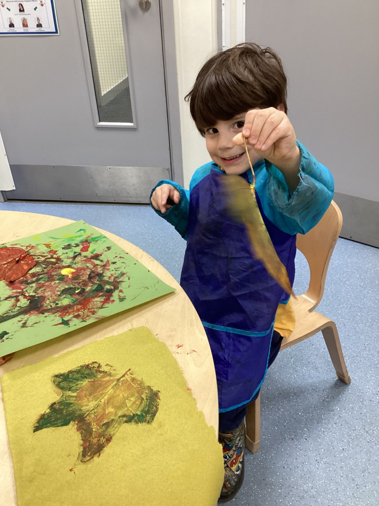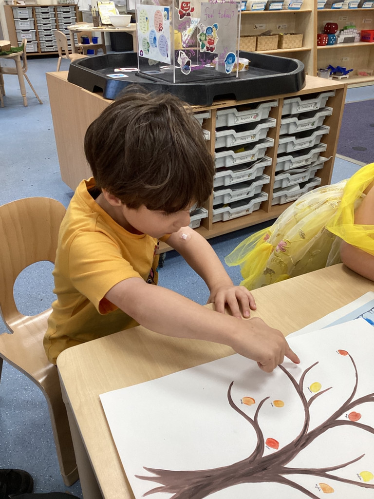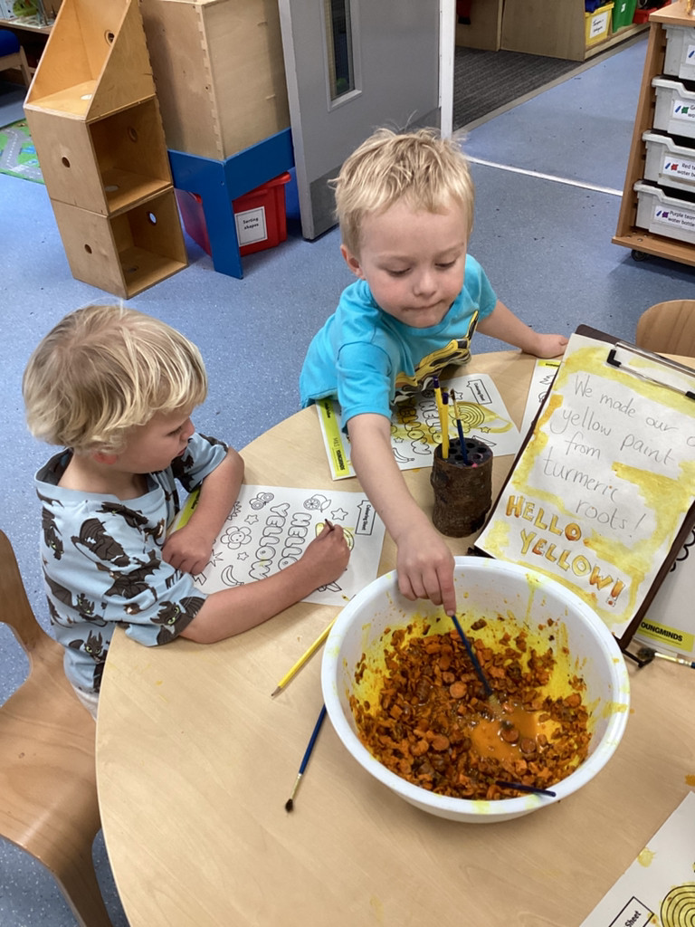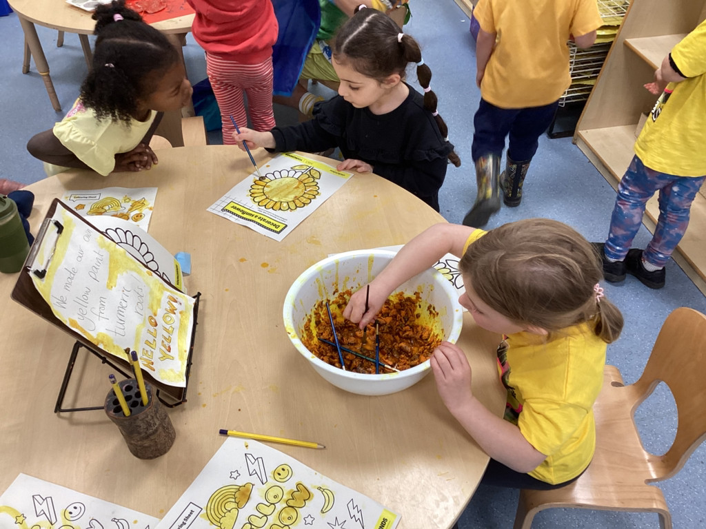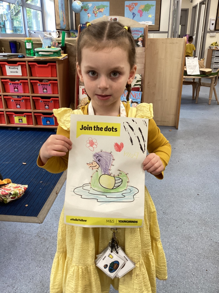 What a brilliant week we’ve had in Reception! A real highlight was Thursday’s school-wide ‘Hello Yellow!’ day to raise awareness of children’s mental health charity Young Minds. After some yoga, meditation and nature bathing outdoors during Forest School (please see Mr Gamble’s web-post for pictures) we brought some lovely autumn leaves indoors to have a go at some leaf printing. All children were invited to paint a leaf and print it onto some yellow fabric to make their own yellow flag which they were very happy to take away to wave hello to the weekend! We had also brought back to class the cooked turmeric that we used to stain Mr Verdi’s tee-shirt yellow that morning and used this to make some natural yellow paint, which the children used to colour in some pictures. Finally, the whole class added their own fingerprint to represent a leaf on an autumnal tree. This tree helps us to see Reception as one big community and we’re all able to help each other and support each other’s mental health (sometimes Mrs Andrews really needs a smile and a cuddle!).