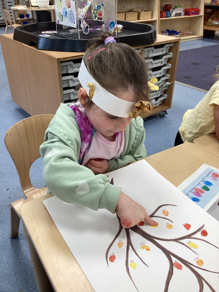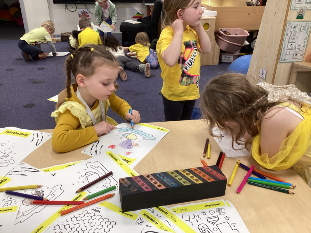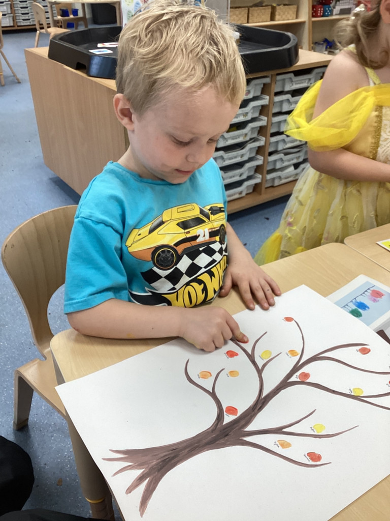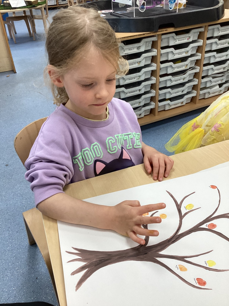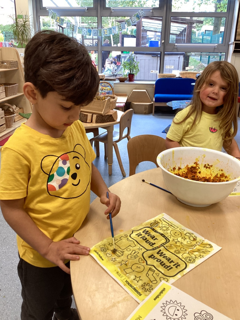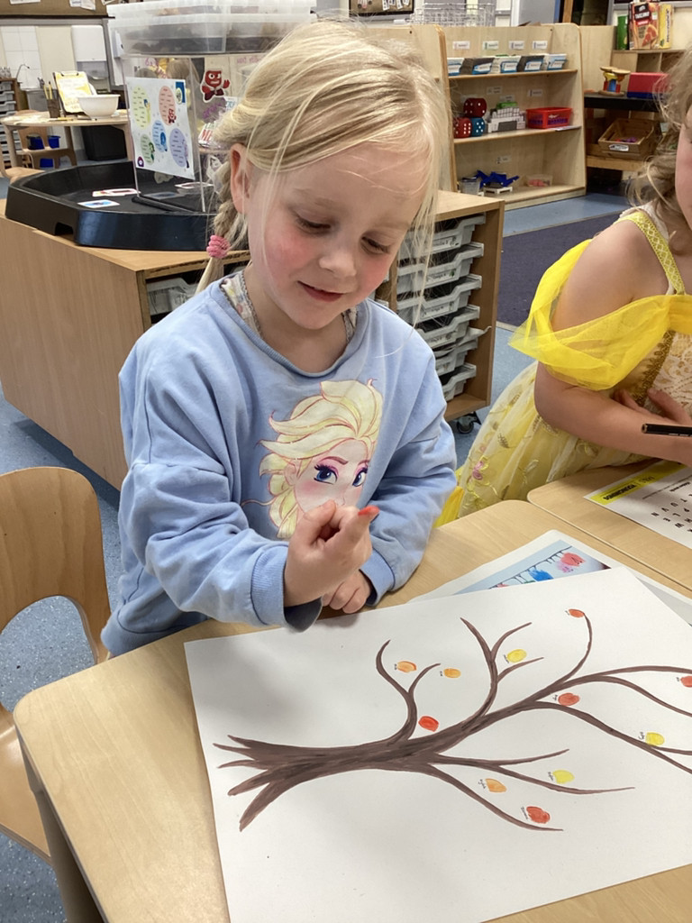 What a brilliant week we’ve had in Reception! A real highlight was Thursday’s school-wide ‘Hello Yellow!’ day to raise awareness of children’s mental health charity Young Minds. After some yoga, meditation and nature bathing outdoors during Forest School (please see Mr Gamble’s web-post for pictures) we brought some lovely autumn leaves indoors to have a go at some leaf printing. All children were invited to paint a leaf and print it onto some yellow fabric to make their own yellow flag which they were very happy to take away to wave hello to the weekend! We had also brought back to class the cooked turmeric that we used to stain Mr Verdi’s tee-shirt yellow that morning and used this to make some natural yellow paint, which the children used to colour in some pictures. Finally, the whole class added their own fingerprint to represent a leaf on an autumnal tree. This tree helps us to see Reception as one big community and we’re all able to help each other and support each other’s mental health (sometimes Mrs Andrews really needs a smile and a cuddle!).