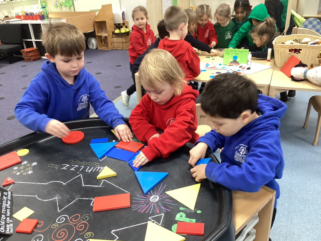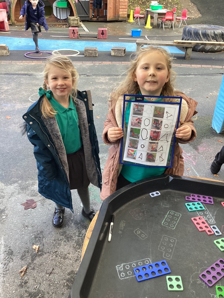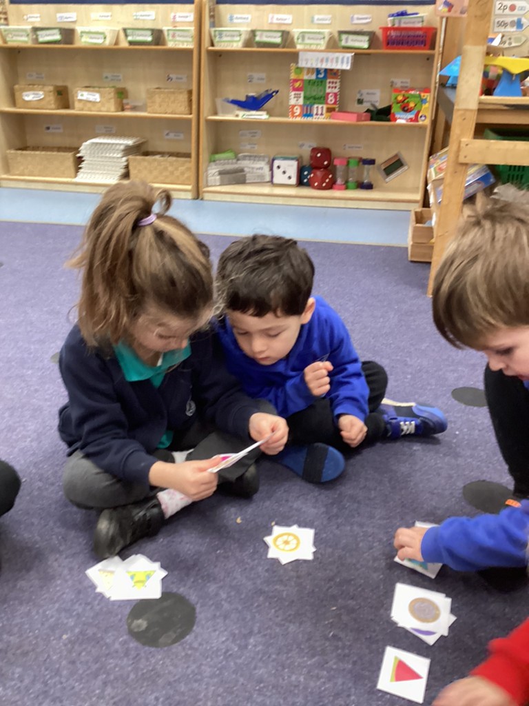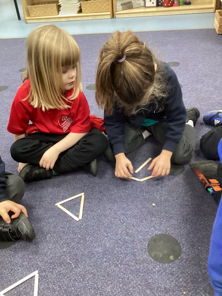 In Maths sessions, we have been exploring the 2D shapes of circles and triangles. The children have practised recognising these shapes and talking about their properties (how many sides/corners) as well as recognising how these shapes can appear in so many places all around us as they went on a shape hunt around the school.