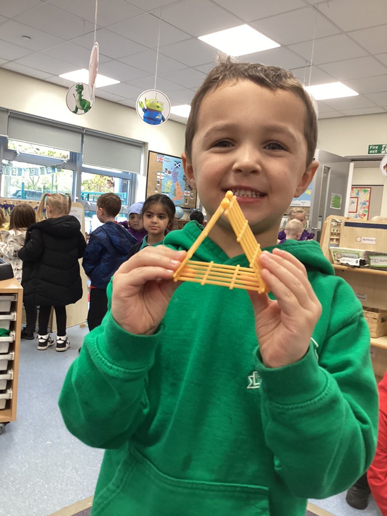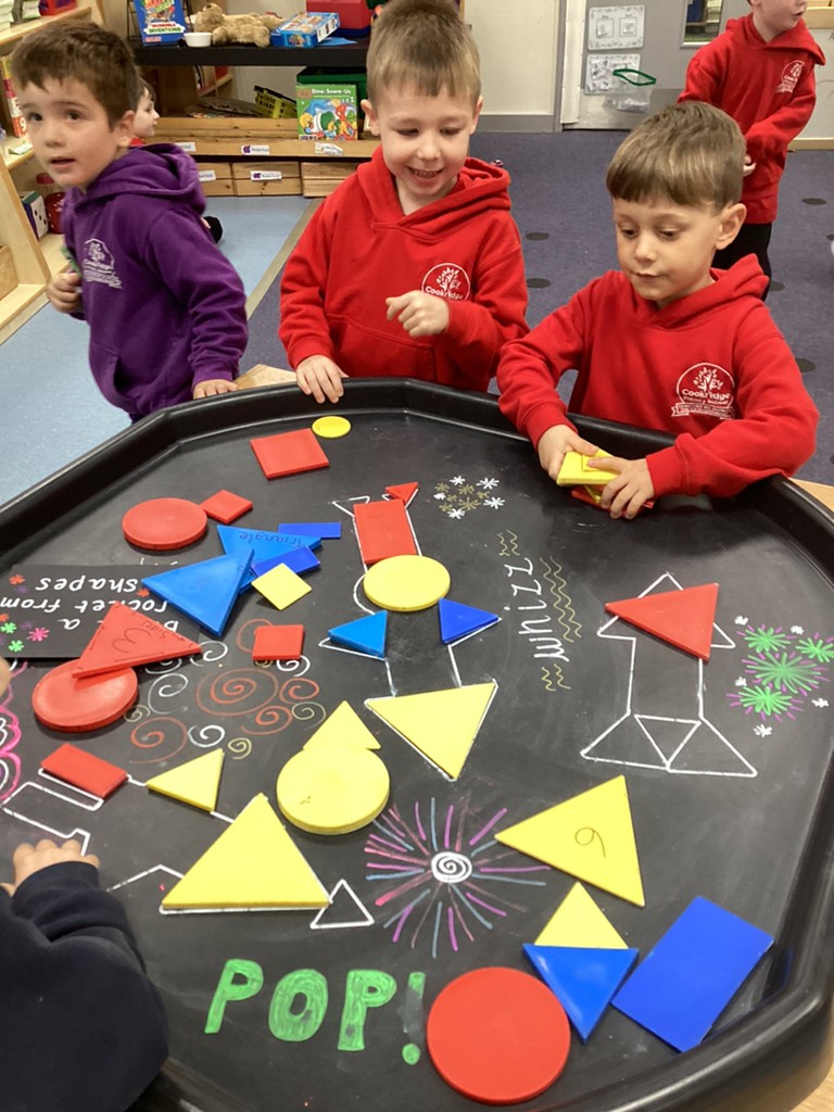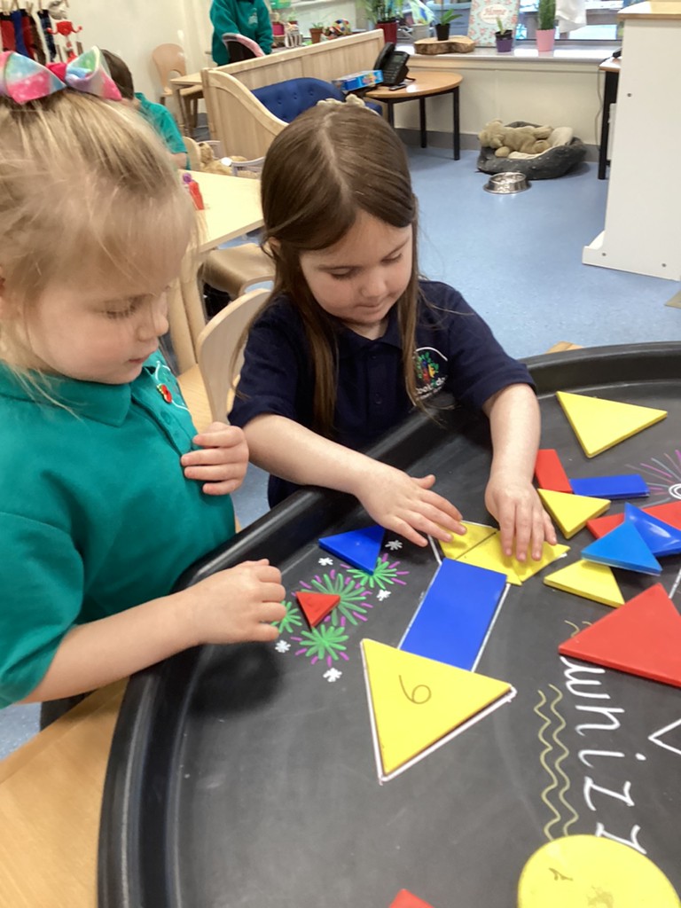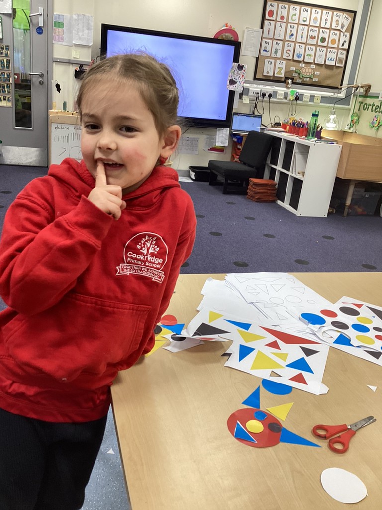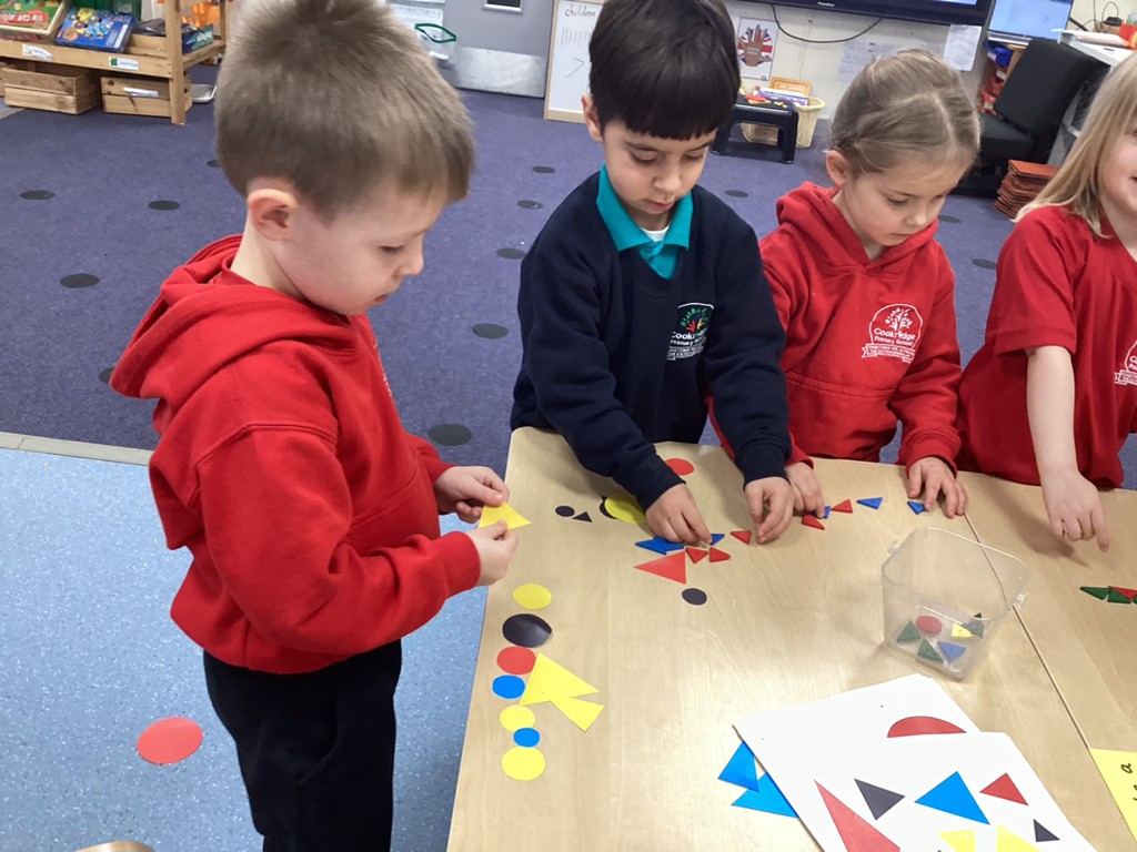 In Maths sessions, we have been exploring the 2D shapes of circles and triangles. The children have practised recognising these shapes and talking about their properties (how many sides/corners) as well as recognising how these shapes can appear in so many places all around us as they went on a shape hunt around the school.