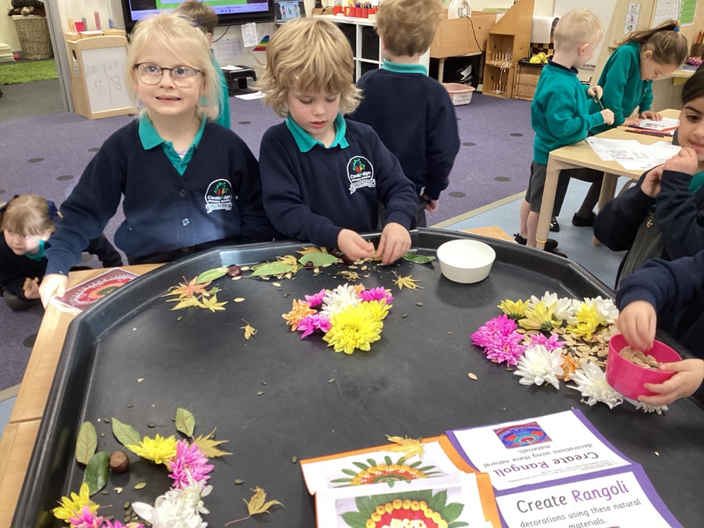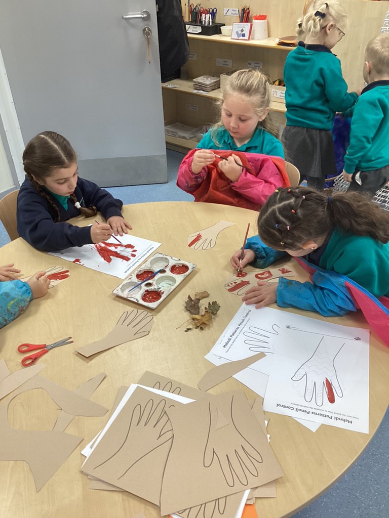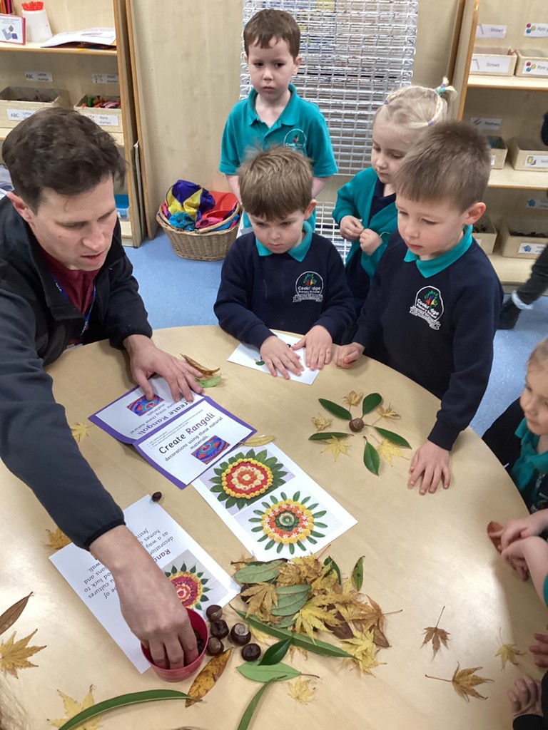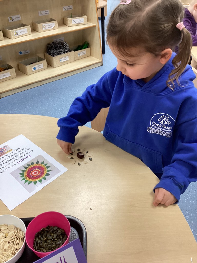 This week has also seen us learning a bit about the festival of Diwali (which this year is being celebrated at the weekend on November 12th). We have learned how Hindus celebrate this ‘festival of lights’ with candles and lanterns in the home so made our own lanterns to bring home. Some children also chose to have a go at mehndi hand art patterns (on paper at least!) and by using natural materials such as leaves, petals and seeds to make the rangoli patterns that are traditionally used to decorate and bring good fortune of homes that celebrate Diwali. Perhaps unsurprisingly, the most exciting part of our Diwali celebrations was the opportunity to help make and eat traditional Indian sweets that are often shared at this special time of year in the Hindu faith.