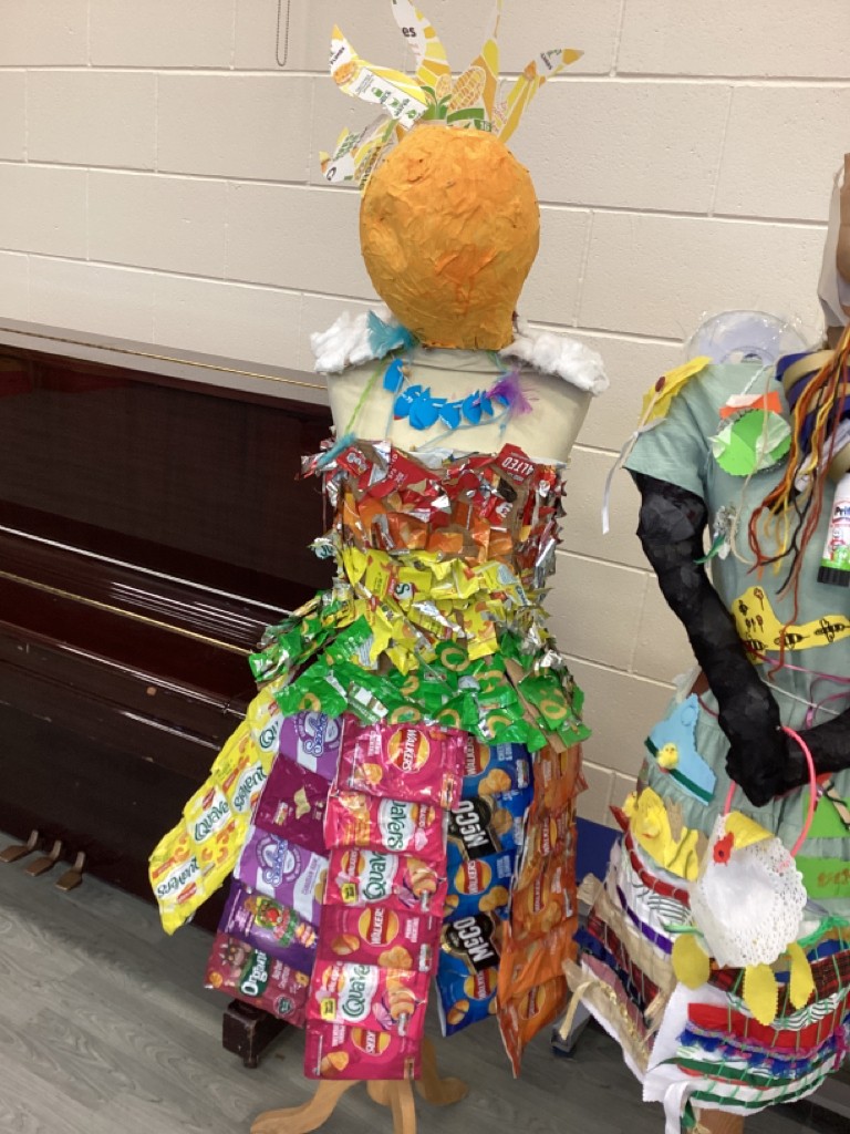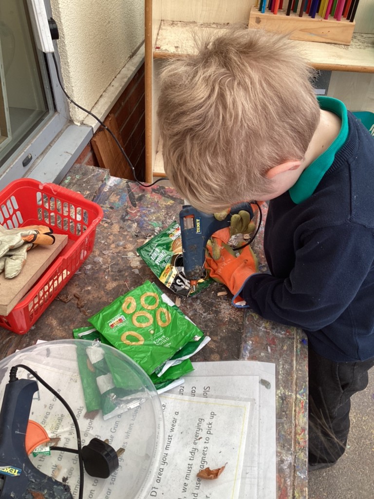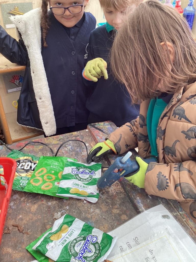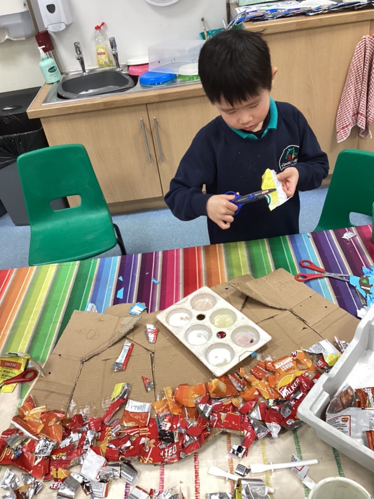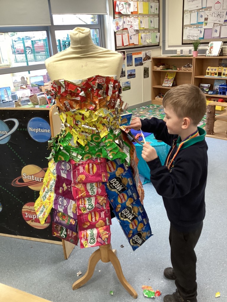 We have also had a lot of fun working on a special creative project this week. Each class in school has been tasked with creating an outfit for a mannequin with the brief of ‘Springtime for recycling’ After a discussion about the many things we can recycle, Reception class decided to make a rainbow outfit out of different coloured crisp packets. With the addition of a sunshine crown and a raindrop necklace the final effect was quite spring-like and certainly colourful!