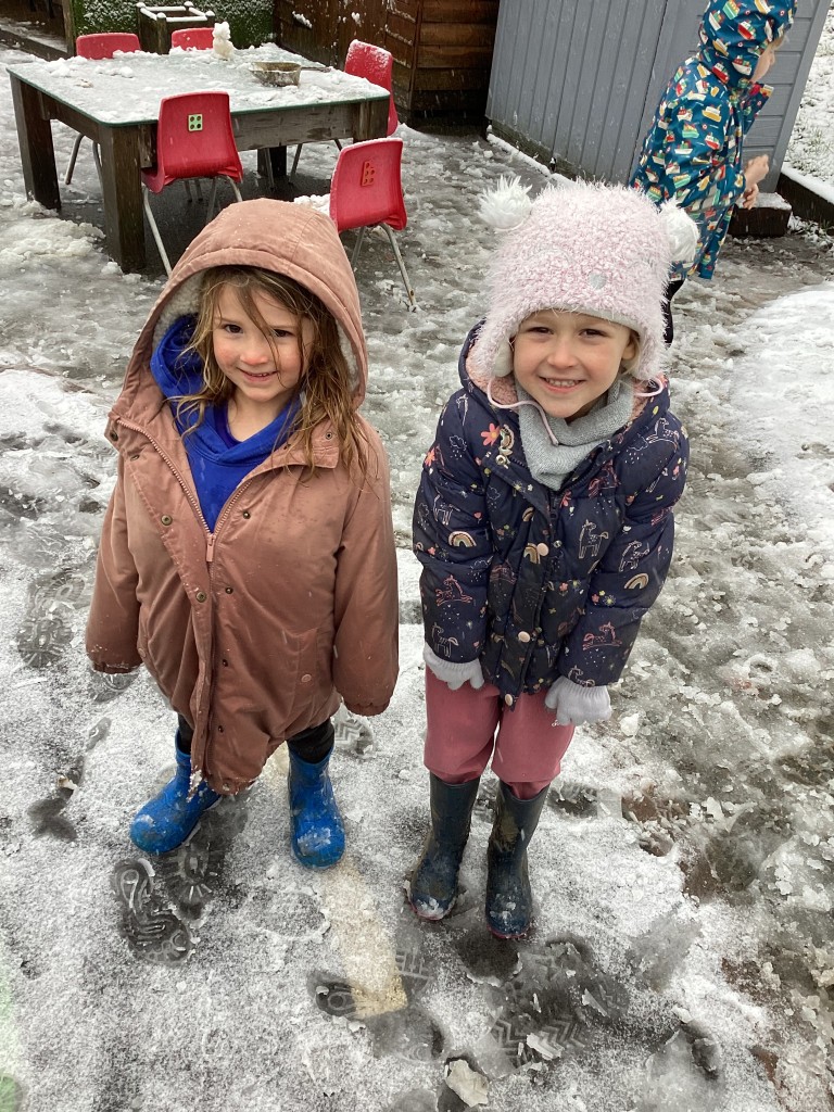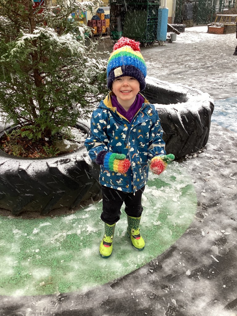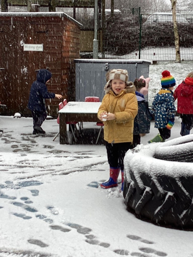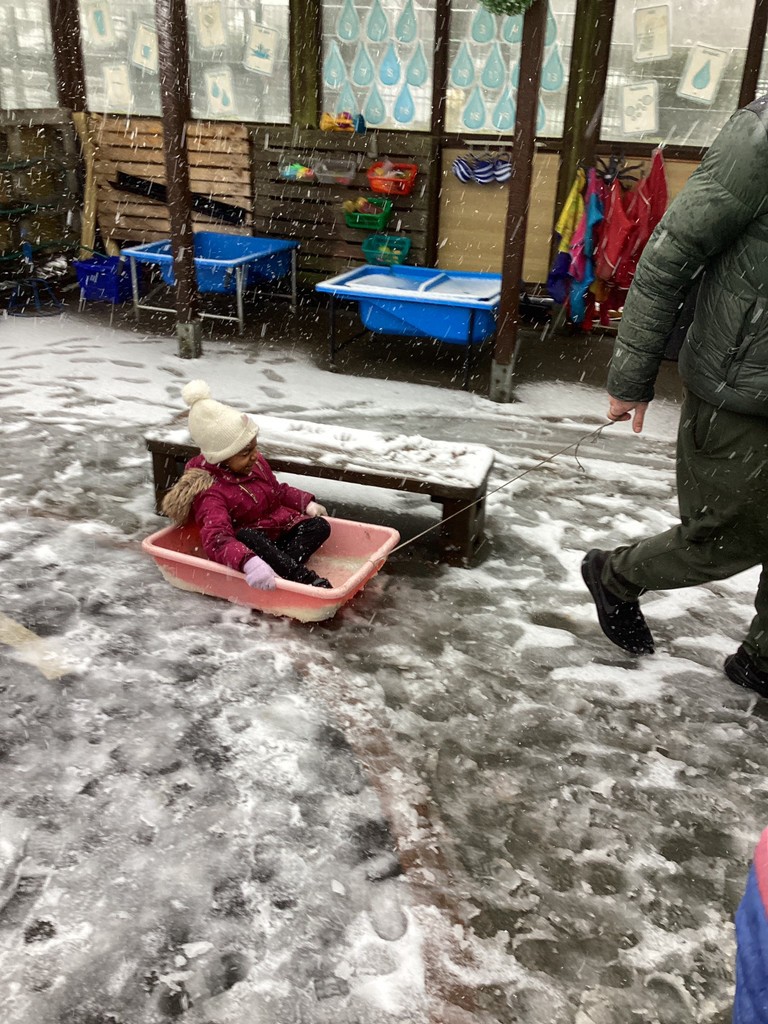 Of course, Friday has brought with it snow which delighted and excited the children. In our outdoor areas the children relished the opportunity to play in the snow, making snowballs, snow piles (it was a bit wet for snowmen!) and speedy sledge rides around the track!