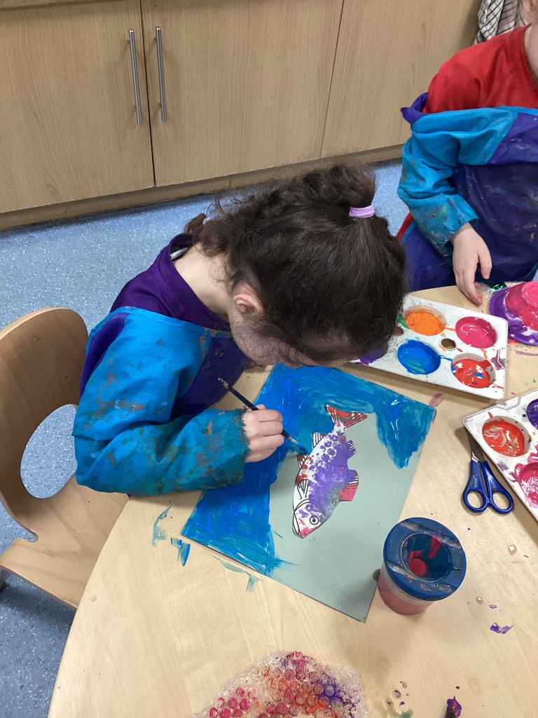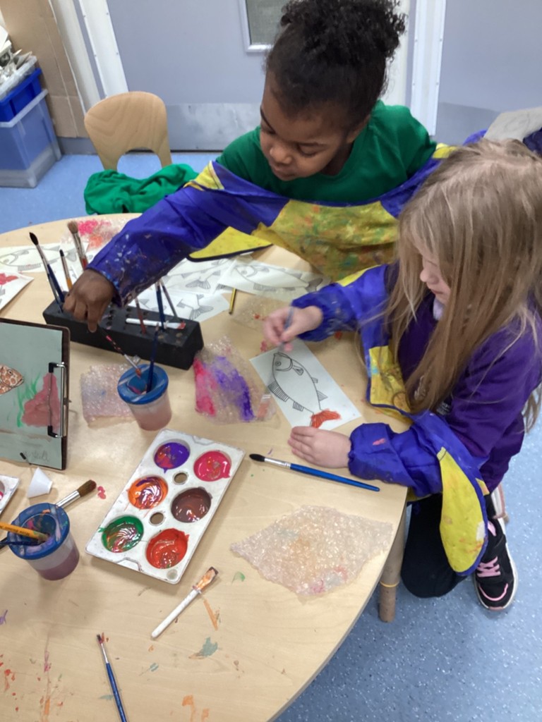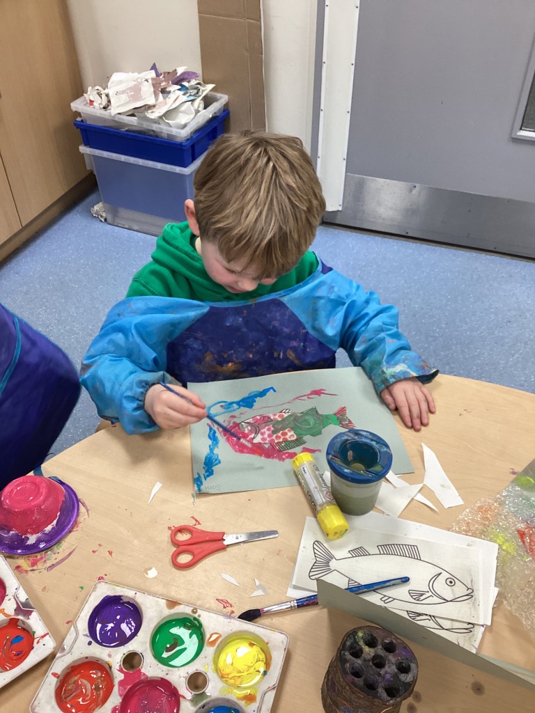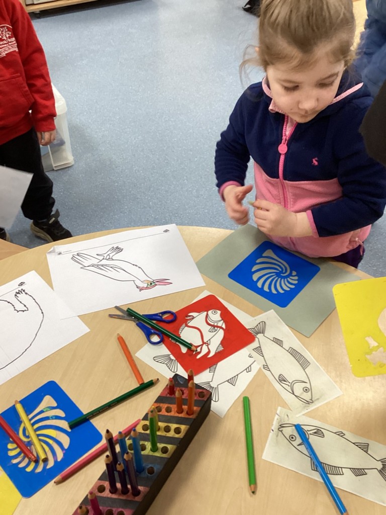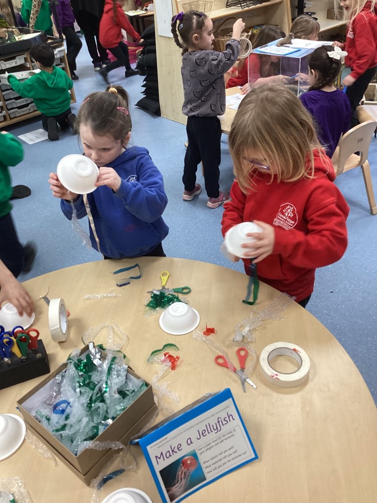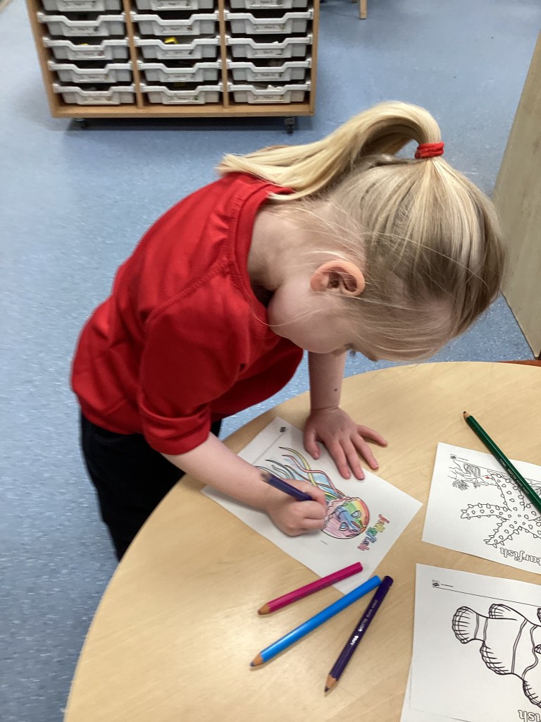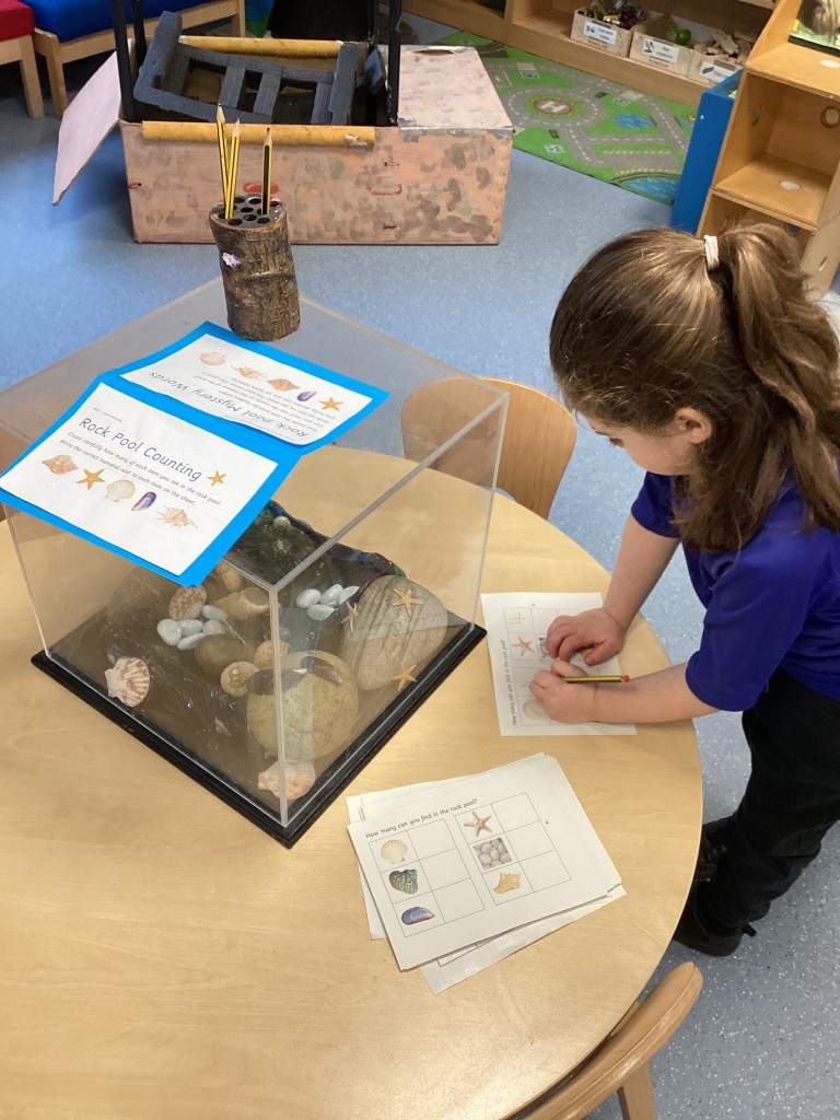 What a fun week in Reception to cap off a fantastic half term. Our Amazing Animals topic has brought us to the seas and oceans of the world and all their many inhabitants. The children have loved our topic sessions this week, in which we have compared the different ocean habitats and how the animals vary in different locations depending on the ocean temperatures. We also had a fascinating look at the Blue Whale, with the children thrilled to learn so many interesting facts about the largest creature on Earth. There have been lots of lovely art activities this week with children drawing undersea creatures, painting fish with bubble-wrap patterns and creating their own jellyfish! Reception even got it’s very own rockpool this week, with the children challenged to carefully count the different starfish, shells and pebbles positioned inside it.