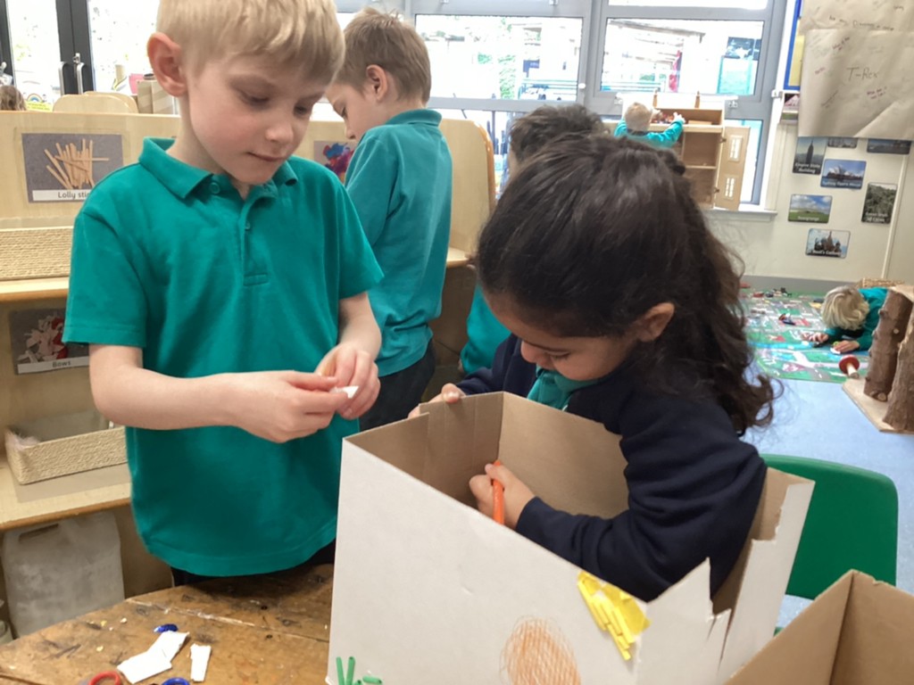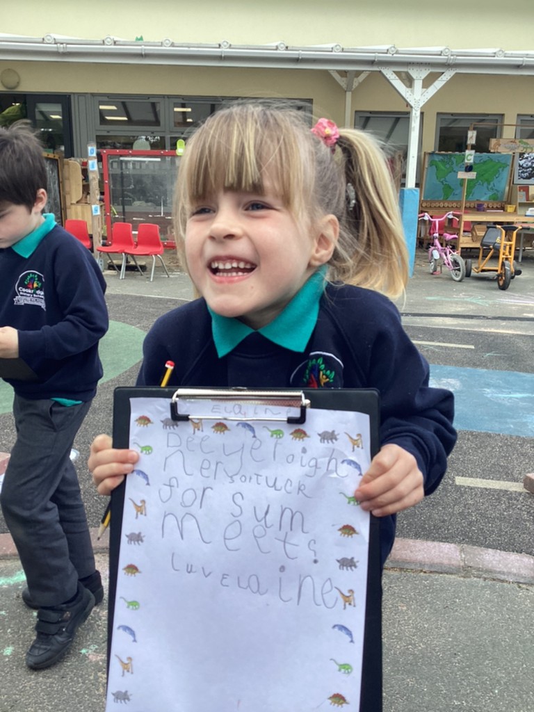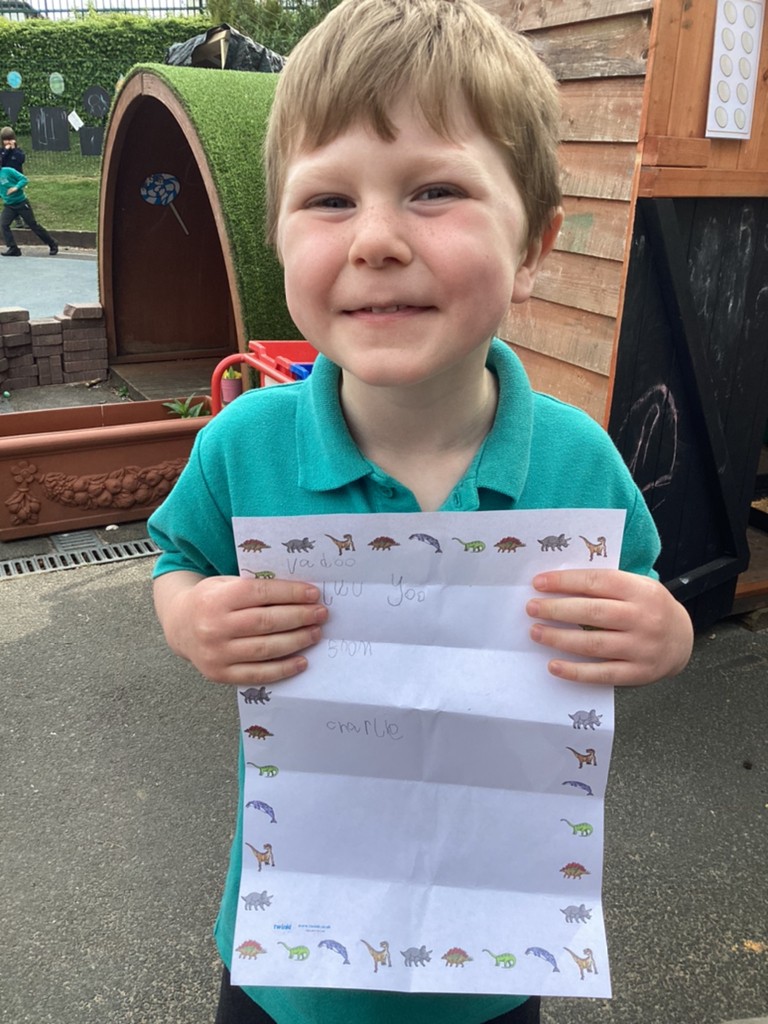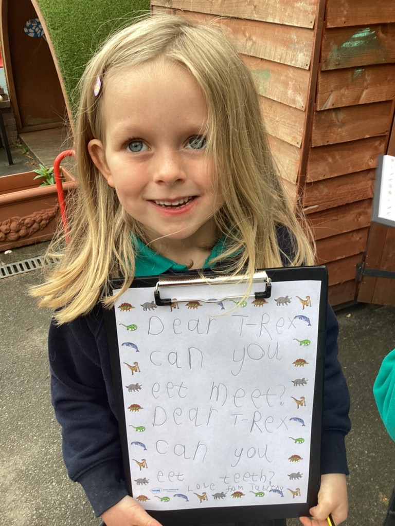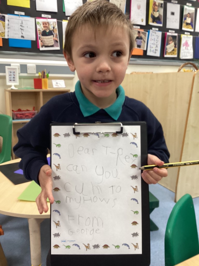 Phonics this week even saw the children excited to exchange letters with a dinosaur! Inspired by the story book ‘Dear Dinosaur’ by Chae Strathie the children opened a letter from a dino friend and had to read it’s contents to identify which dinosaur to write back to. Applying their fantastic phonics skills the children then wrote letters in reply and posted them in the dino post-box!