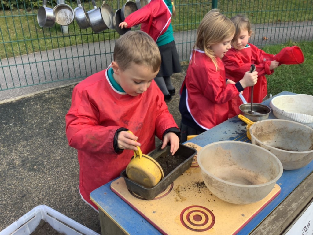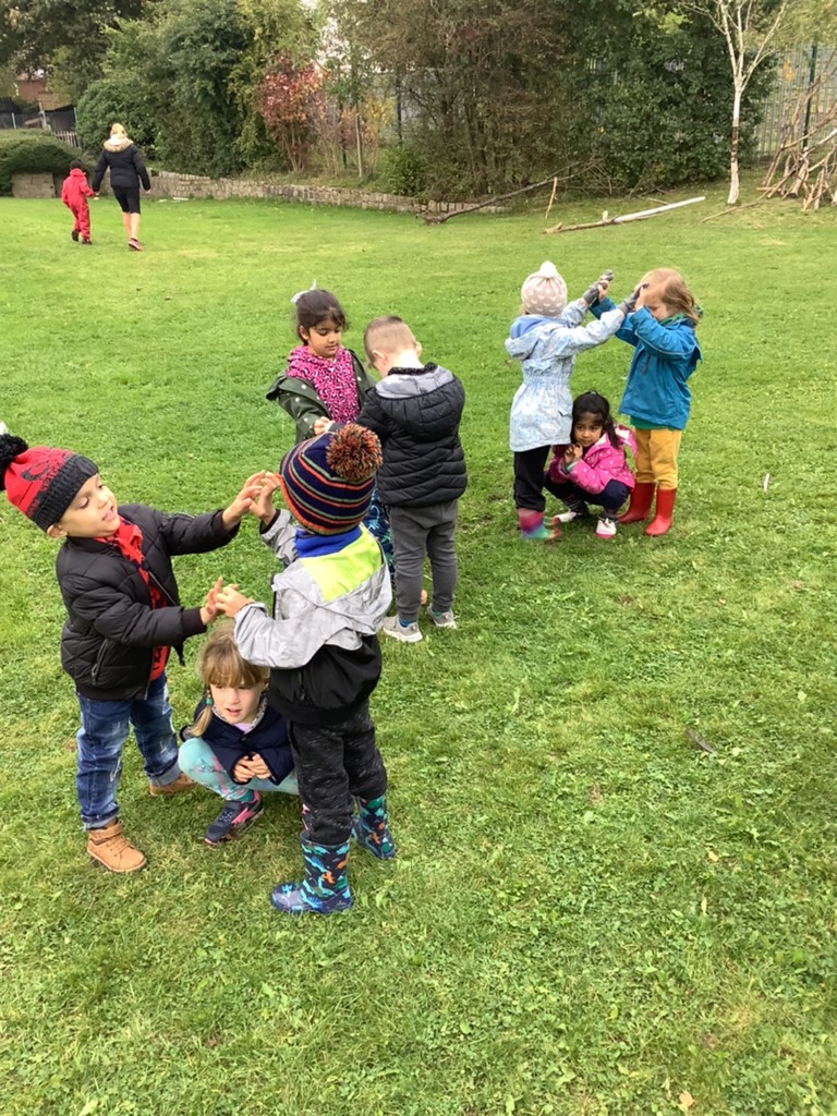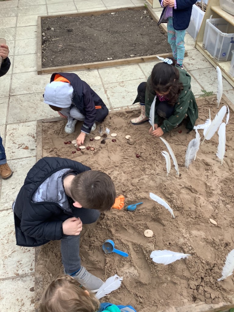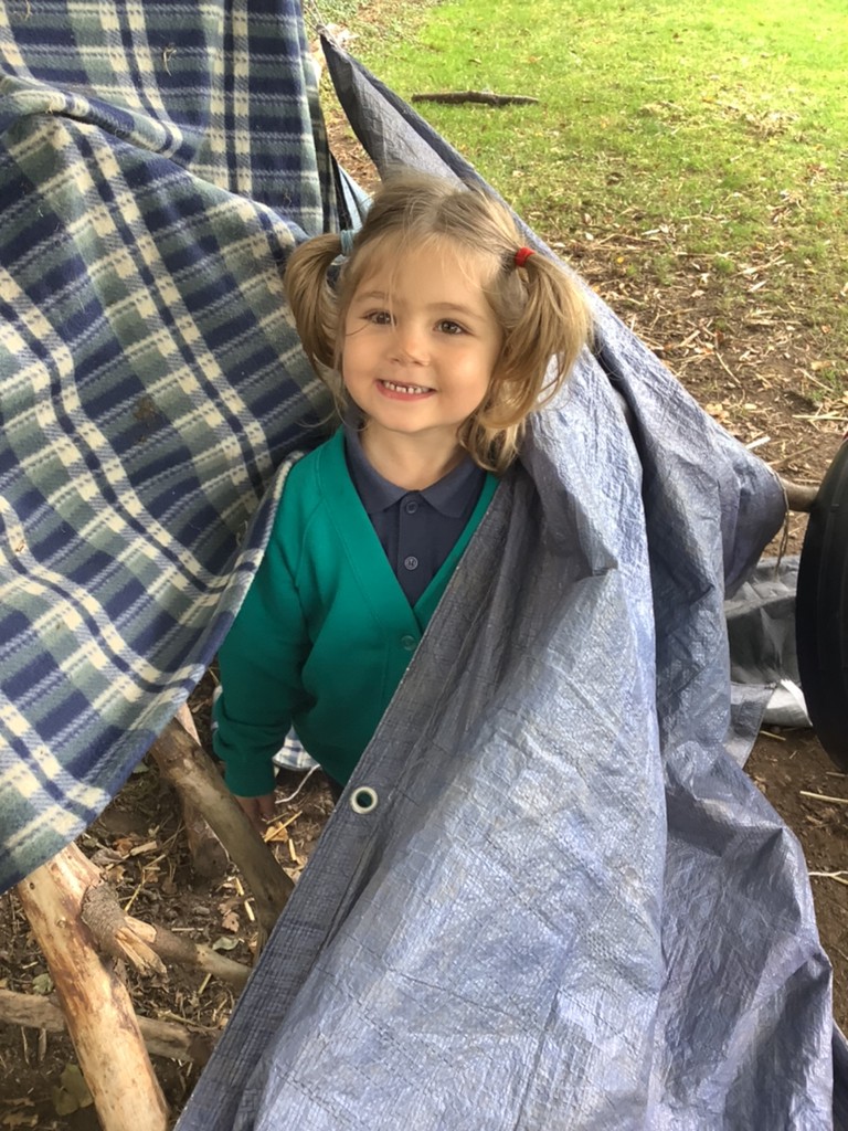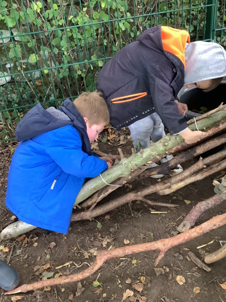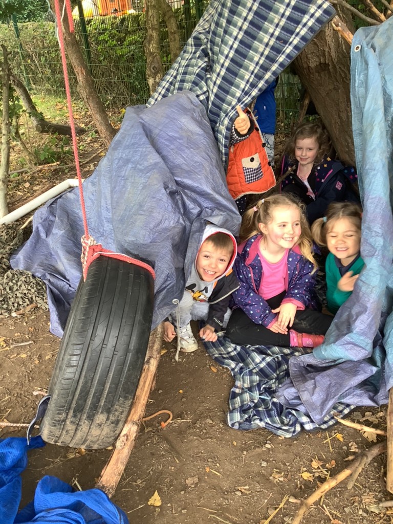 Thursday saw us enjoying our fortnightly Forest Schools session, with outdoor activities testing out creativity, resilience, perseverance and teamwork. We created original artworks inspired by our story of the week using a range of natural loose parts (conkers, feathers, sticks etc.) and worked in teams to build a house in the trees using branches, tarpaulins and rope. Of course, another popular activity was getting to spend time with, and help to feed the rabbits and chickens in the school garden.