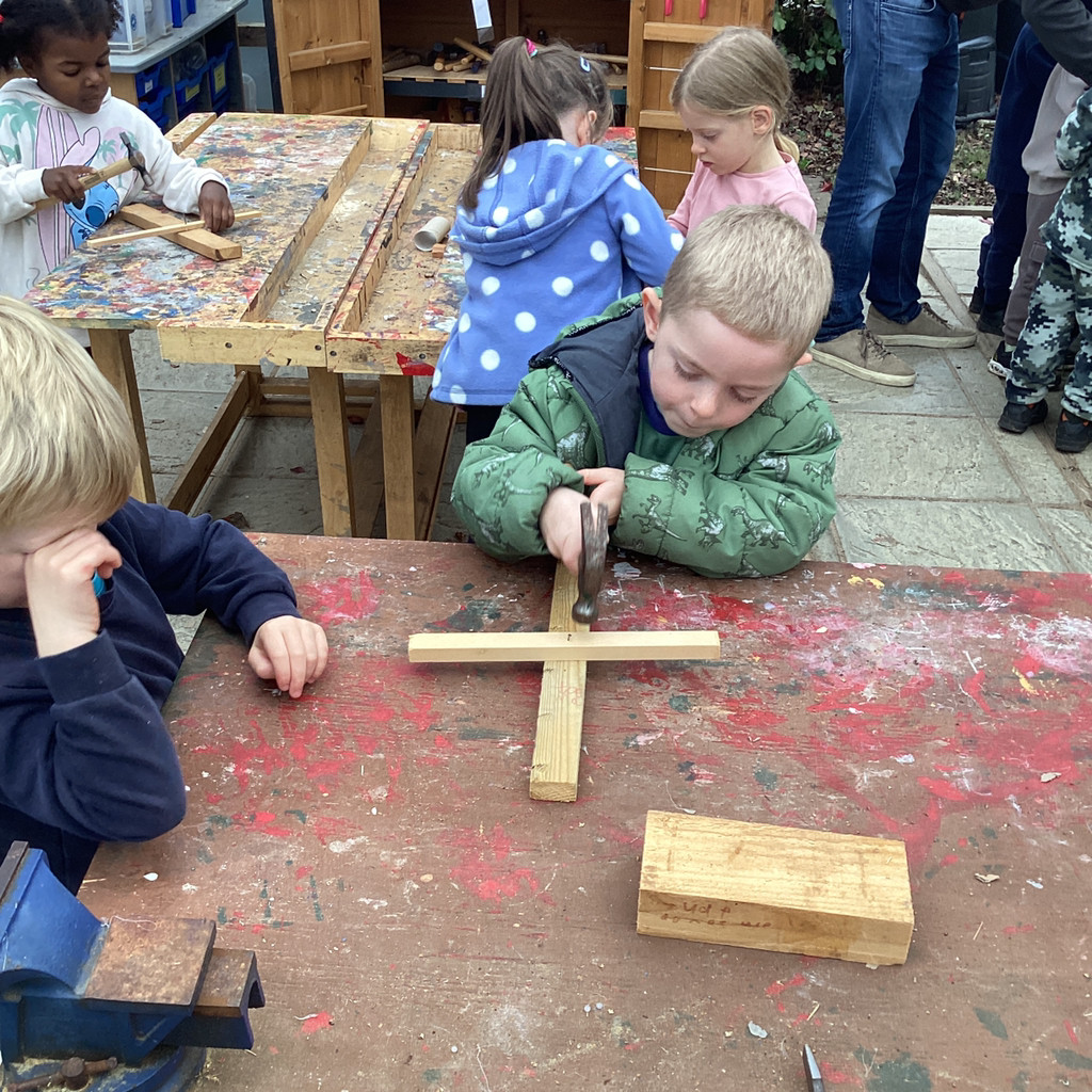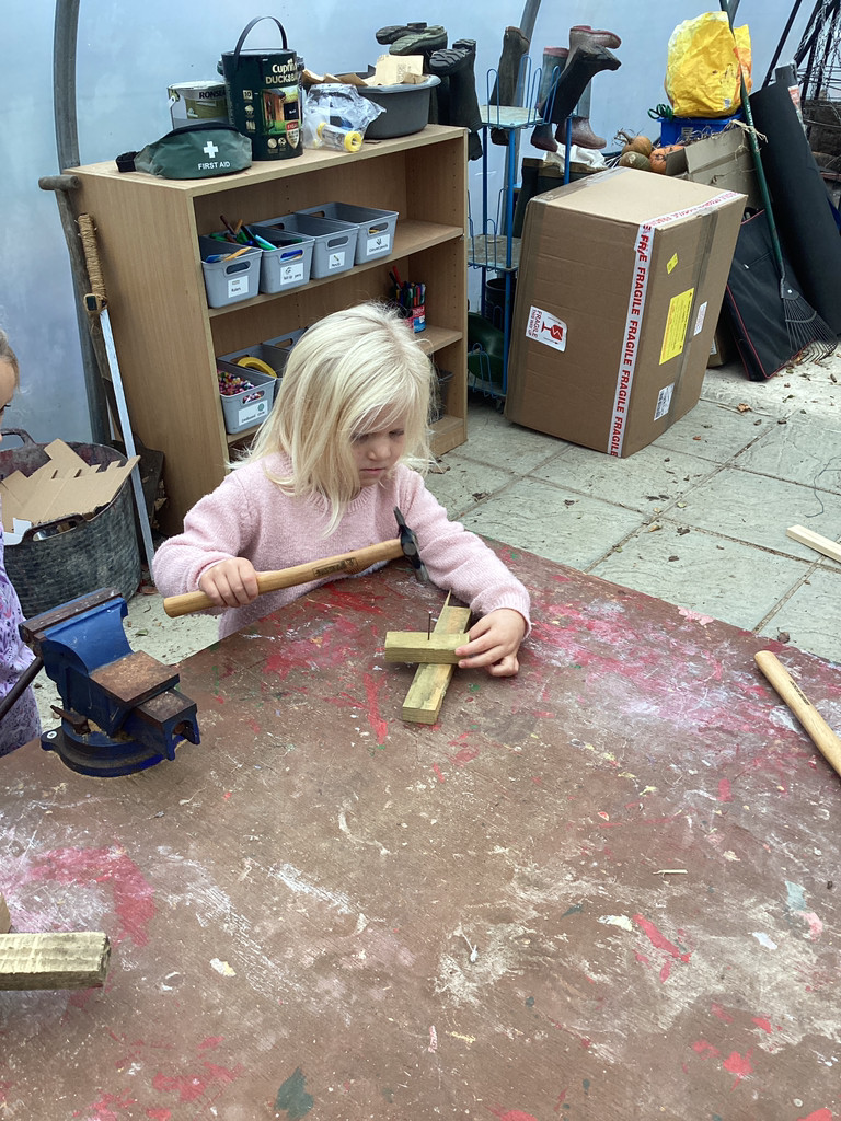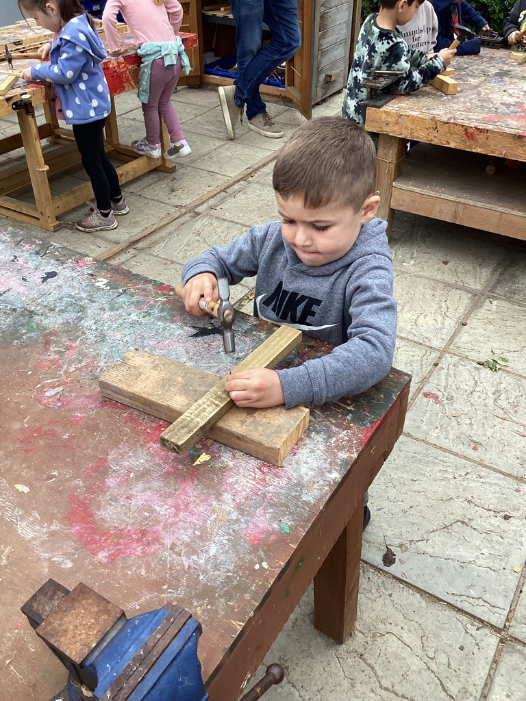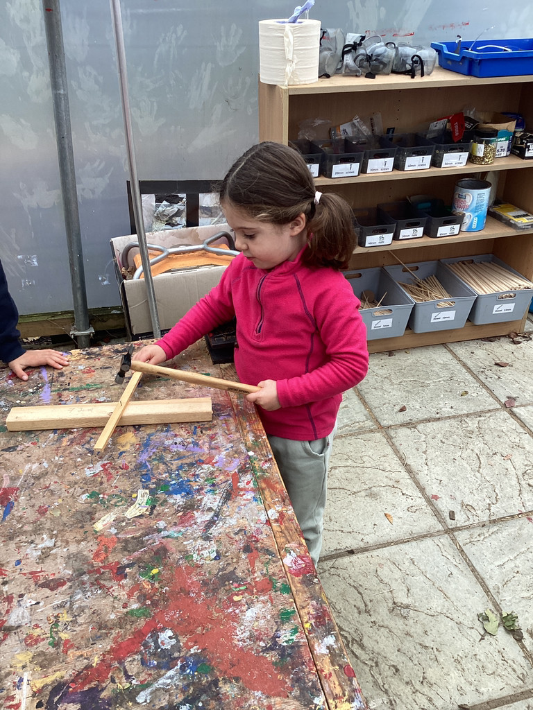 On Tuesday, the children greatly enjoyed time with Mr Joy in the polytunnel where they were able to build on their hammering and sanding skills to join pieces of wood together.
