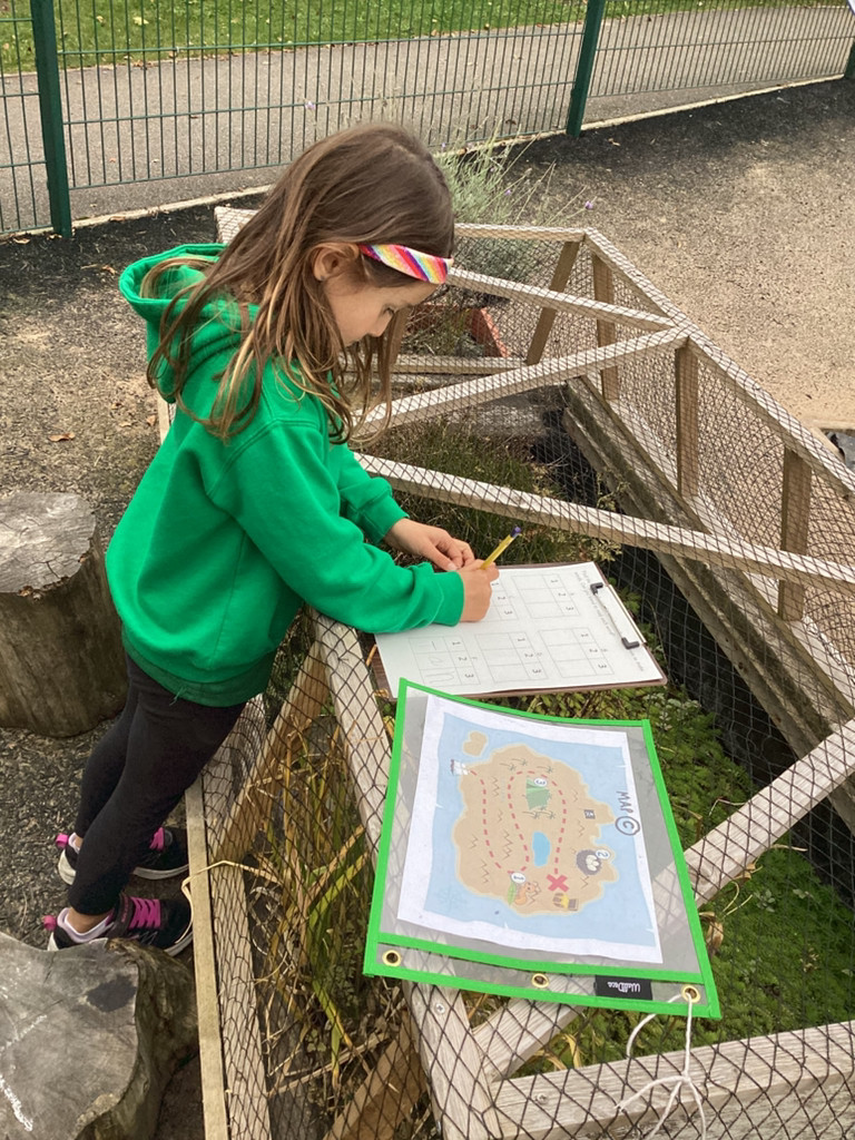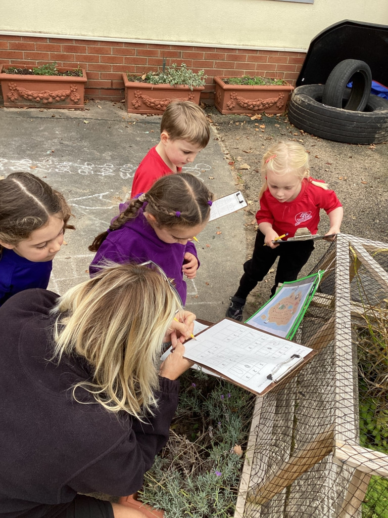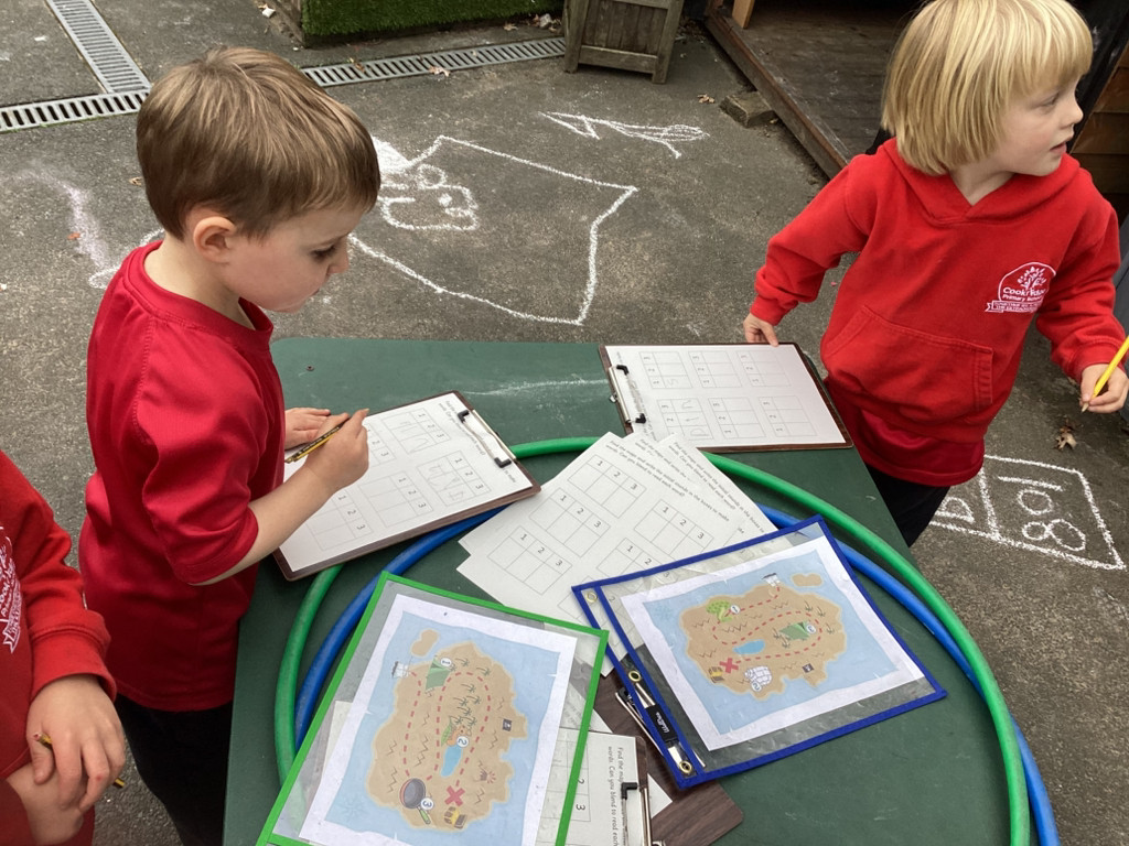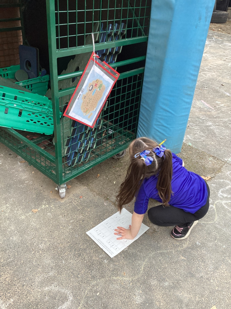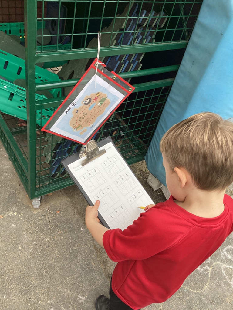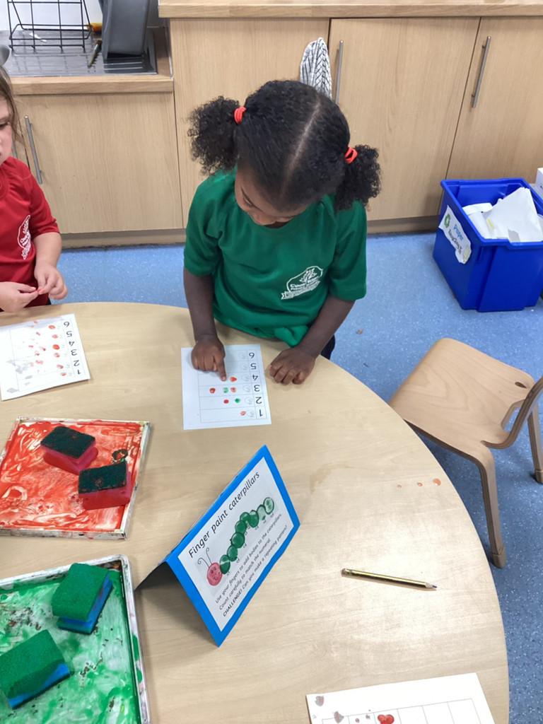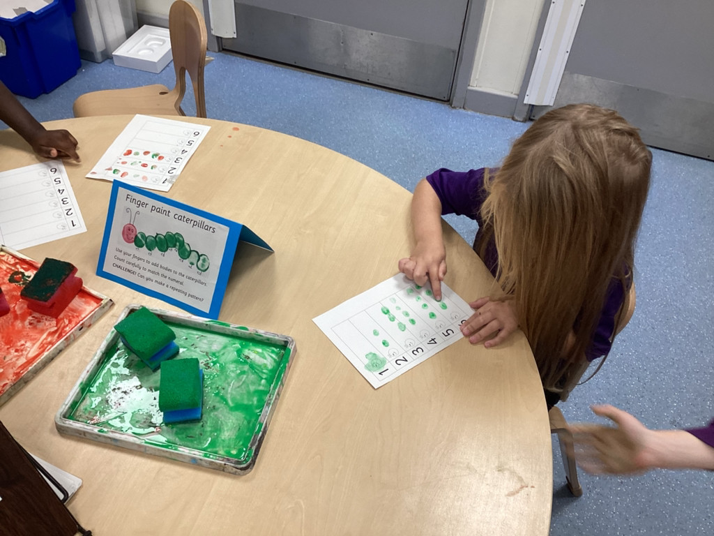 Lately, the reception children have been a lot of interest in treasure maps, so we thought we would harness this into an activity that helped rehearse our phonics skills. The children were given a clipboard and sent off in search of six hidden treasure maps which each displayed three pictures. If the children could identify the initial sound of each item on the map they were able to write them into simple words and win the valuable treasure of team points for their colour team! Elsewhere in the classroom, we had the chance to practise our counting skills by fingerprinting caterpillars of the correct length and ordering beanbags.