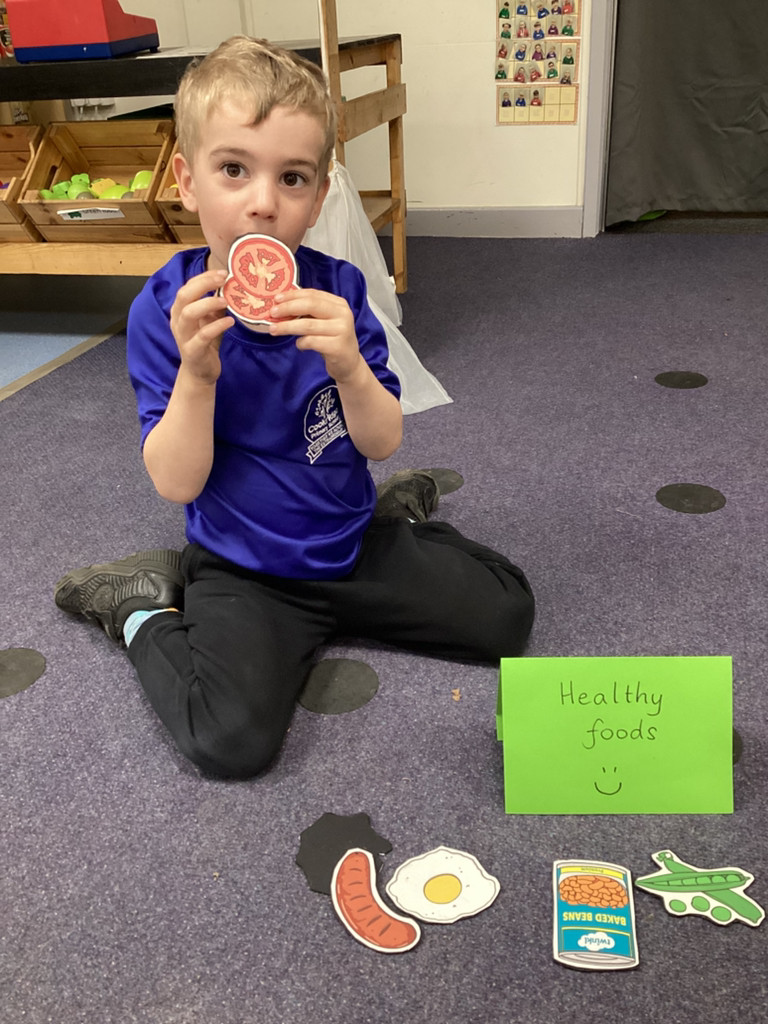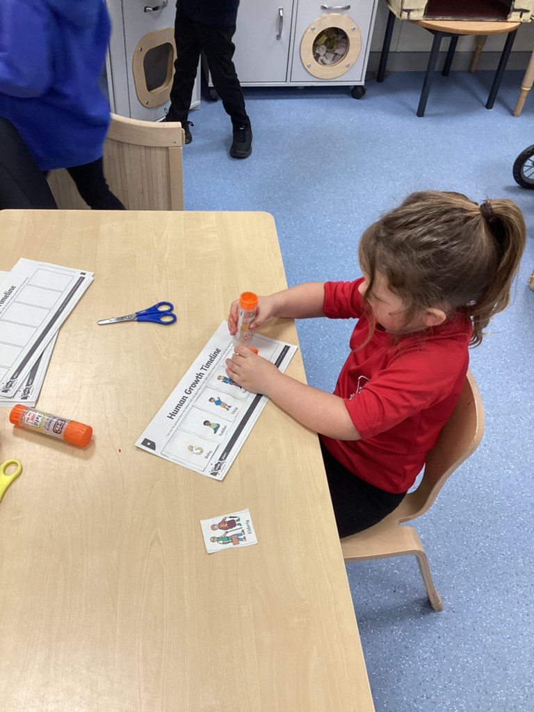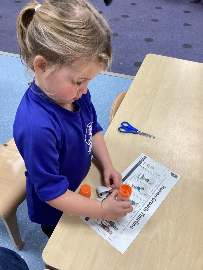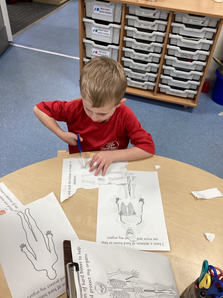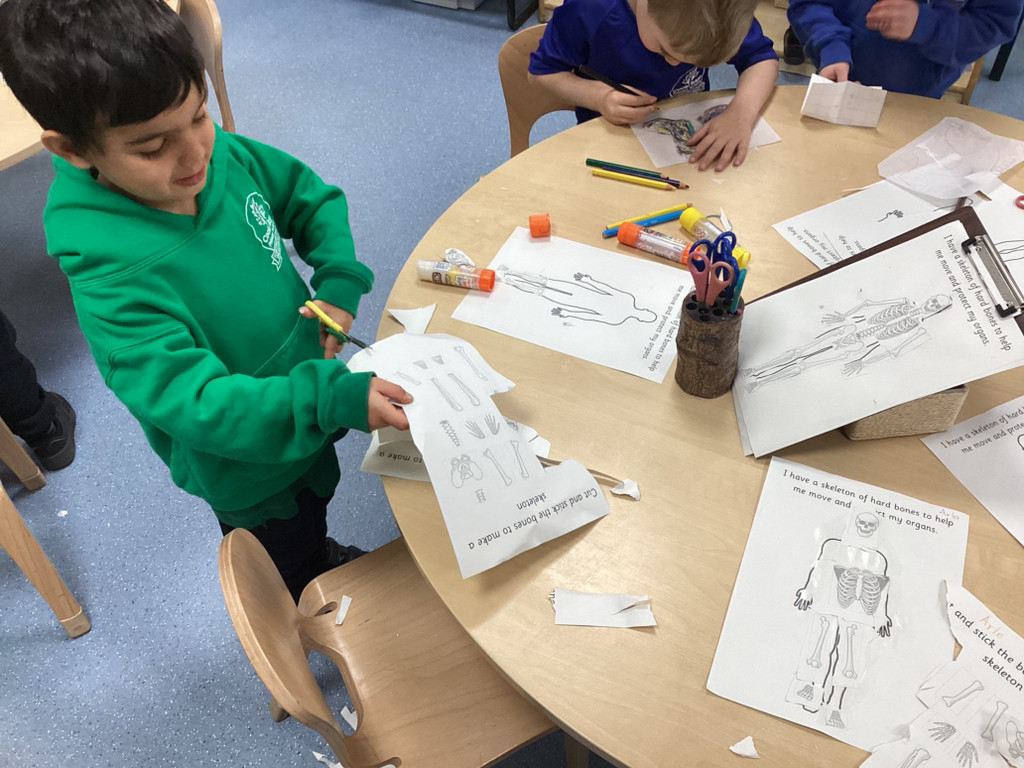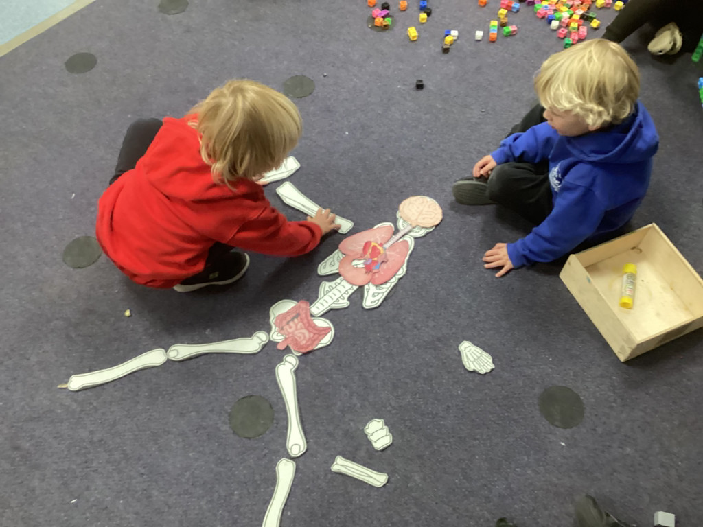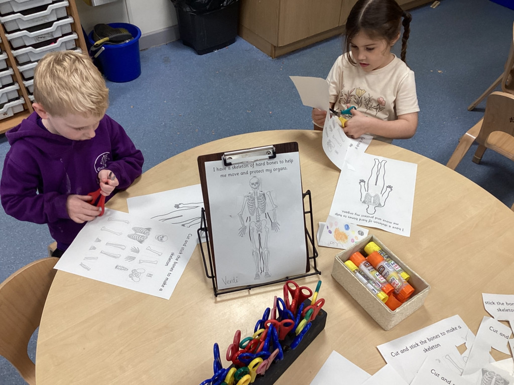 Though the weather’s definitely cooling lately, things are definitely not slowing down in Reception! The children have been continuing to explore ‘All About Me’, and this week we’ve been looking at our bodies. We have named the different parts of our bodies from head to toe and taken a look at the skeleton and organs within. Lots of children took the challenge to practise their scissor skills to cut and stick together a skeleton picture or to order the different stages of life. Many were excited to have a go in our ‘finger gym’ where the children were tested with different fine-motor challenges such as snipping up leaves, spinning nuts free from bolts and freeing action figures from tangled elastic bands. We also talked about which foods were healthy or unhealthy for our bodies and the children had a go at sorting them.