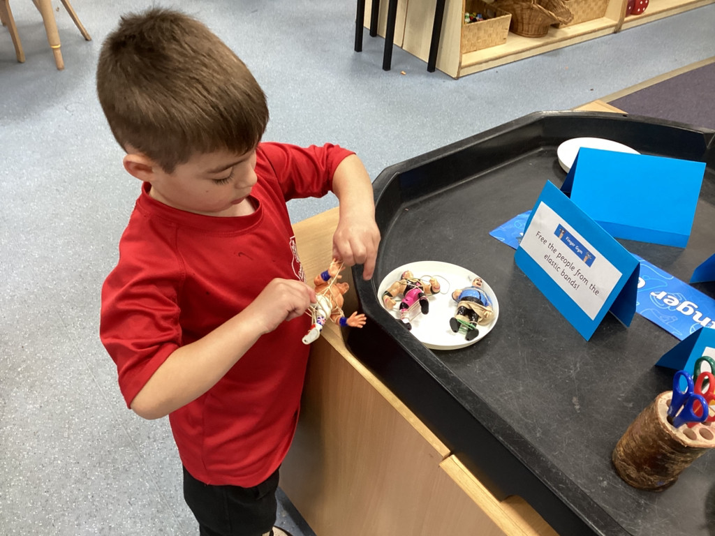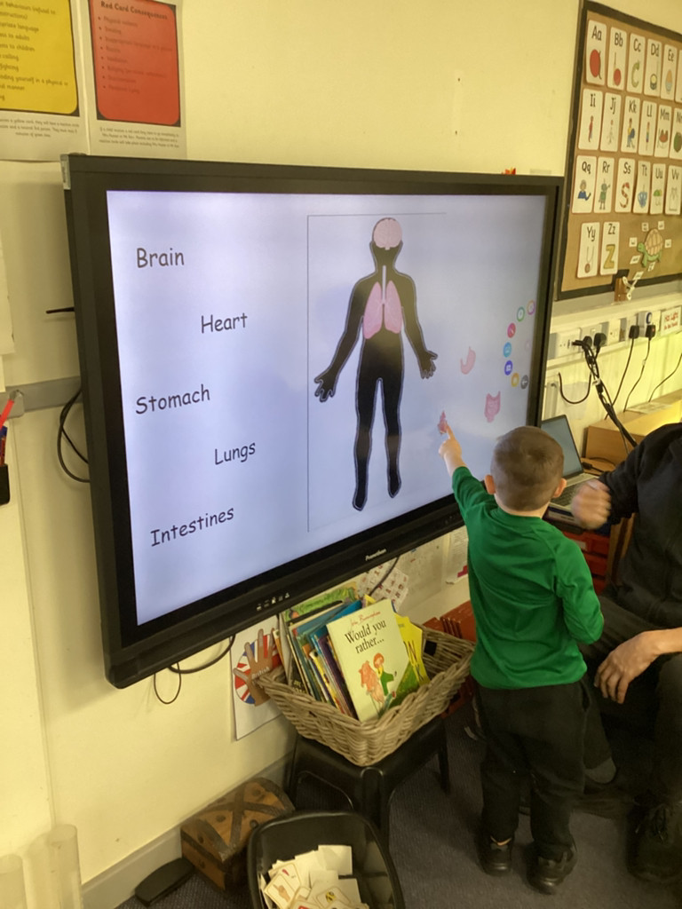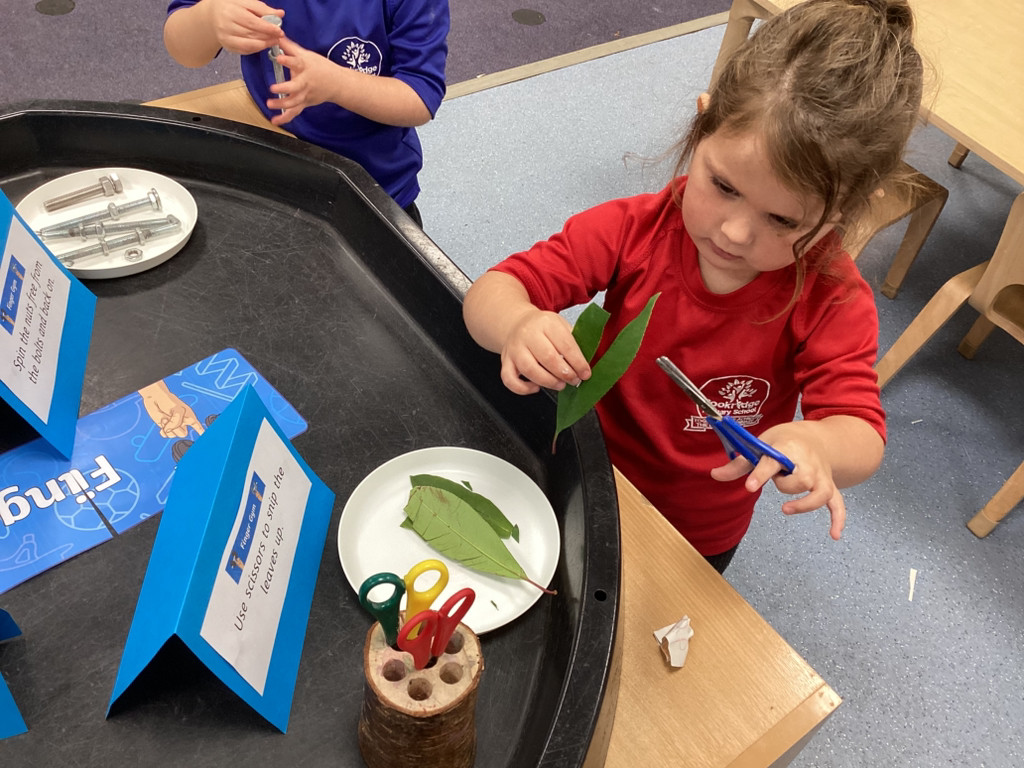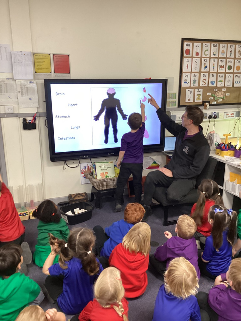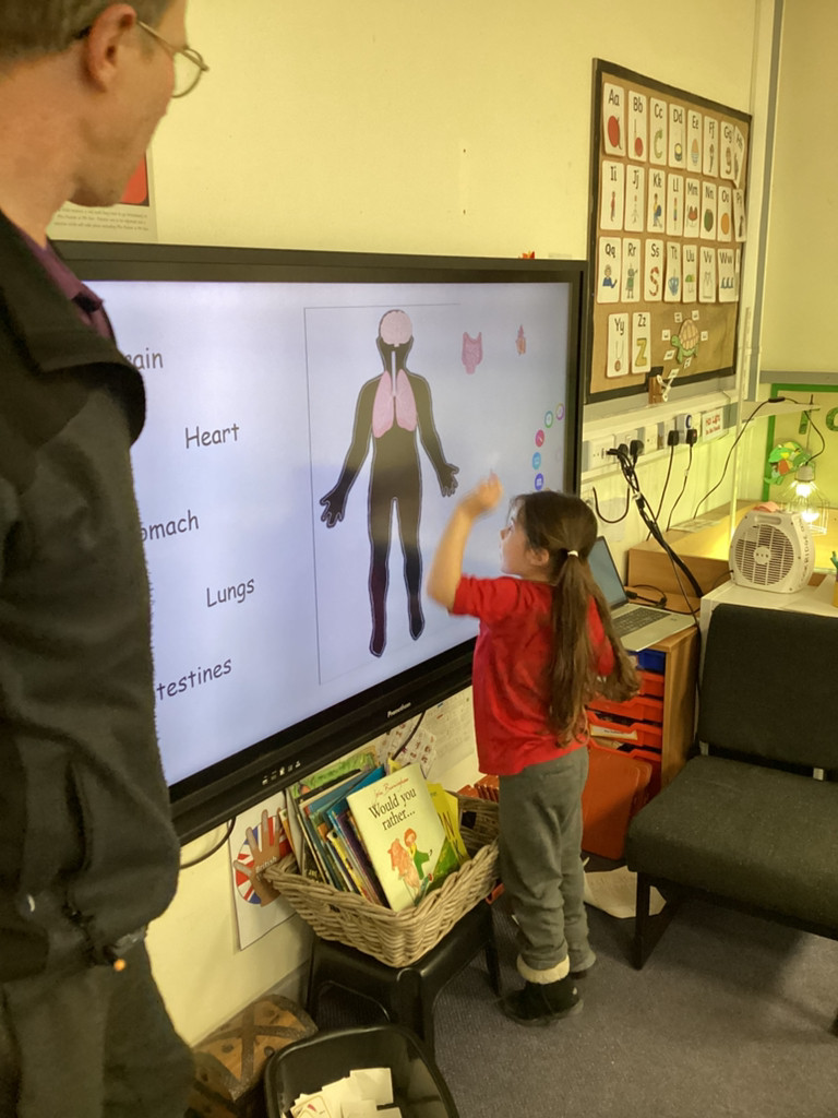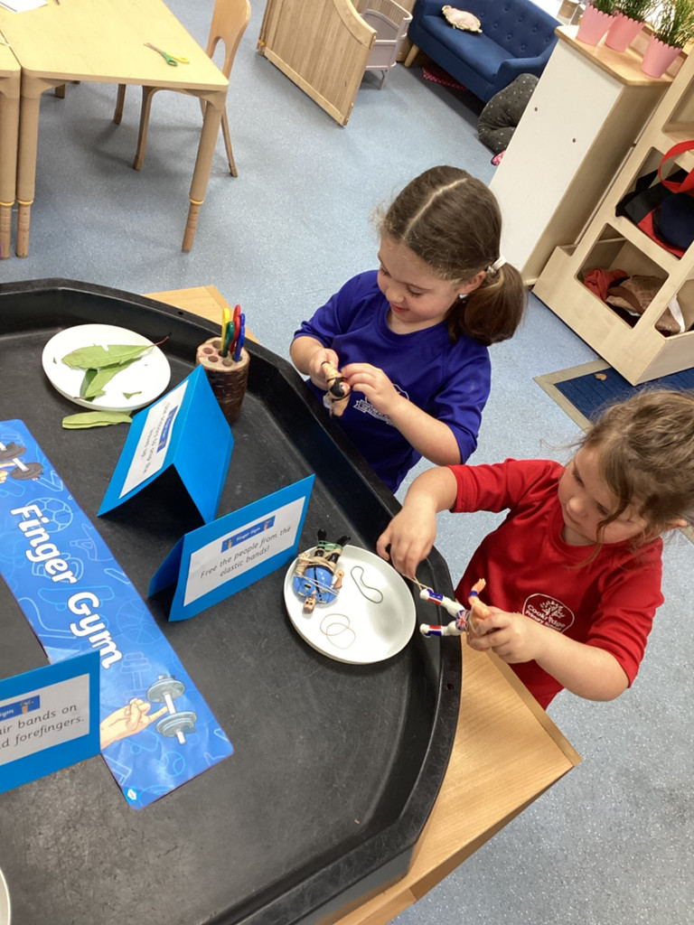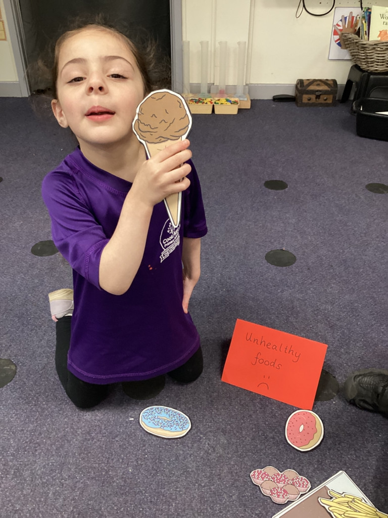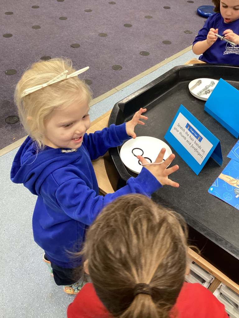 Though the weather’s definitely cooling lately, things are definitely not slowing down in Reception! The children have been continuing to explore ‘All About Me’, and this week we’ve been looking at our bodies. We have named the different parts of our bodies from head to toe and taken a look at the skeleton and organs within. Lots of children took the challenge to practise their scissor skills to cut and stick together a skeleton picture or to order the different stages of life. Many were excited to have a go in our ‘finger gym’ where the children were tested with different fine-motor challenges such as snipping up leaves, spinning nuts free from bolts and freeing action figures from tangled elastic bands. We also talked about which foods were healthy or unhealthy for our bodies and the children had a go at sorting them.