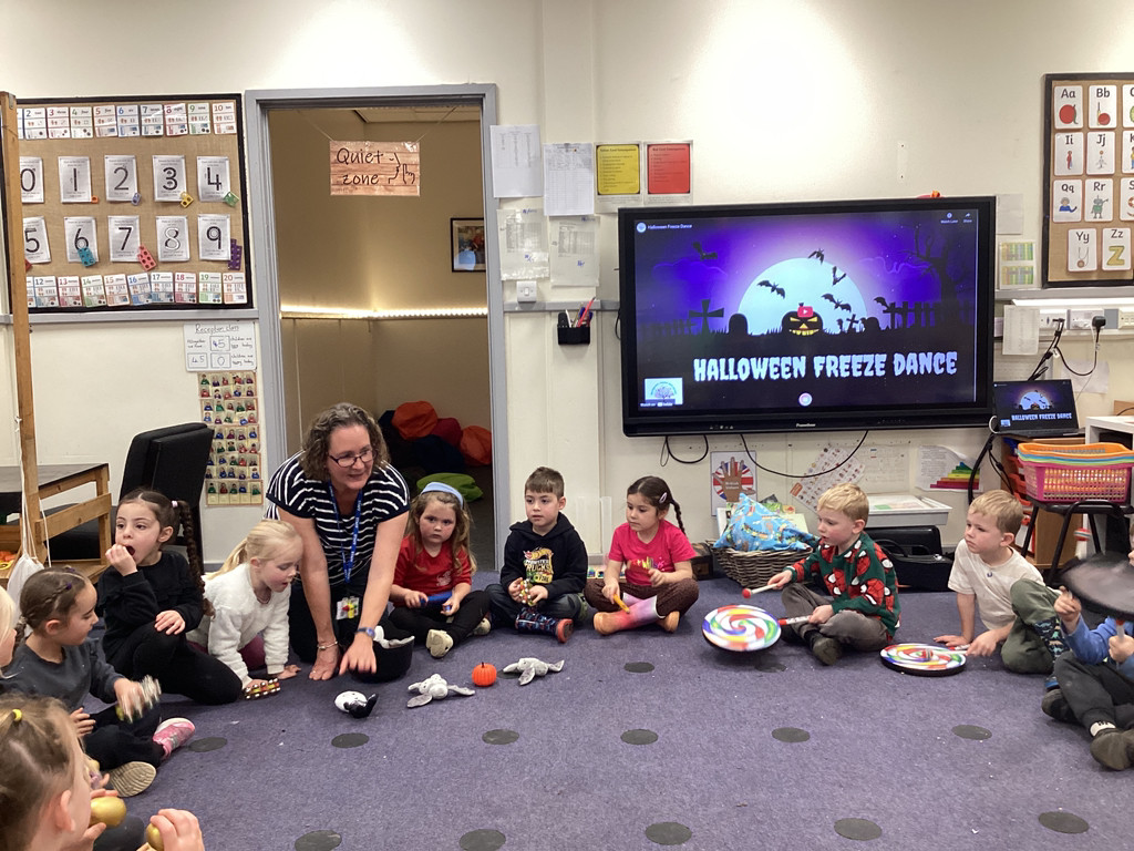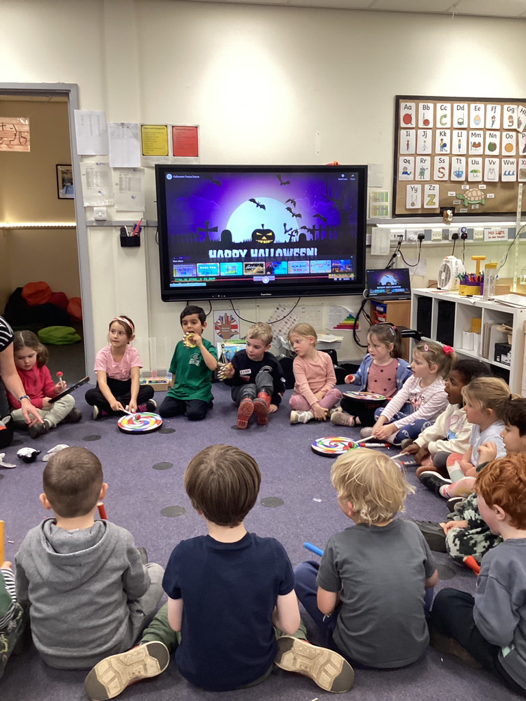 And also with Mrs Durrant exploring rhythm and movement in a Halloween themed music session; and a spooky ‘Winnie The Witch’ themed art lesson with Mrs Ledda drawing on black paper!
