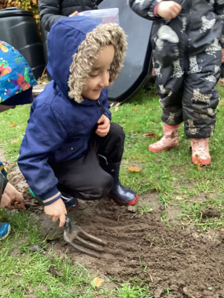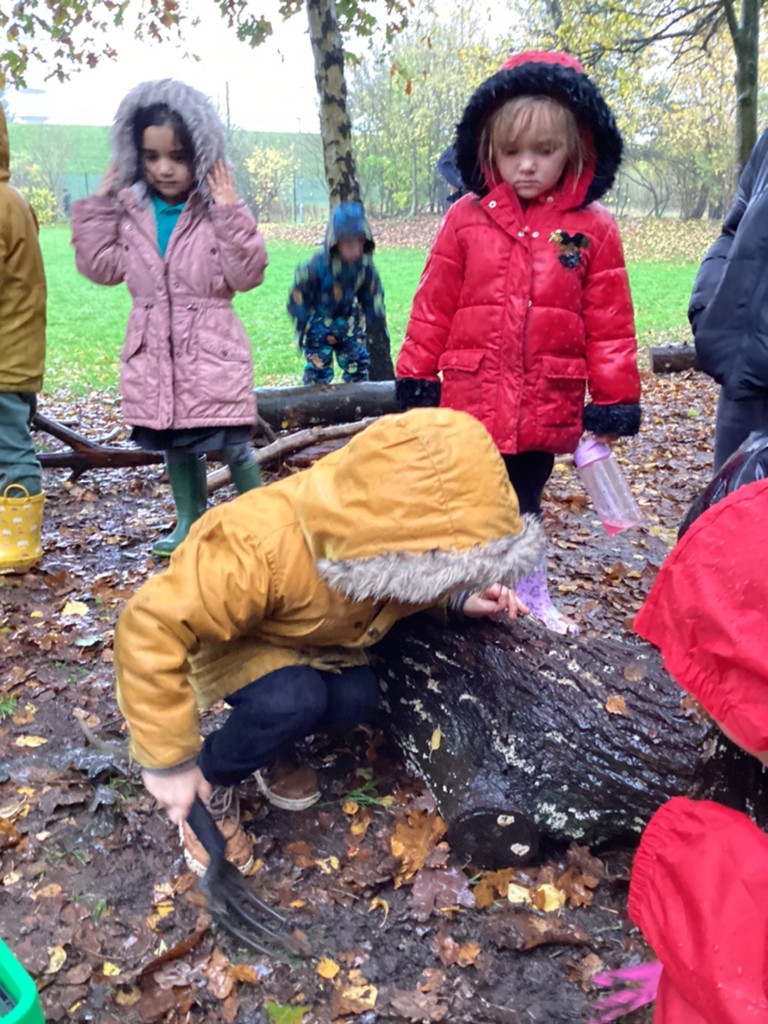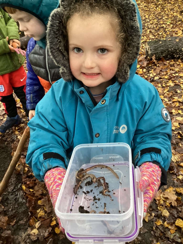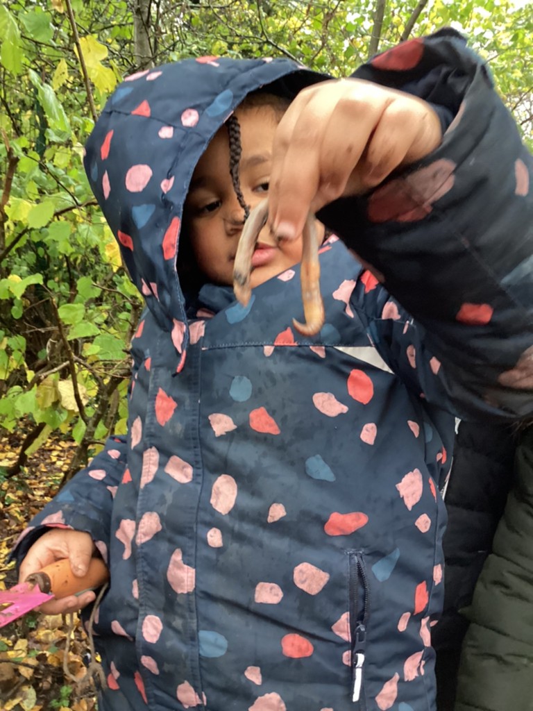 Thursday’s Forest School session was a very rainy affair but the children got stuck in with our Mini-beast themed sessions. The rain actually helped us as we were out hunting for worms and they were out in force as we dug in the soil and overturned logs. It was lovely to see the kids so engaged with nature and, once back in the dry, they enjoyed observing the worms closely.
