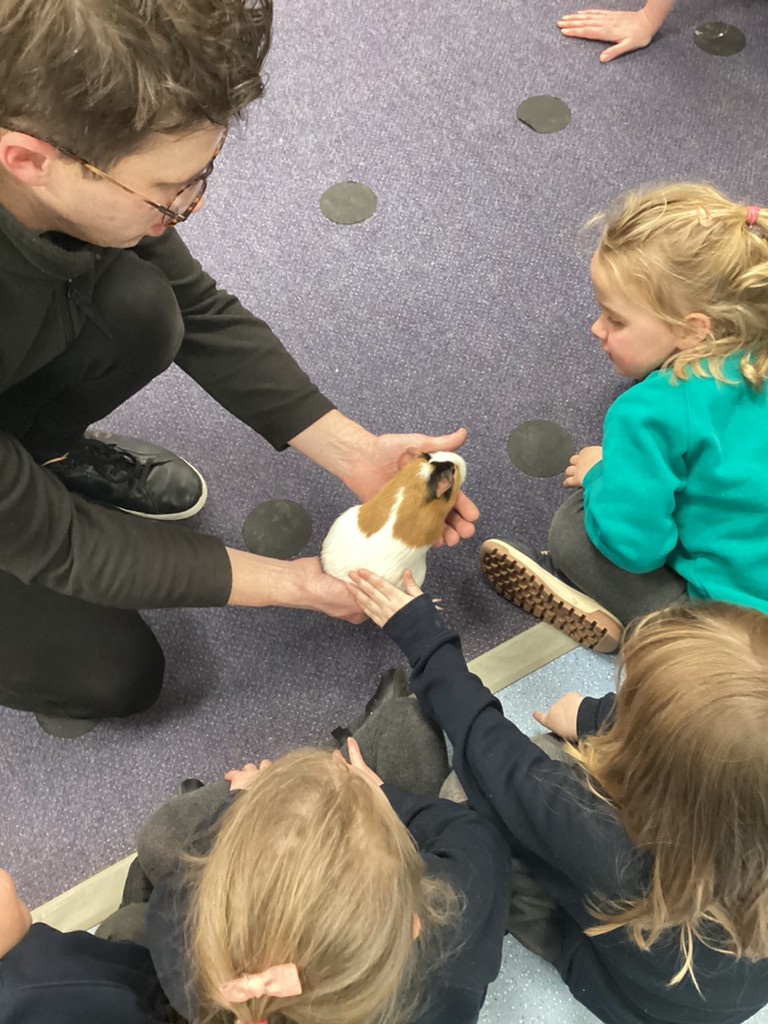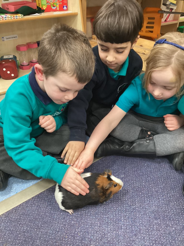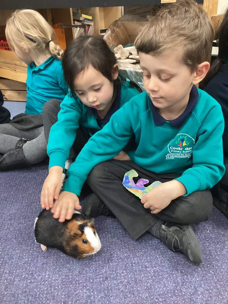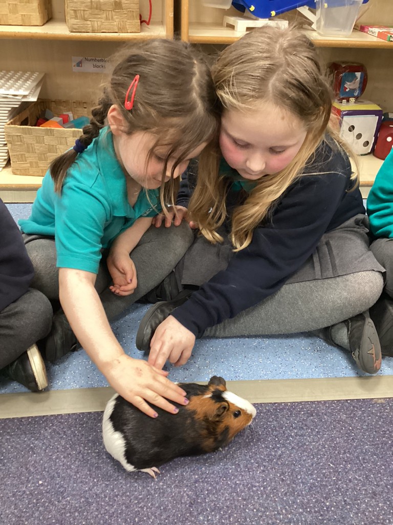 Our Cookridge Pet of the week this week was the guinea pigs, so we had a visit in class from our very own Percy and Marshmallow. Prior to the guinea pigs arriving, we had watched an information video all about these popular pets so the children have learned some fascinating facts (but probably only remember that they sometimes eat their own poop!). The children were then given time to observe and pet Percy and Marshmallow in our classroom – and very sensible they all were too!