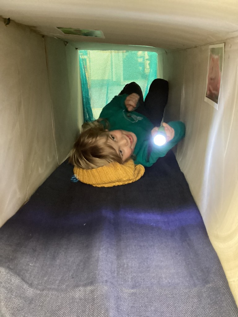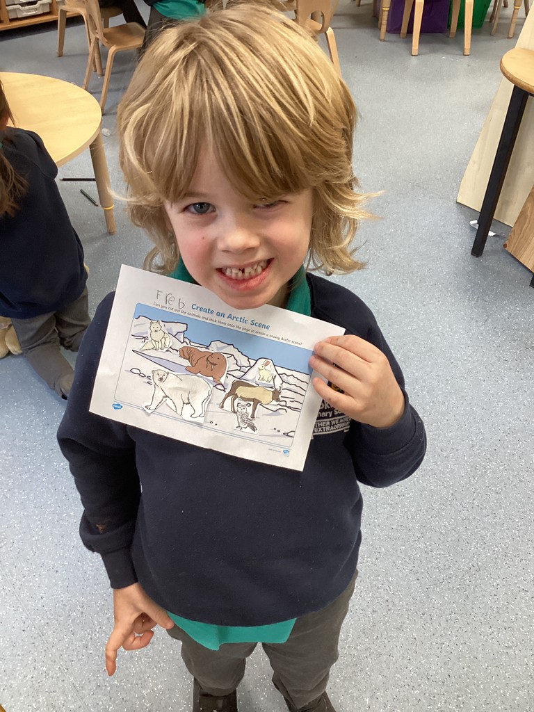 Another popular Polar-themed activity was our mysterious Ice Tunnel which has materialised in the middle of the classroom over the weekend. To gain entry to the tunnel, the children were encouraged to write a sentence asking permission. If successful, the children would be given the torch and a nice woolly hat to keep warm, and in they went to explore the mysteries within. Once safely out the other side, the children were then challenged to speak or write about what animals they had seen inside.